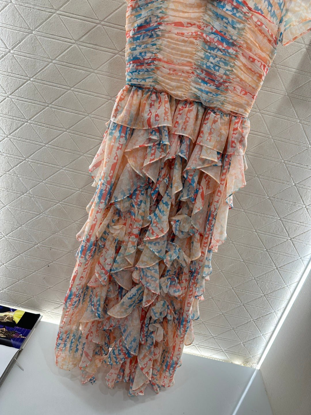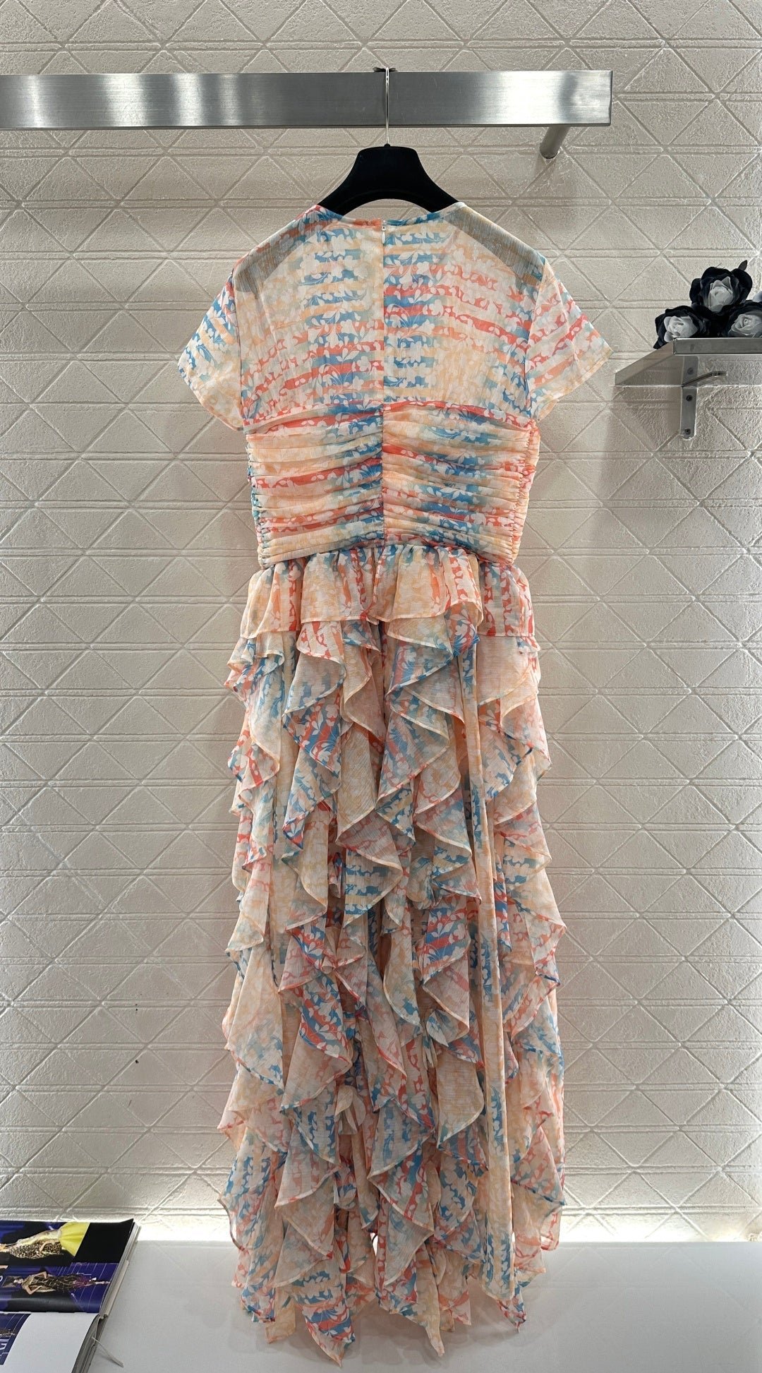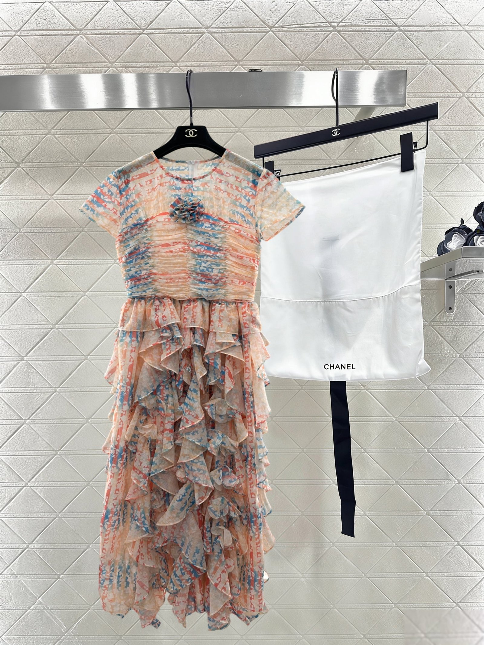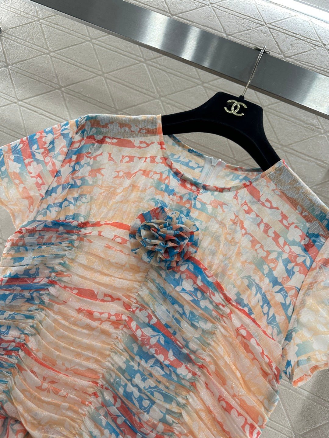 Made of silk yarn, this dress is lightweight, soft, and gentle on the skin. The round neck and short sleeves, combined with the watercolor-like floral print, exude romance itself! The pinkish-orange and light blue watercolor wash is gentle and dreamy. The pleated texture and layered ruffled hem create a graceful and ethereal look as you walk. The camellia embellishment on the chest is the perfect finishing touch, capturing the romance and sophistication of French elegance in every detail. Wearing this dress is like walking a spring painting! The horizontal pleats at the bust and waist accentuate the figure and flatter the hips, making it a perfect choice for an early spring vacation.