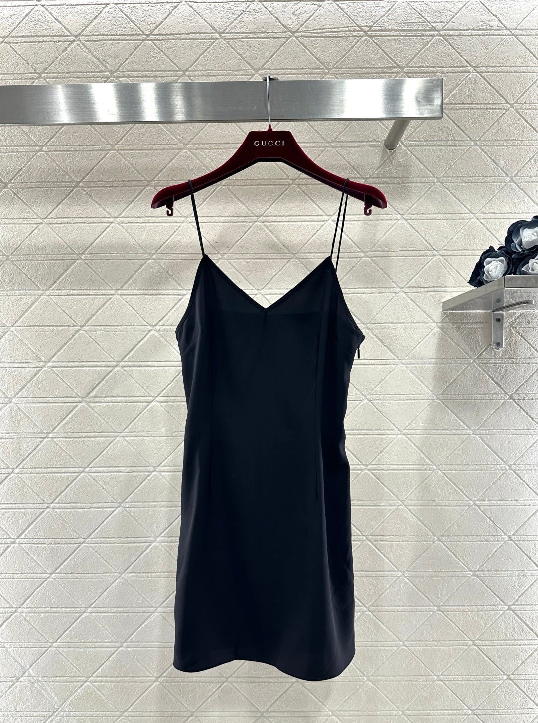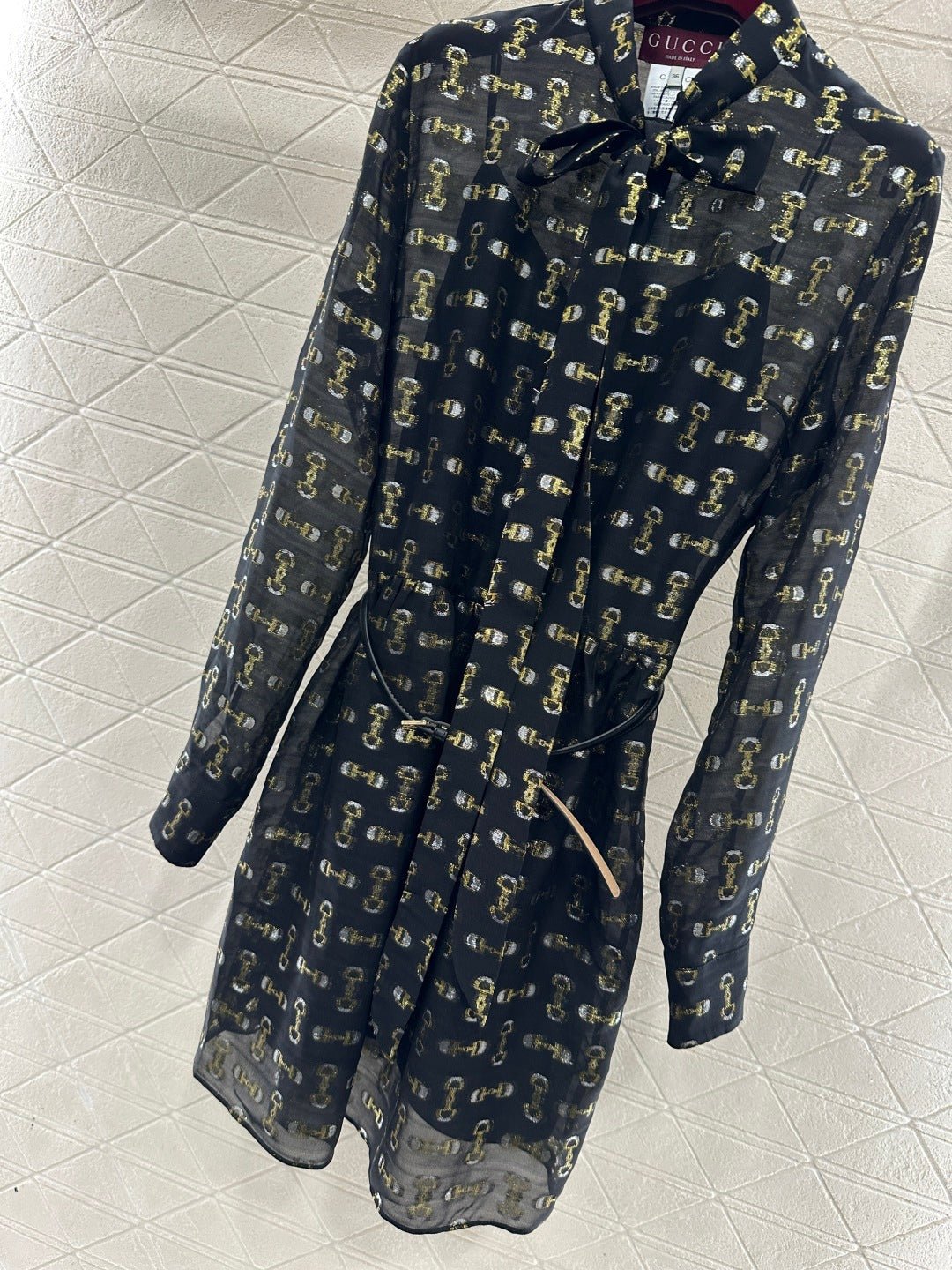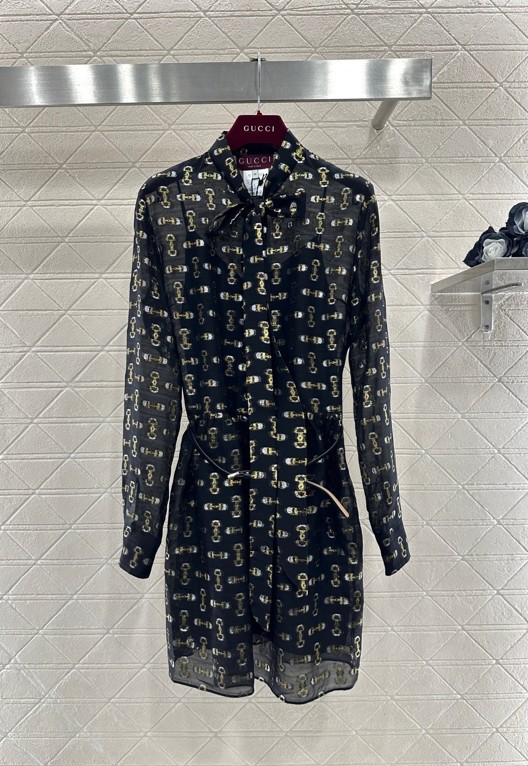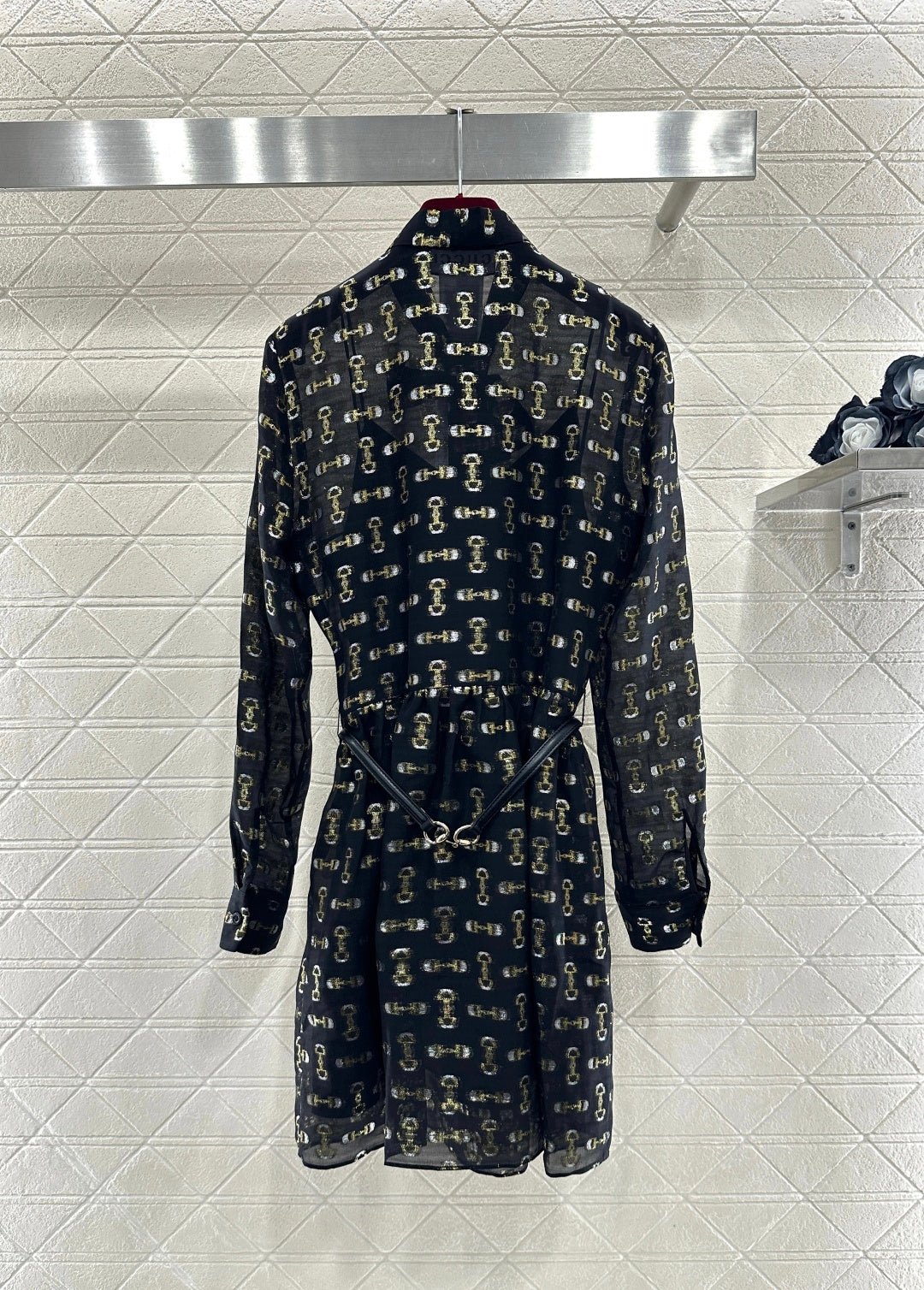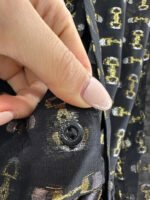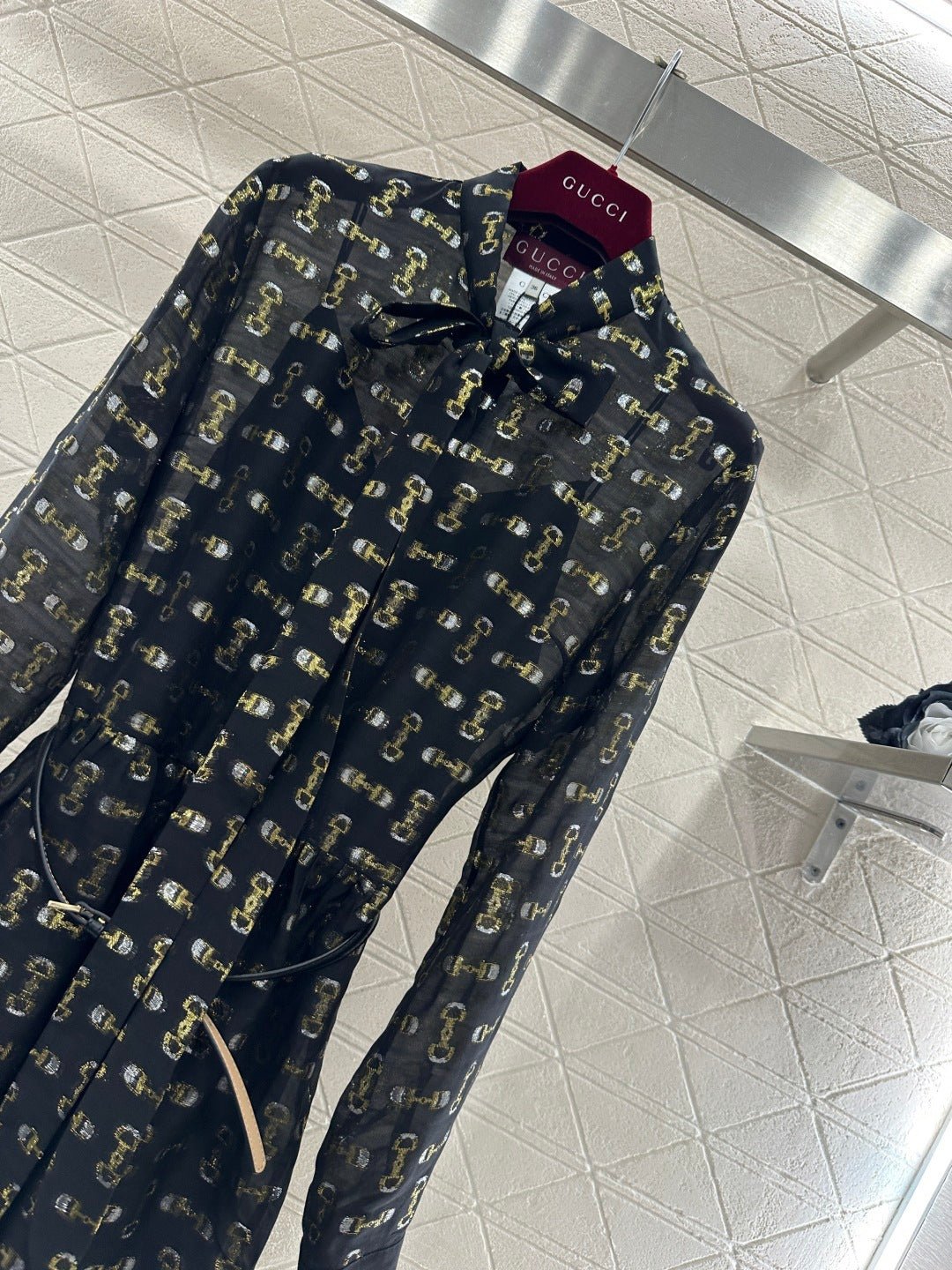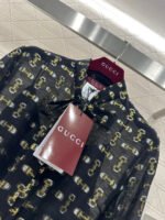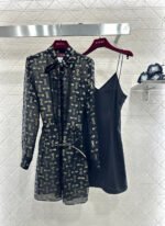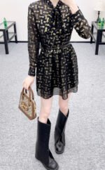 Made from 100% mulberry silk, this shirt dress boasts a lustrous texture and is comfortable against the skin. The black base with gold-embellished double-G jacquard lace covers the entire garment, creating a flowing silhouette. The lightweight silk fabric accentuates the dress’s graceful lines, while the bow tie at the neckline adds a touch of femininity. A thin belt at the waist effortlessly cinches the figure. The sheer texture creates a subtly alluring effect, making it perfect for a sophisticated date look or layered under a slip dress for a more layered style. It perfectly blends the brand’s vintage luxury with romantic flair, making it a striking piece in any wardrobe that combines design and ambiance.