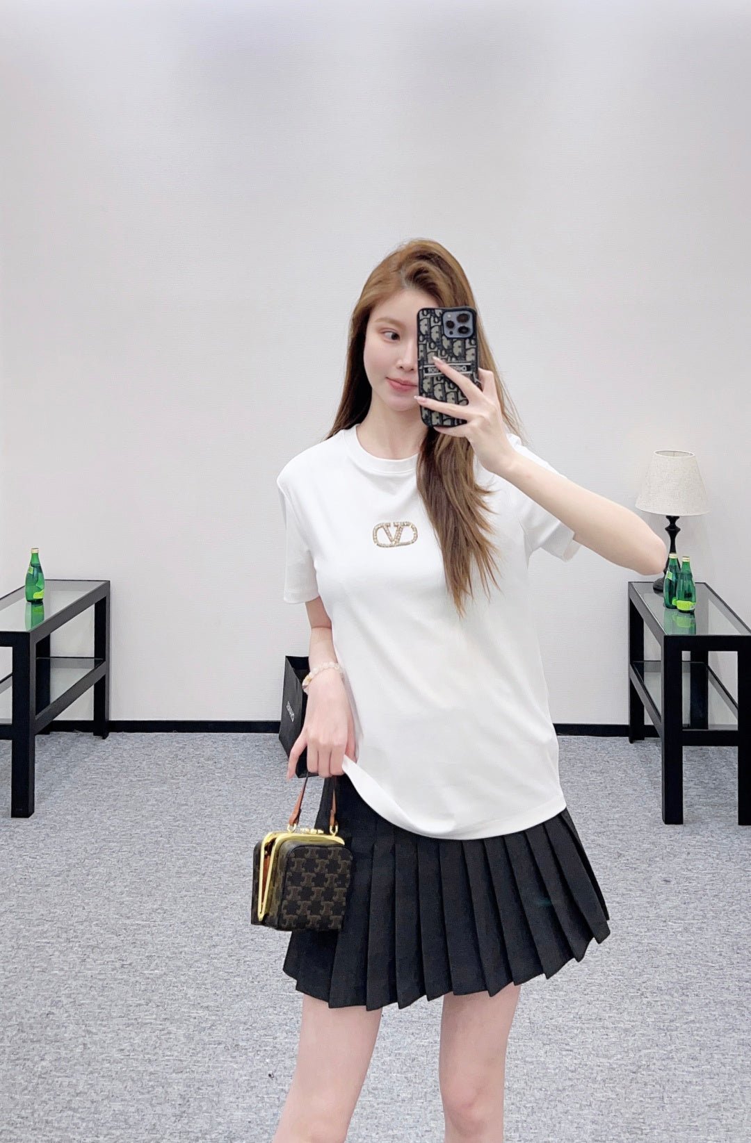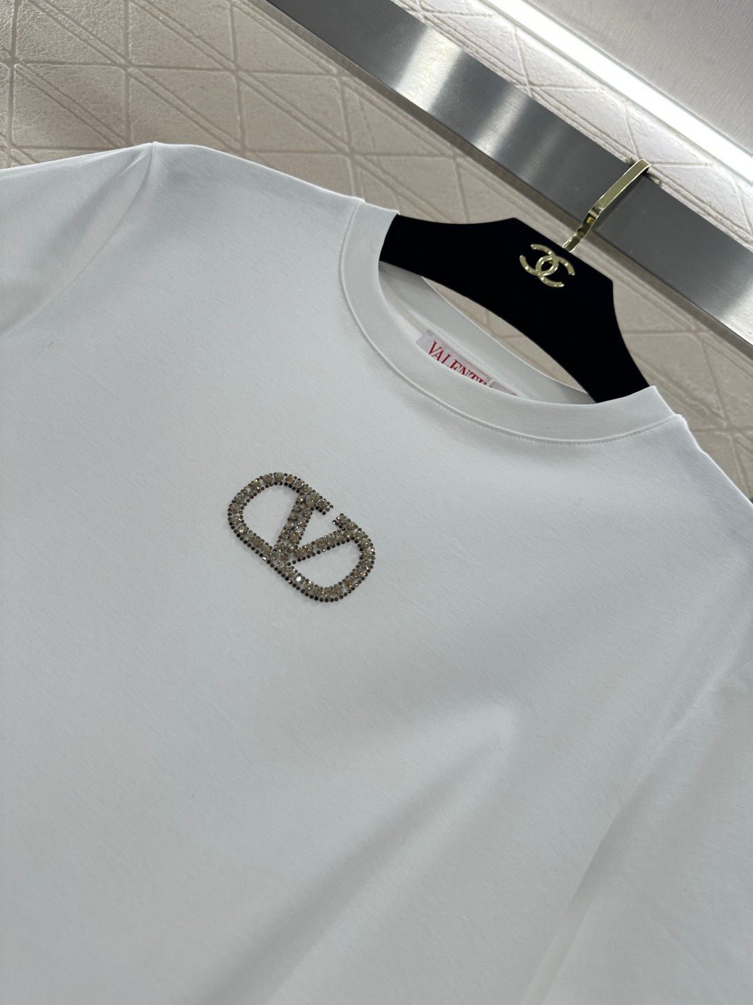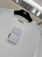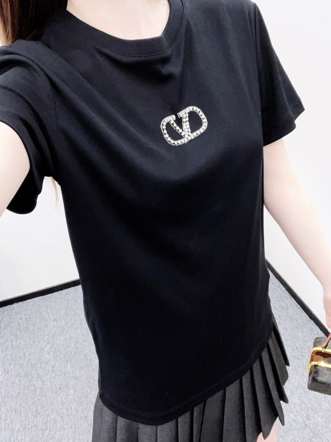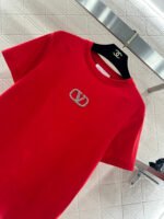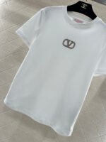 Made of mercerized cotton, this breathable and comfortable T-shirt boasts a premium feel. The classic short-sleeved design features embroidered details and is adorned with beaded zircon rhinestones to outline the letter V logo, creating a layered and stylish look. Available in versatile black, white, and red, it’s perfect for everyday wear and exudes a fashionable and chic vibe.