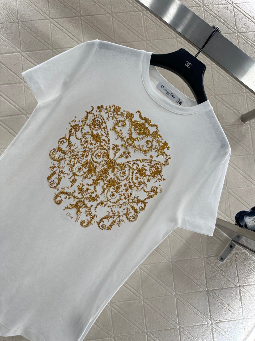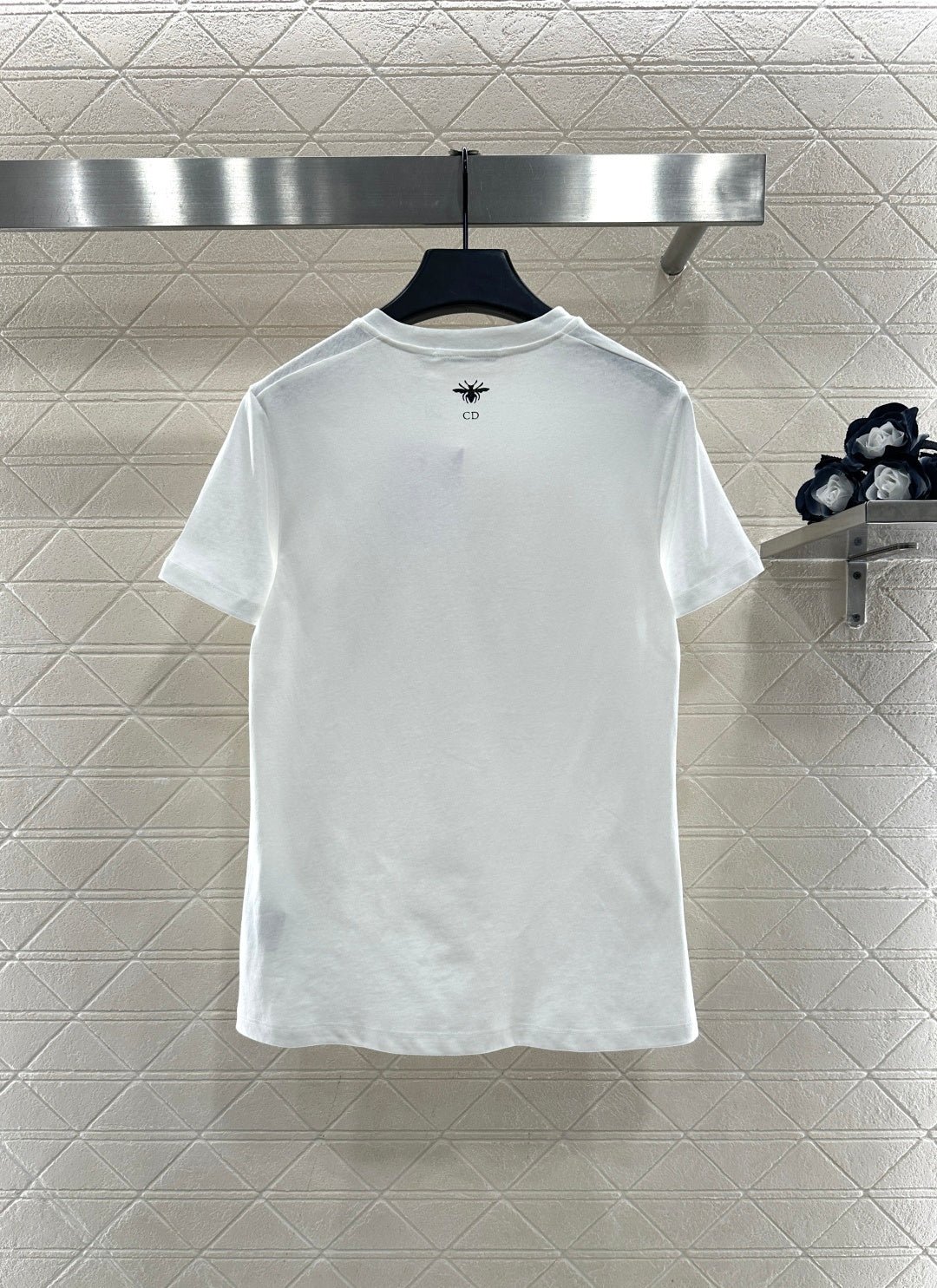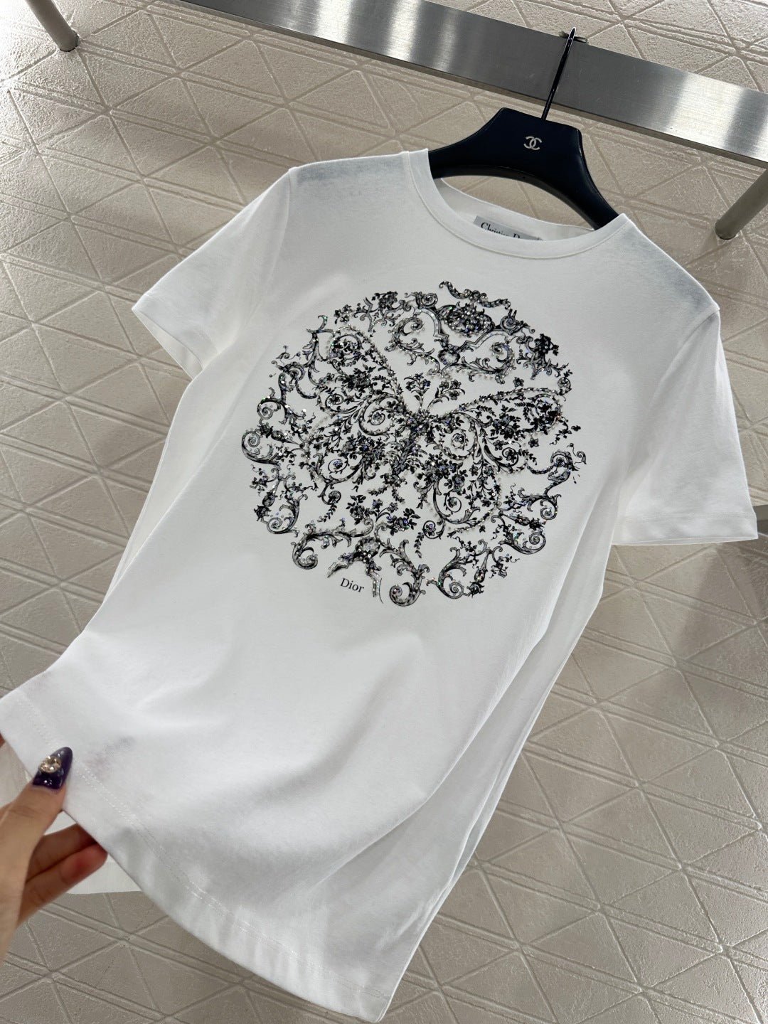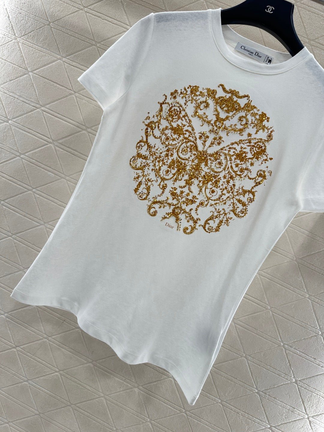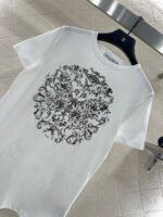 Made of mercerized cotton, this garment boasts a silky smooth texture and comfortable wear. The slim-fit short-sleeved design creates a flattering and stylish silhouette. The chest features a combination of printed and embroidered beaded details depicting vines and other botanical textures, ultimately forming a butterfly shape. This, along with the brand logo below, enhances brand recognition.