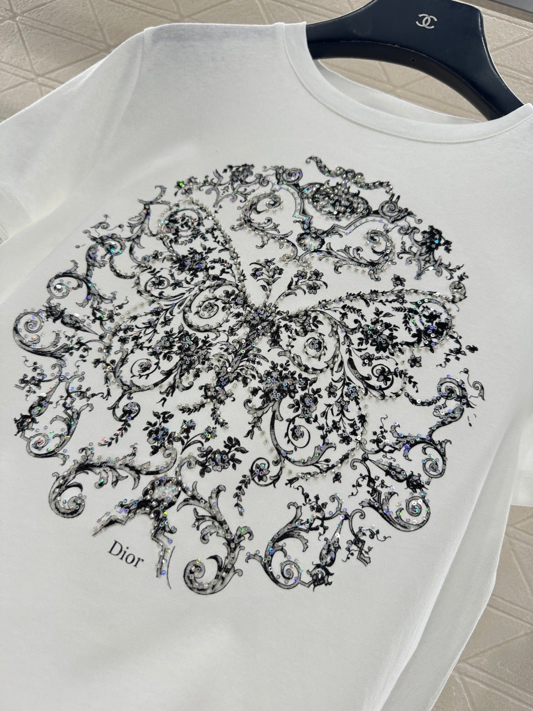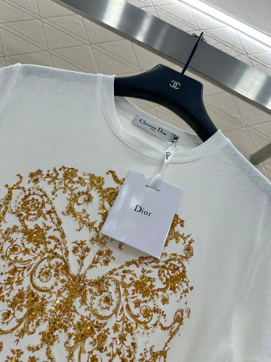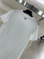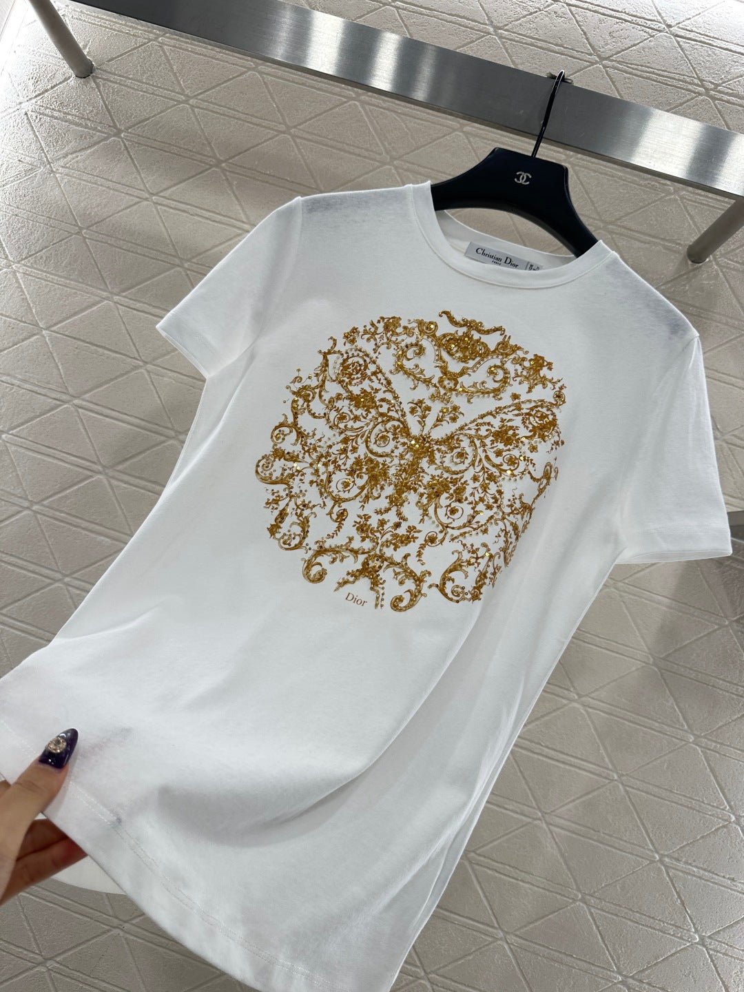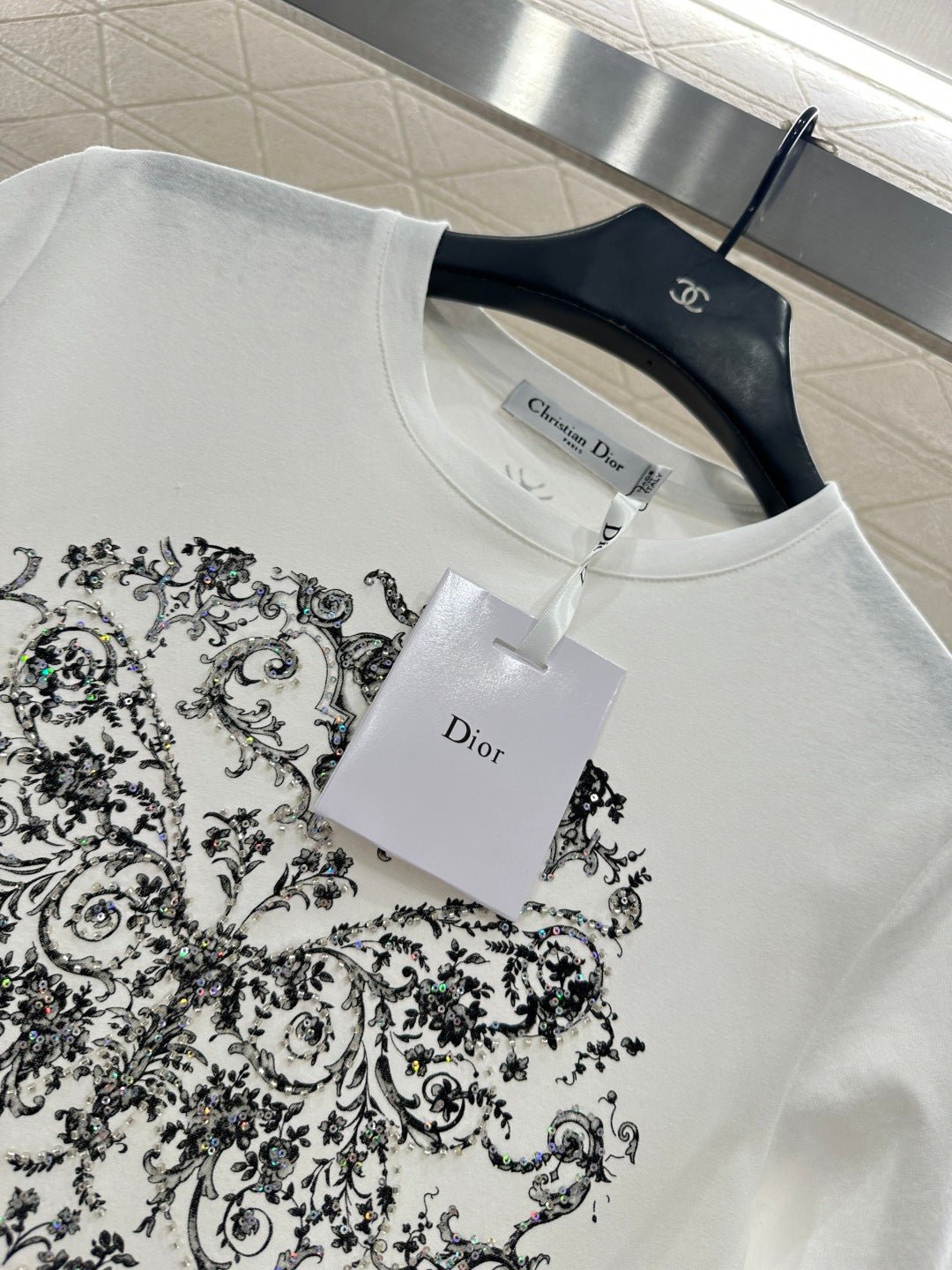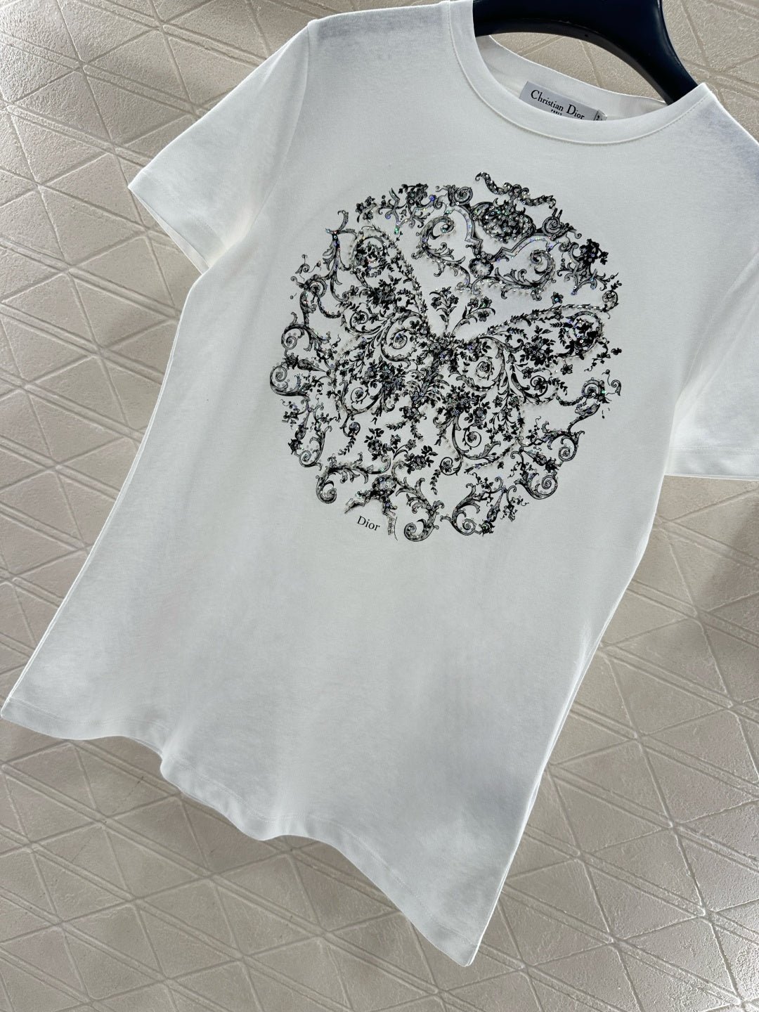Made of mercerized cotton, this garment boasts a silky smooth texture and comfortable wear. The slim-fit short-sleeved design creates a flattering and stylish silhouette. The chest features a combination of printed and embroidered beaded details depicting vines and other botanical textures, ultimately forming a butterfly shape. This, along with the brand logo below, enhances brand recognition.