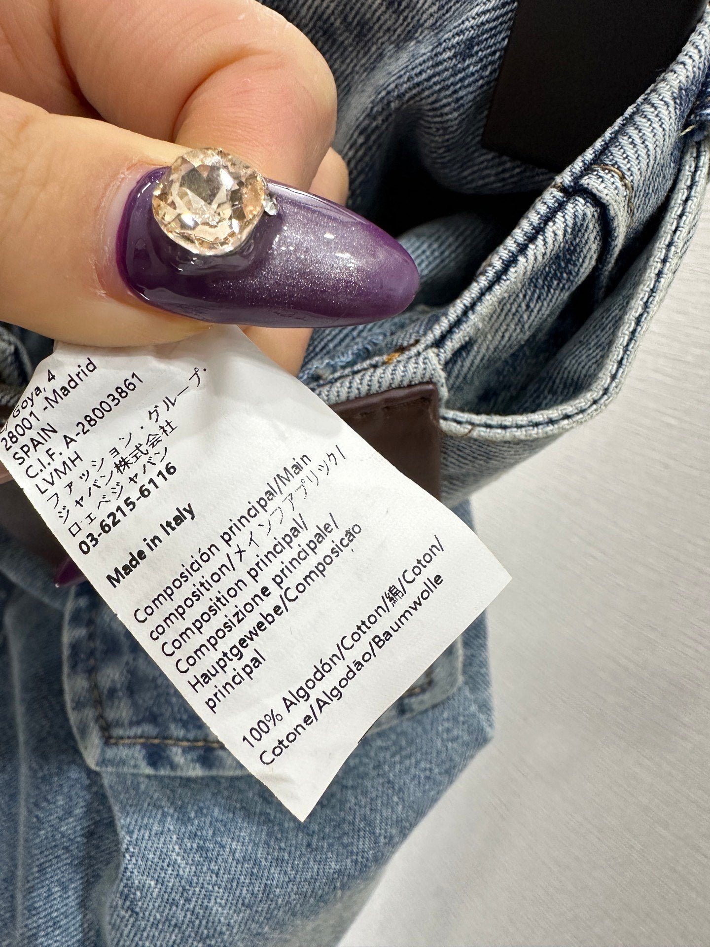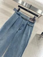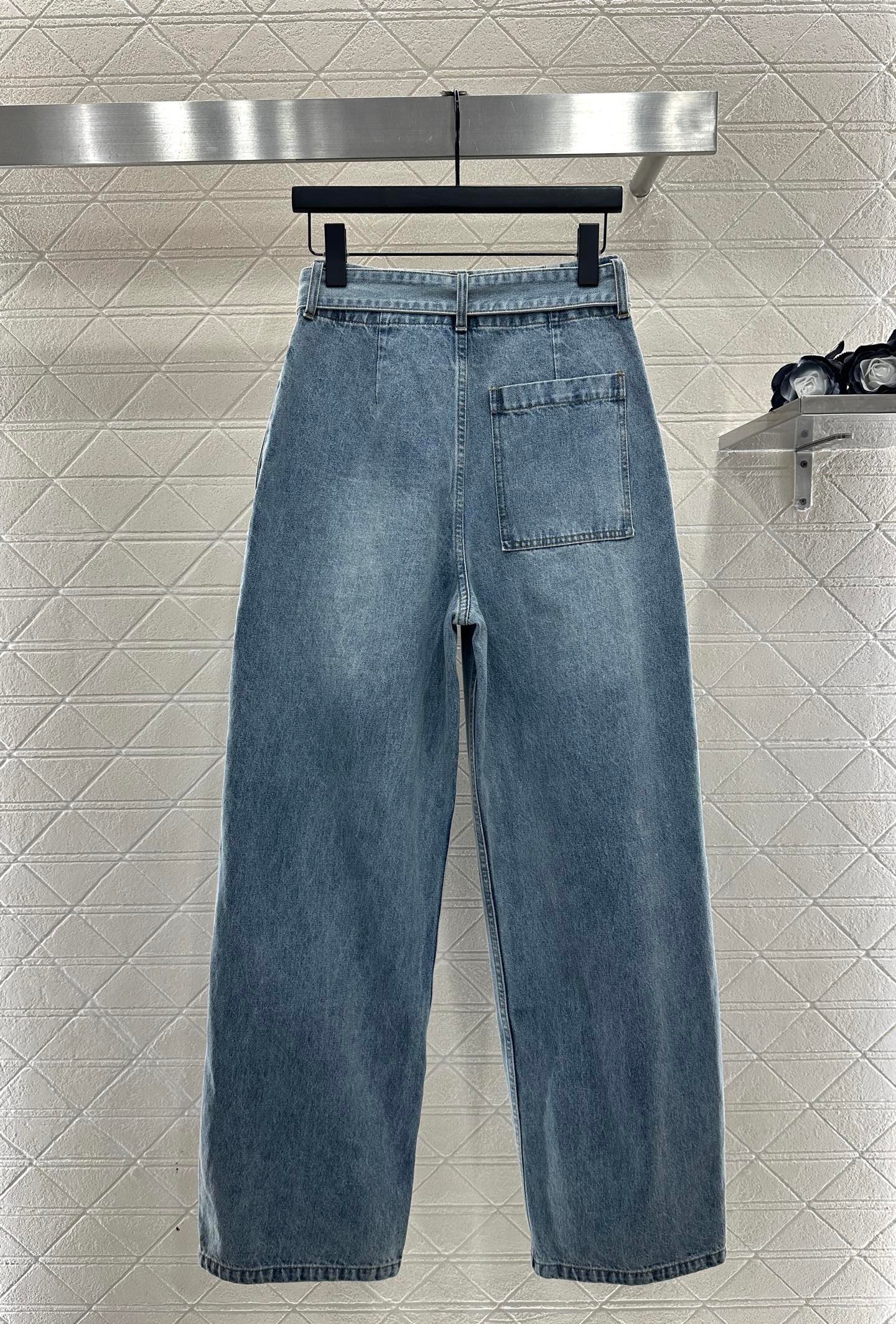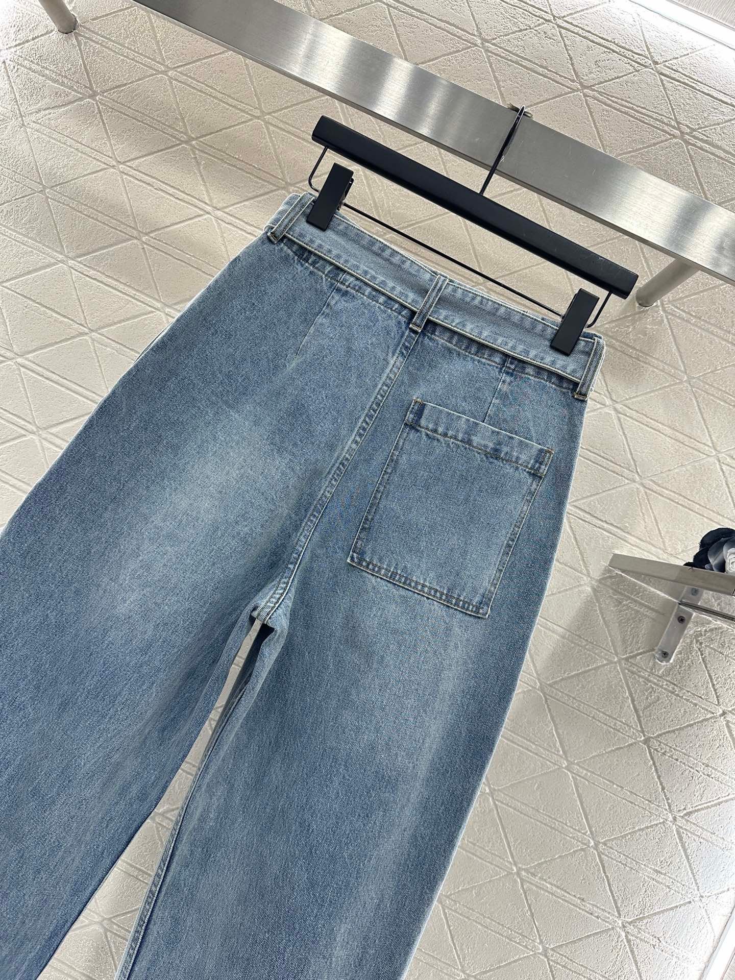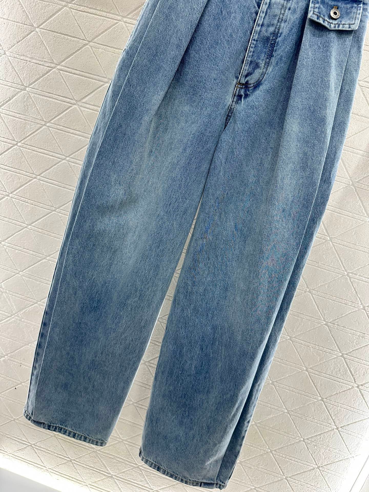 Denim cotton material, comfortable and breathable to wear, crisp and stylish, perforated waistband at the waist, matched with leather square logo and letter engraving, brand logo highlights tonality, pleated design at the waist and shoulder, flip pocket with rich layers of styling, fashionable and stylish, carrot pants with a wide top and a tapered bottom for slimming and slimming, showcasing trendy and fashionable style