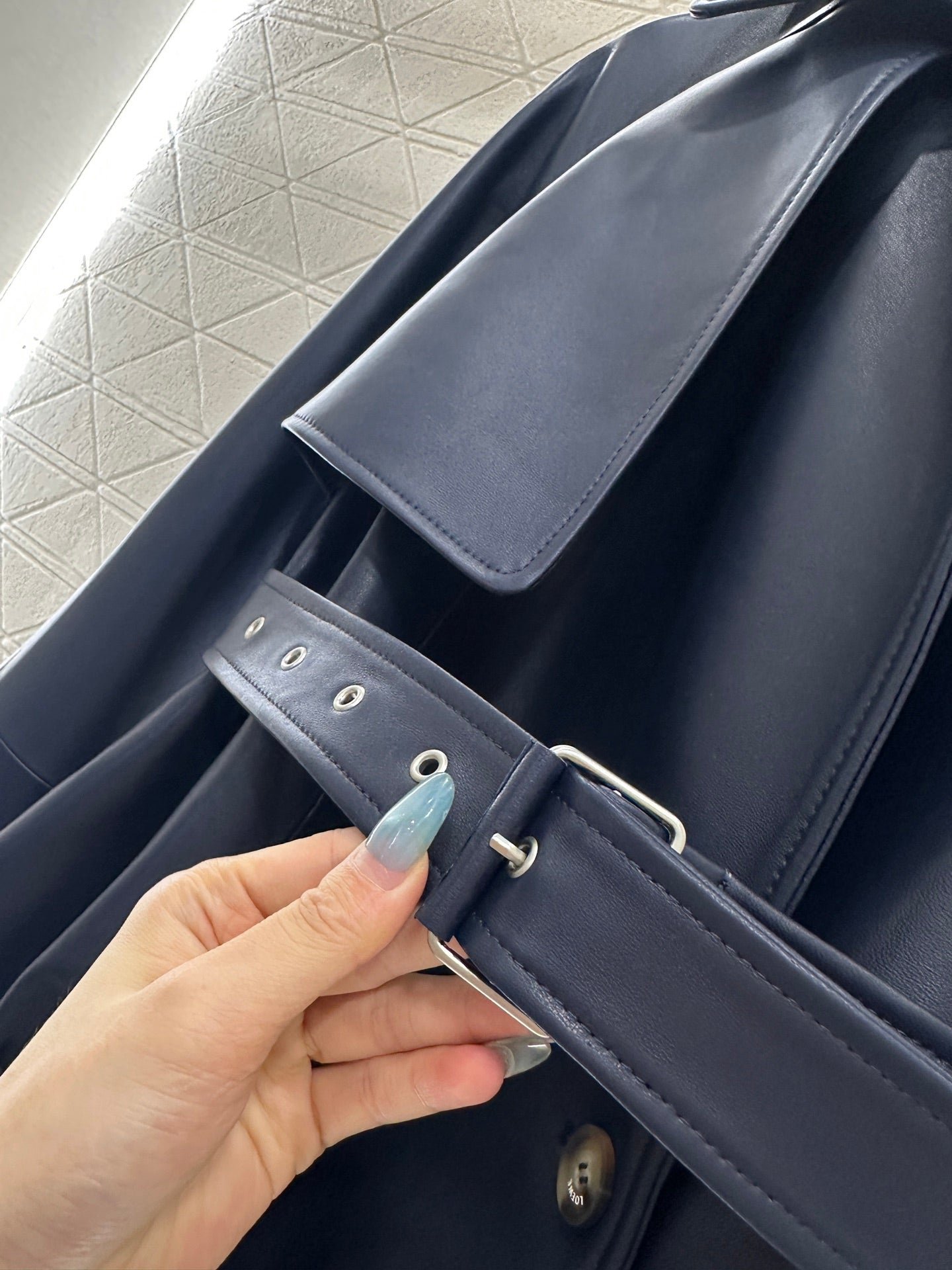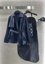 Made of 100% lambskin material with delicate luster, comfortable to wear. The shawl windbreaker jacket has a loose shoulder strap and button sleeve design, with a single-sided shawl integrated into it, creating a deconstructive style. The style is unique and stylish, with a perforated waist belt decorated with this fabric to outline the body shape, giving a strong sense of design. It is fashionable and relaxed for daily wear, and the open button is engraved with letters and logos to showcase style, suitable for different styles of wear.