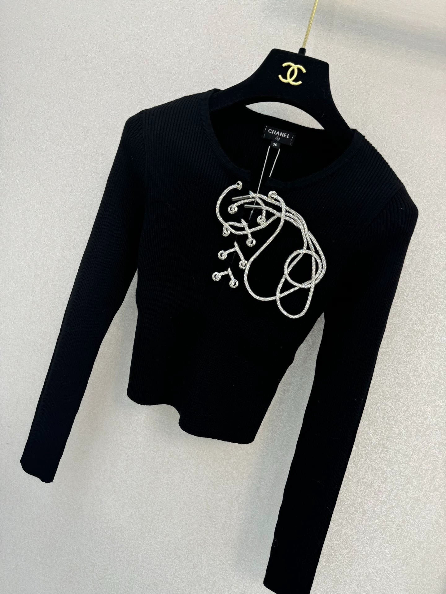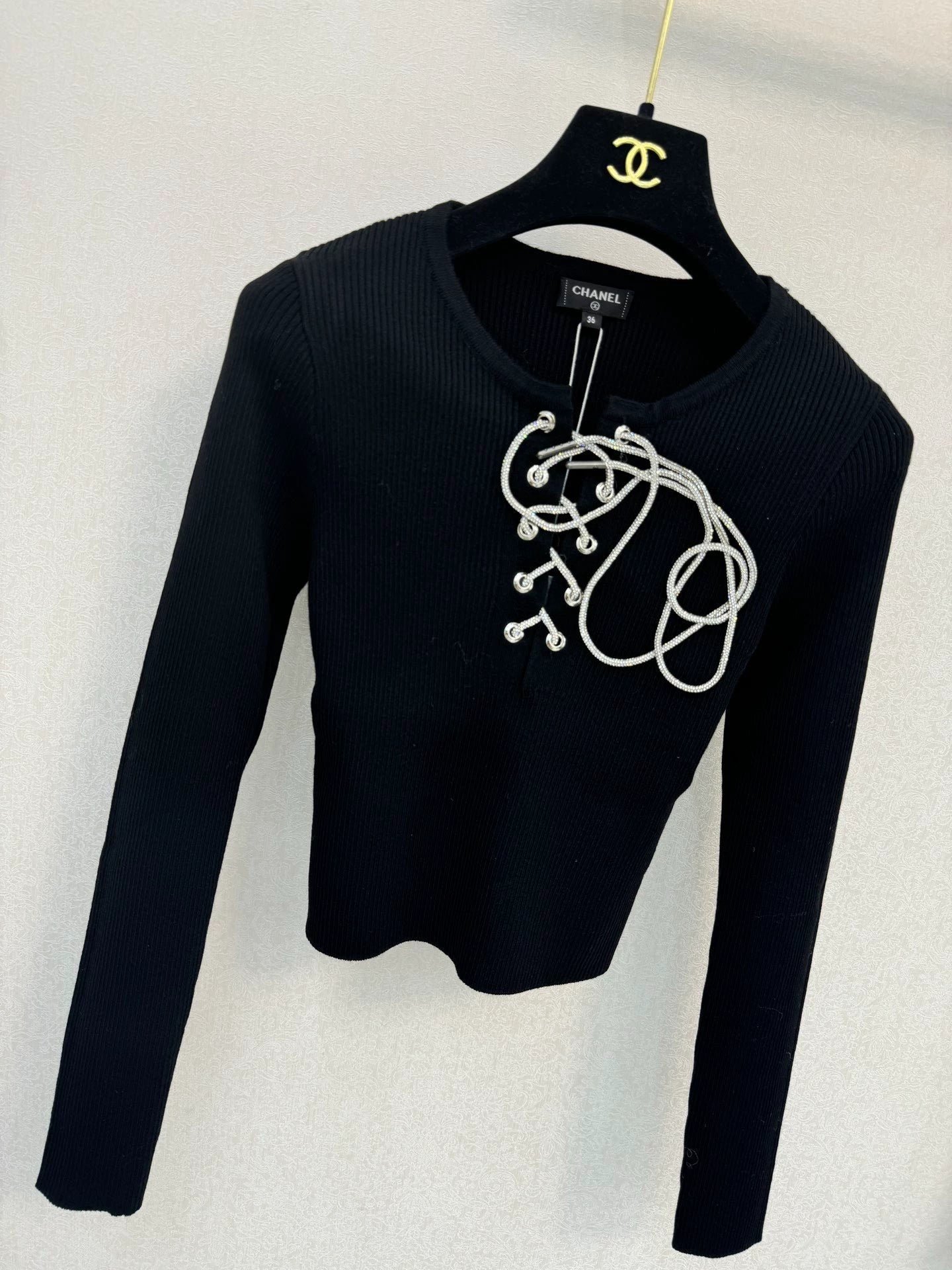 White metal strap decoration on the front, simple and elegant, paired with a round neck pullover style, slim and slimming.