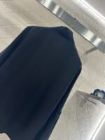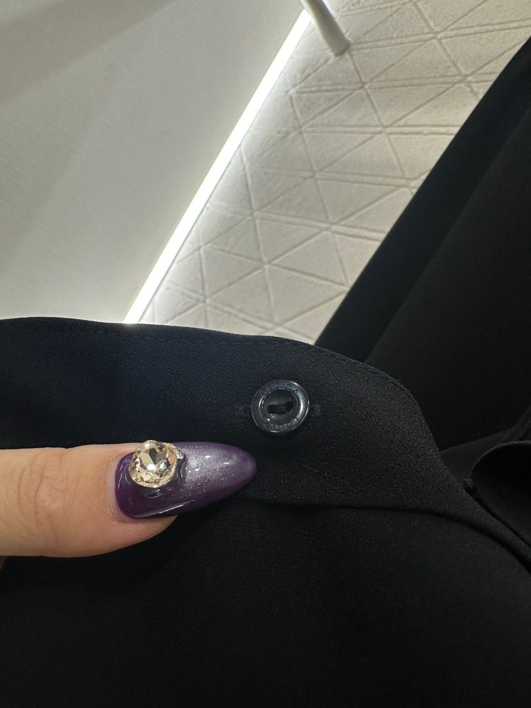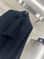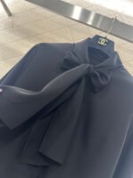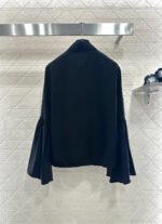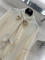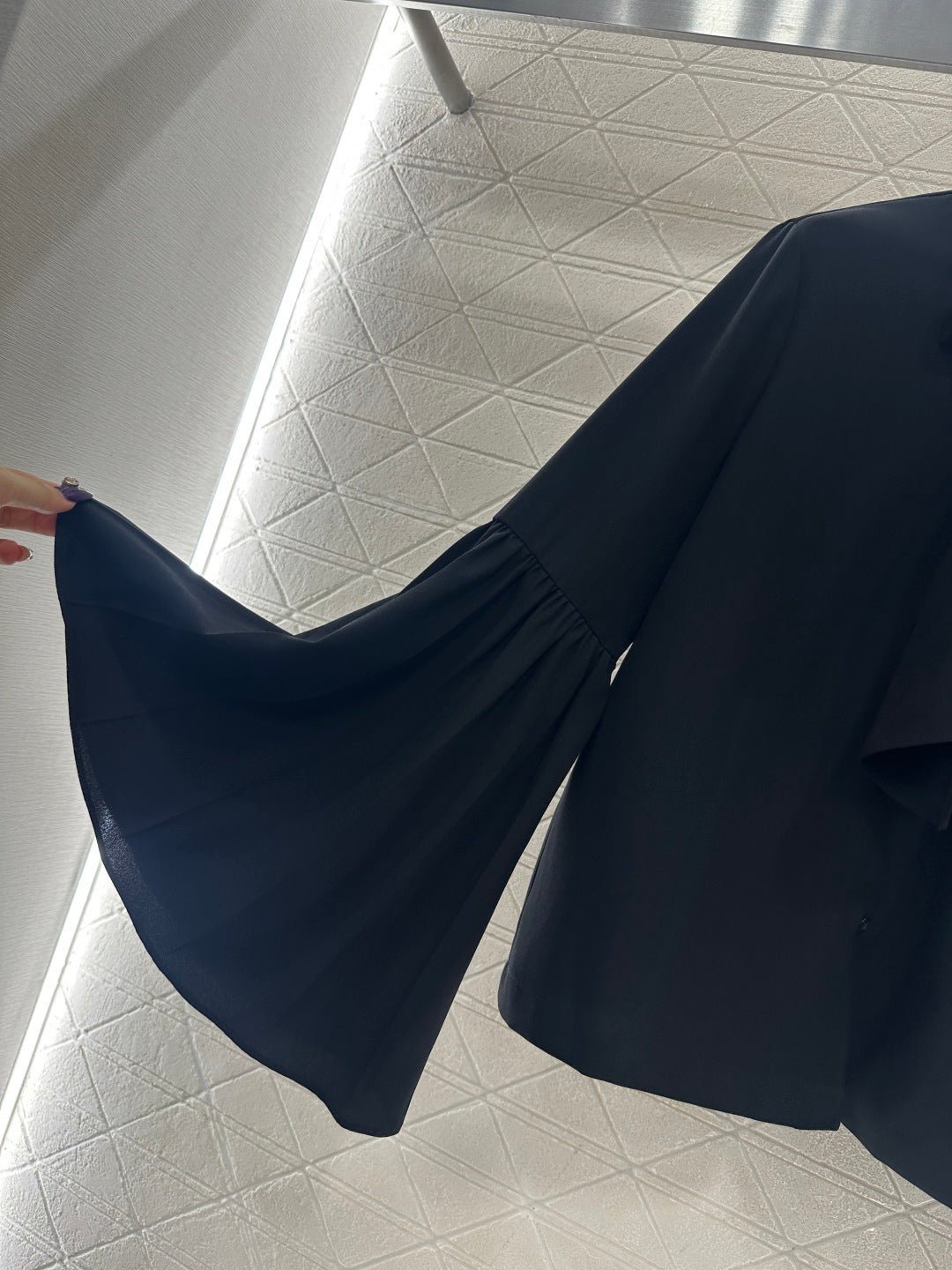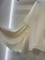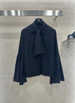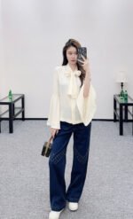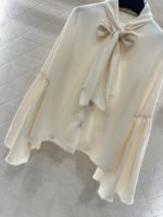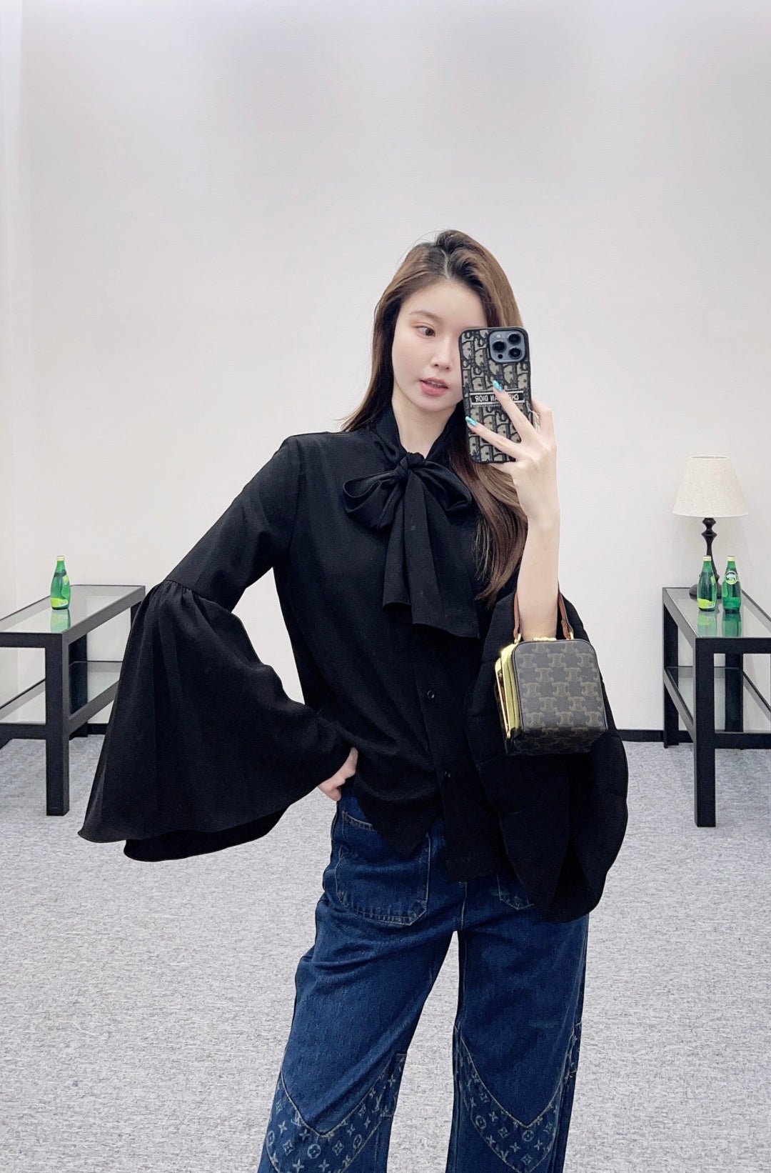 Thick twill material, glossy texture, comfortable drape, bow and ribbon shirt style. Loose straight tube silhouette, large body solid color shoulder design, combined with flared wide sleeves extending from the forearm, easily showcasing a fashionable temperament. European style luxury creates highlights, making outfits full of relaxed style without losing elegance