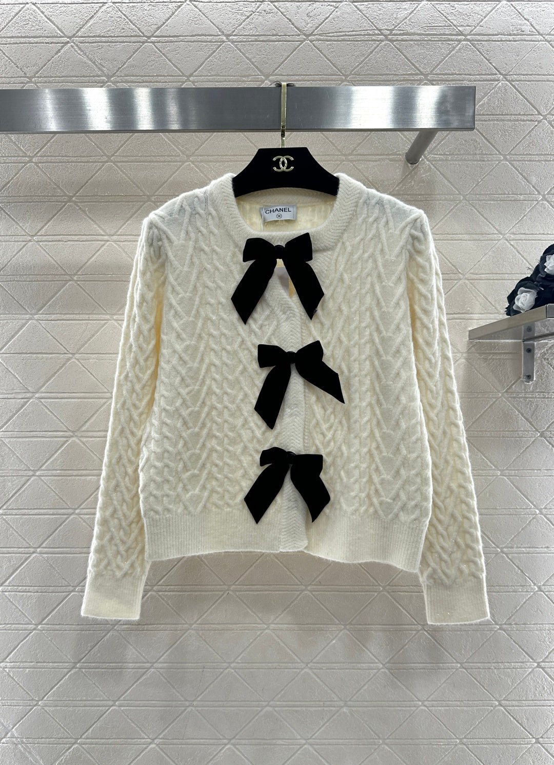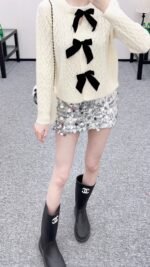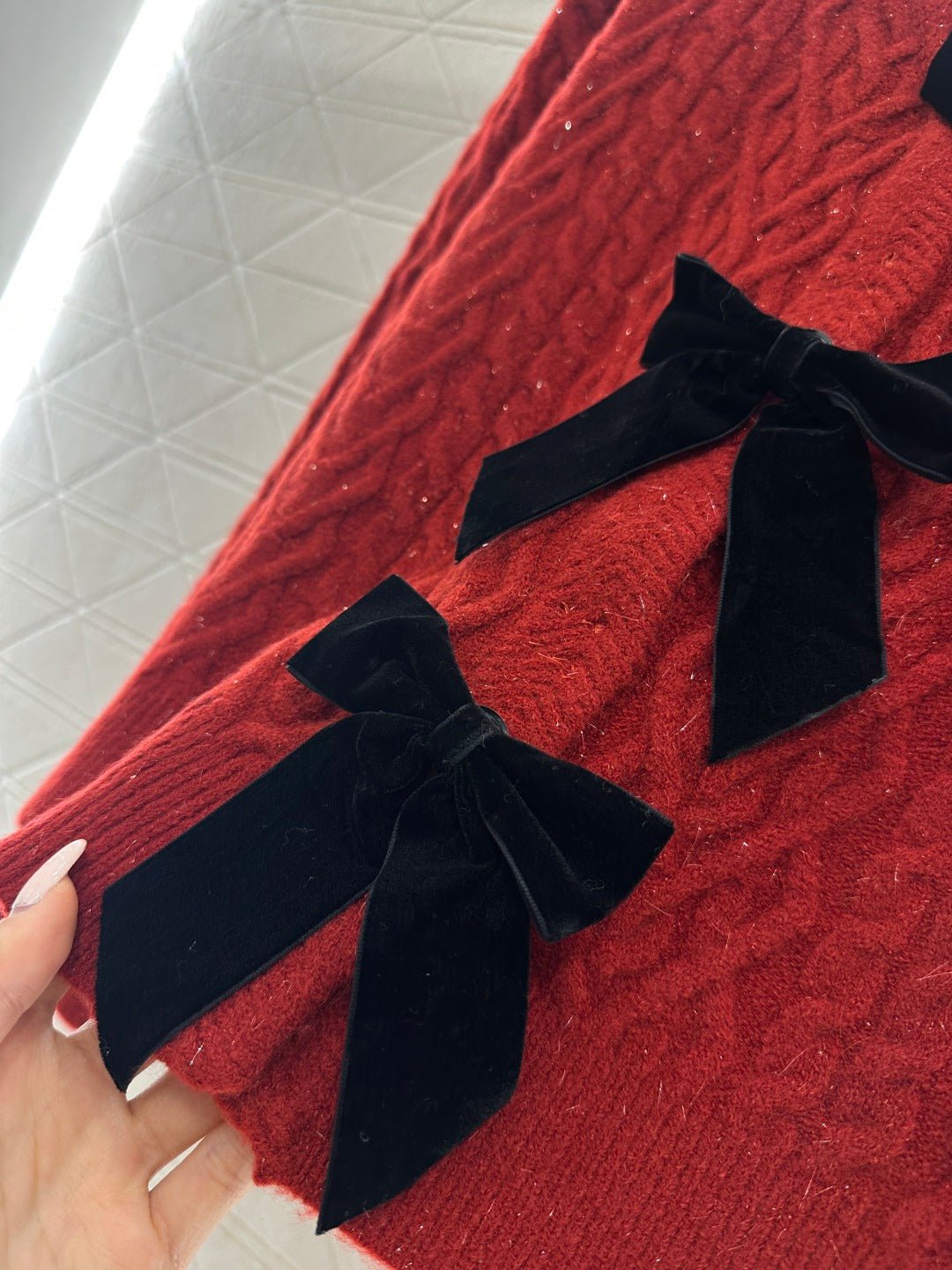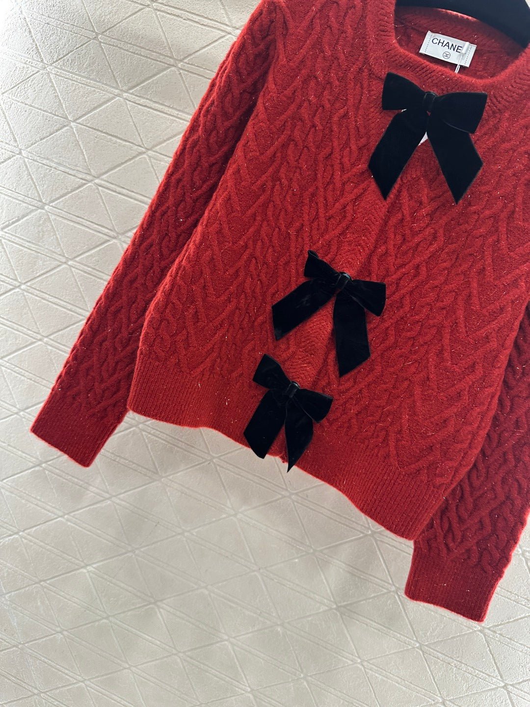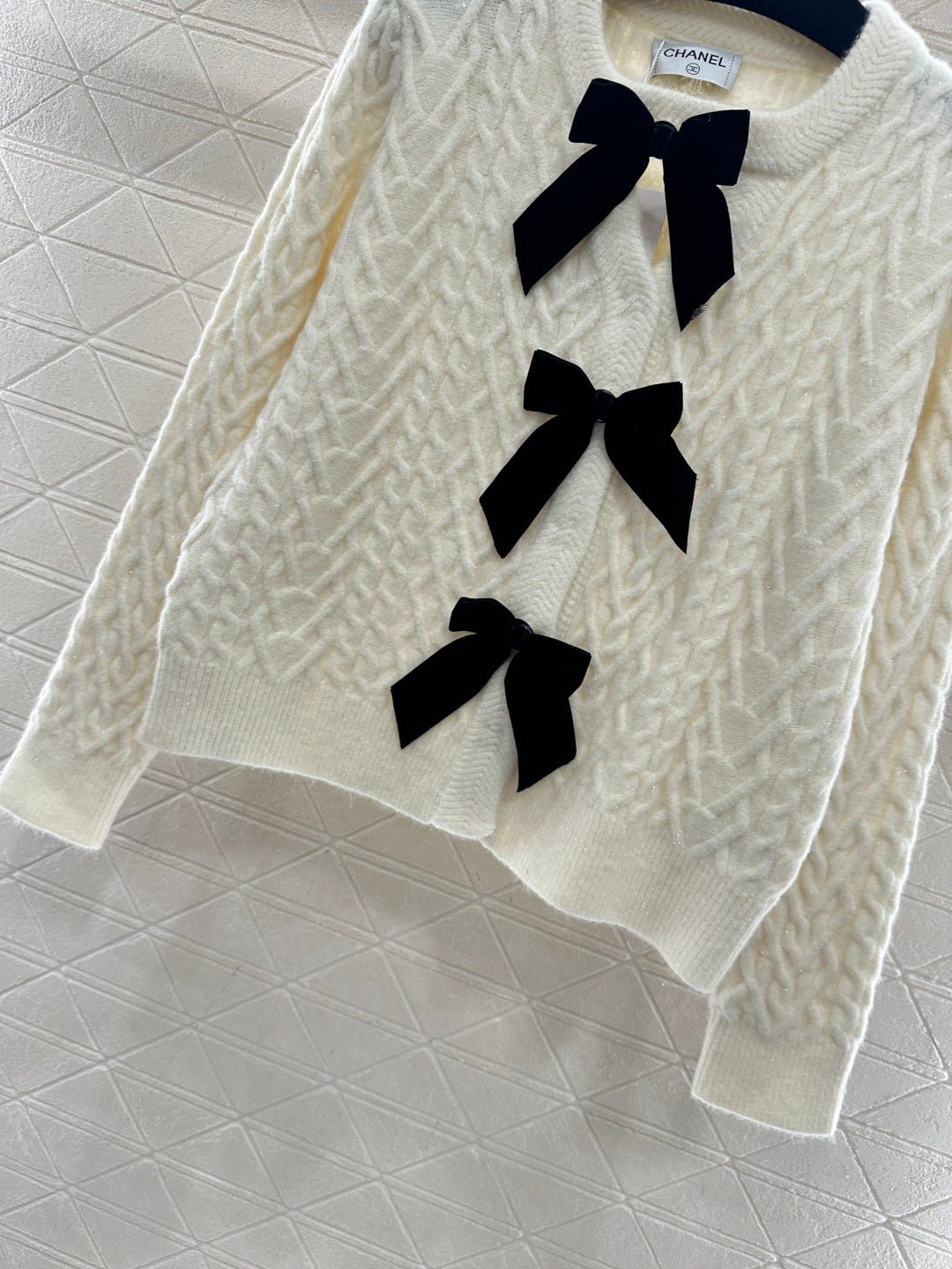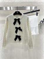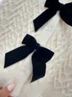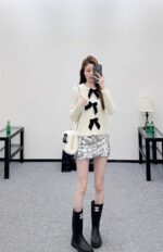 Crafted from wool yarn, this cardigan boasts a delicate texture and comfortable wear. The bow-tie design perfectly embodies a sweet French style! The off-white is gentle and pure, while the burgundy is rich and flattering. The three-dimensional cable knit texture adds a touch of sophistication, and the black velvet bow embellishments add a sweet and energetic yet refined touch. The soft, comfortable wool fabric feels great against the skin, and the regular fit is both flattering and casual. Whether layered under a camisole or worn alone, it effortlessly creates an elegant and sweet sophisticated look – a true wardrobe treasure.