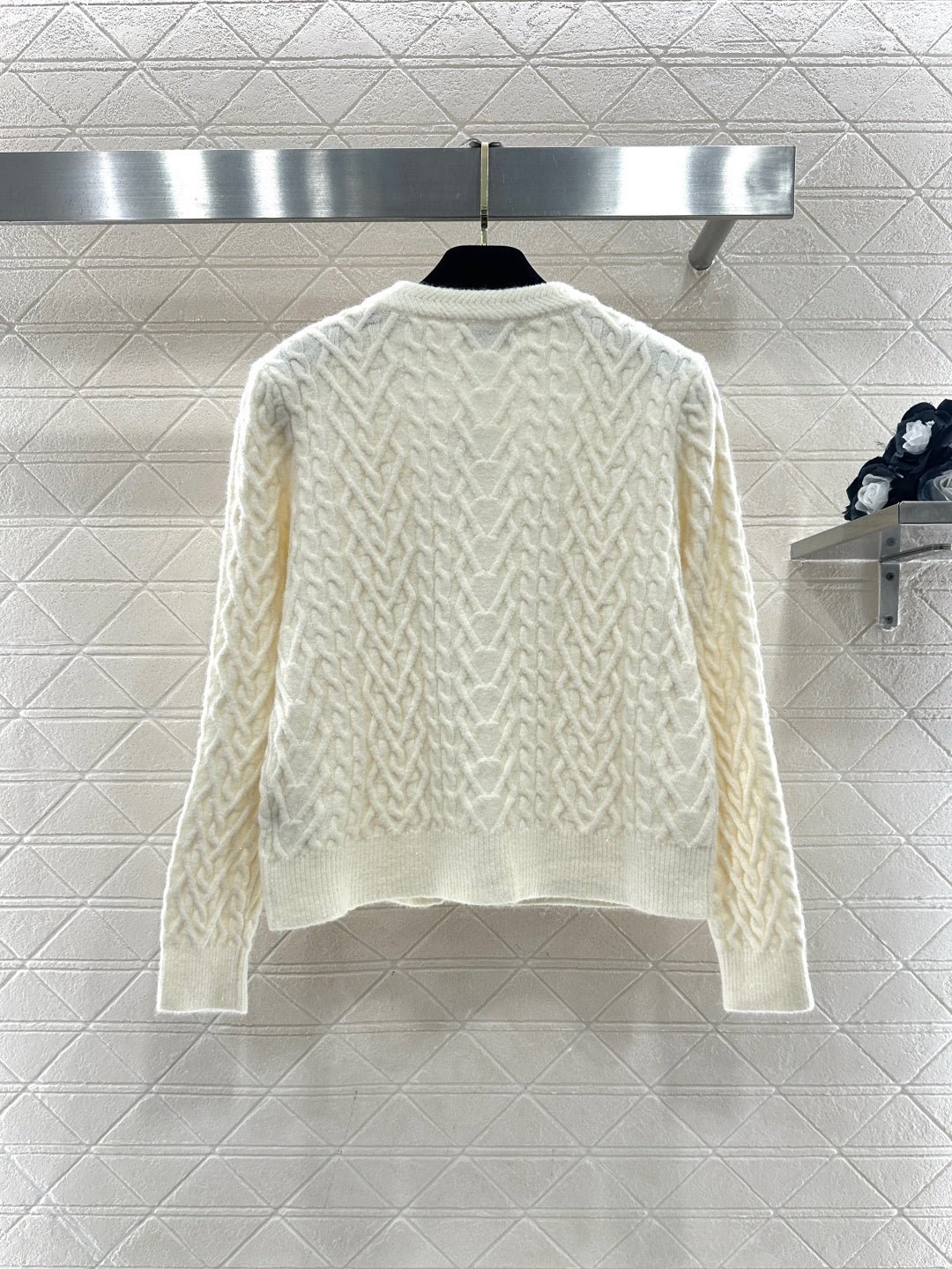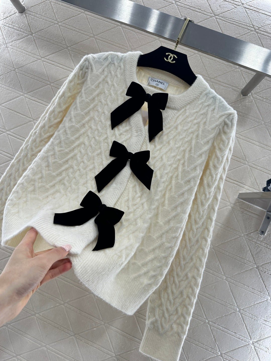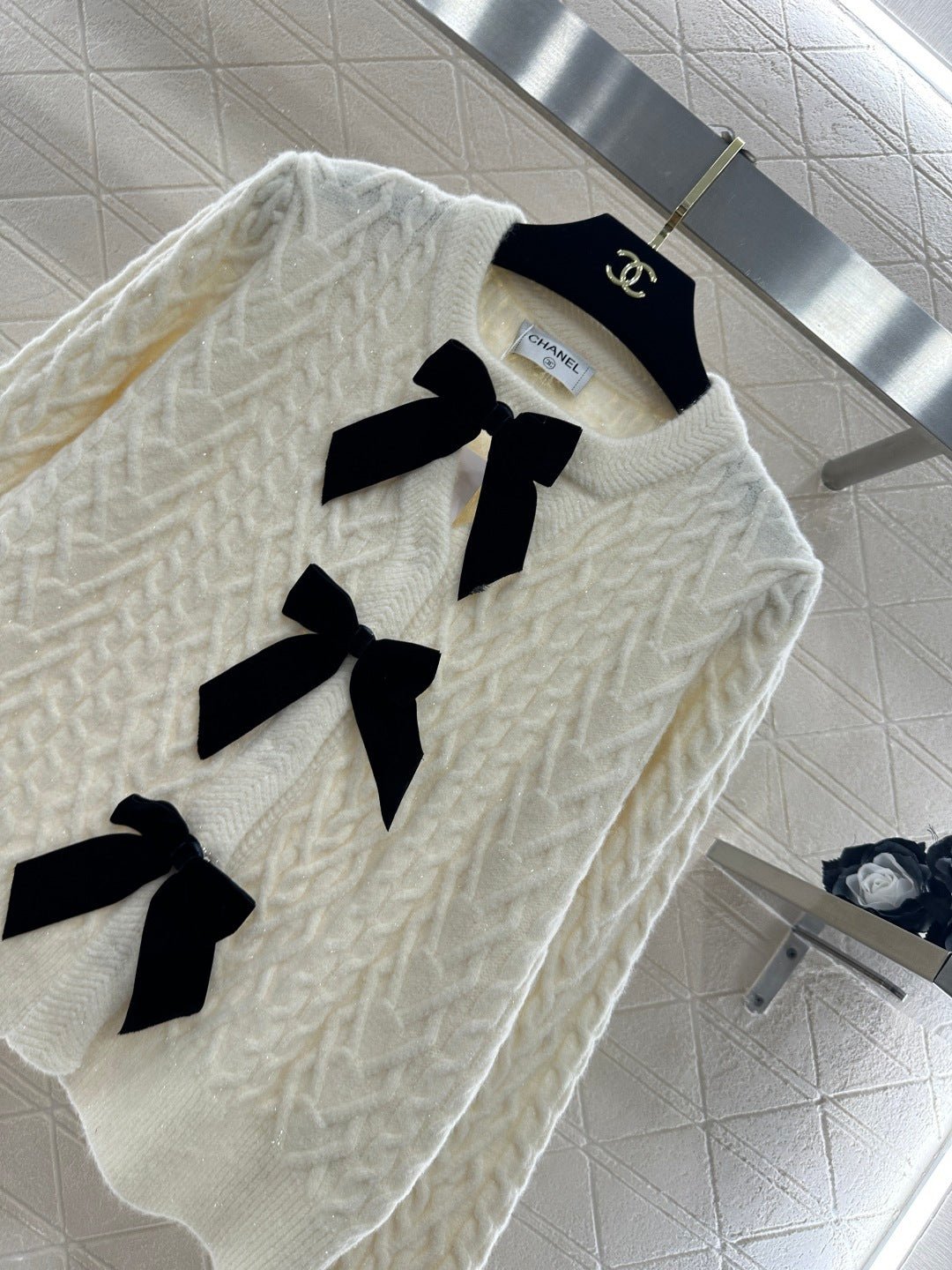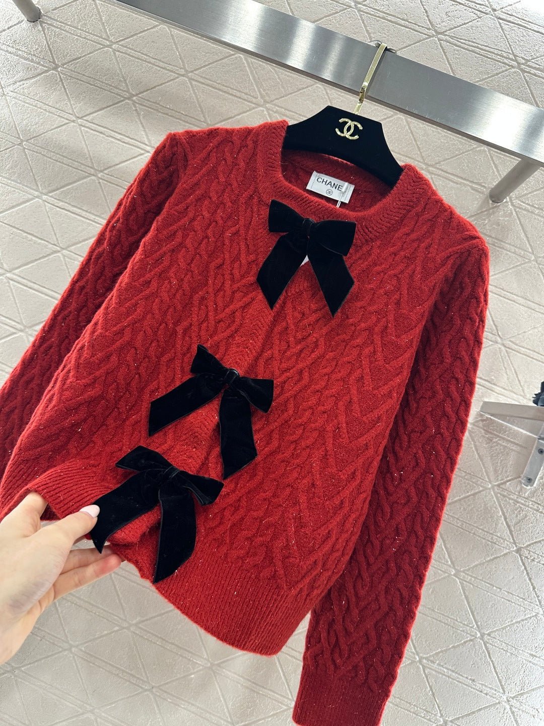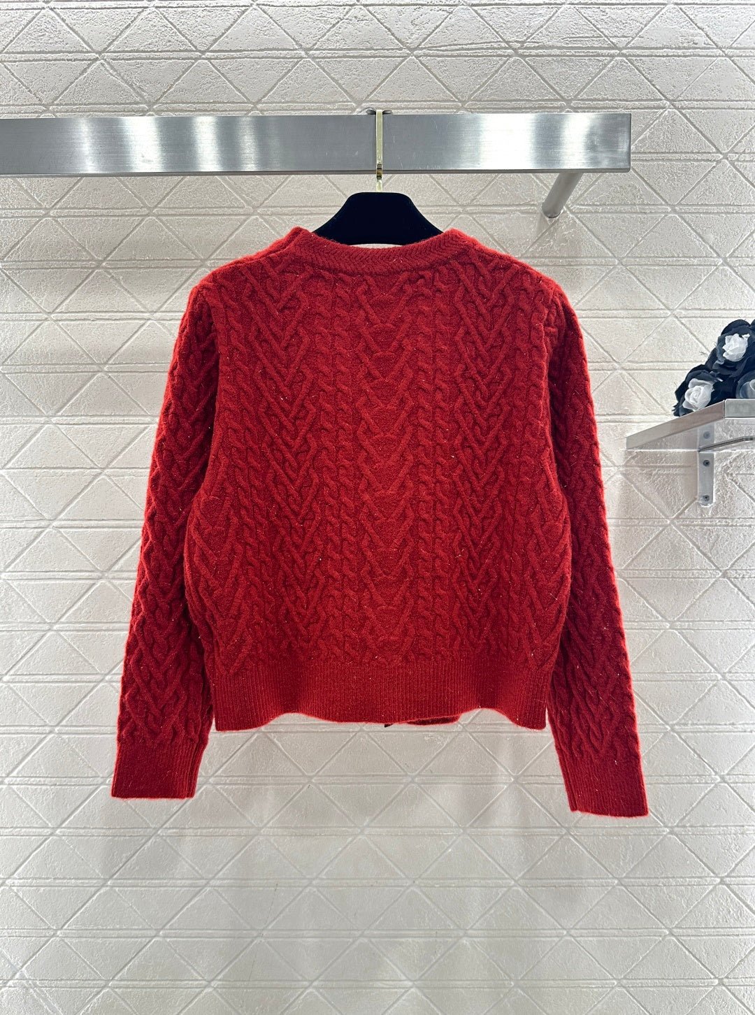 Crafted from wool yarn, this cardigan boasts a delicate texture and comfortable wear. The bow-tie design perfectly embodies a sweet French style! The off-white is gentle and pure, while the burgundy is rich and flattering. The three-dimensional cable knit texture adds a touch of sophistication, and the black velvet bow embellishments add a sweet and energetic yet refined touch. The soft, comfortable wool fabric feels great against the skin, and the regular fit is both flattering and casual. Whether layered under a camisole or worn alone, it effortlessly creates an elegant and sweet sophisticated look – a true wardrobe treasure.