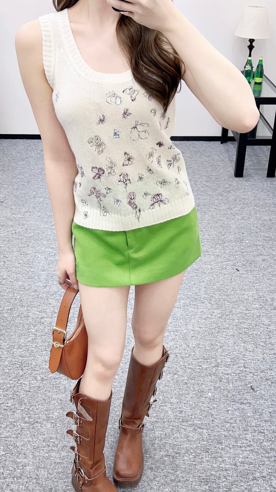 Crafted from silk and wool yarn, this vest boasts a luxurious feel, offering exceptional comfort and softness. The round neck design and delicate plain knit stitching, along with the ribbed edging throughout, subtly highlight its exquisite details. A butterfly motif adorns the entire garment, distributed in a balanced pattern from one shoulder downwards. Colorful thread embroidery creates a romantic and gentle natural forest-inspired atmosphere, lifelike and refined, exuding elegance and sophistication.