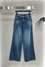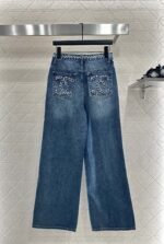 Twill cotton denim material with excellent breathability, soft and skin friendly high waistband buckle, symmetrical pocket, long pants cut, multiple enzyme washing process to create denim blue and polished white wrinkle traces, retro and fashionable, matched with waist woven pattern rope and double C logo on the back hip to increase the sense of style, highlight the style, and highlight the casual temperament