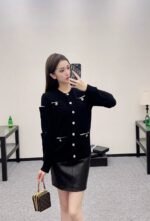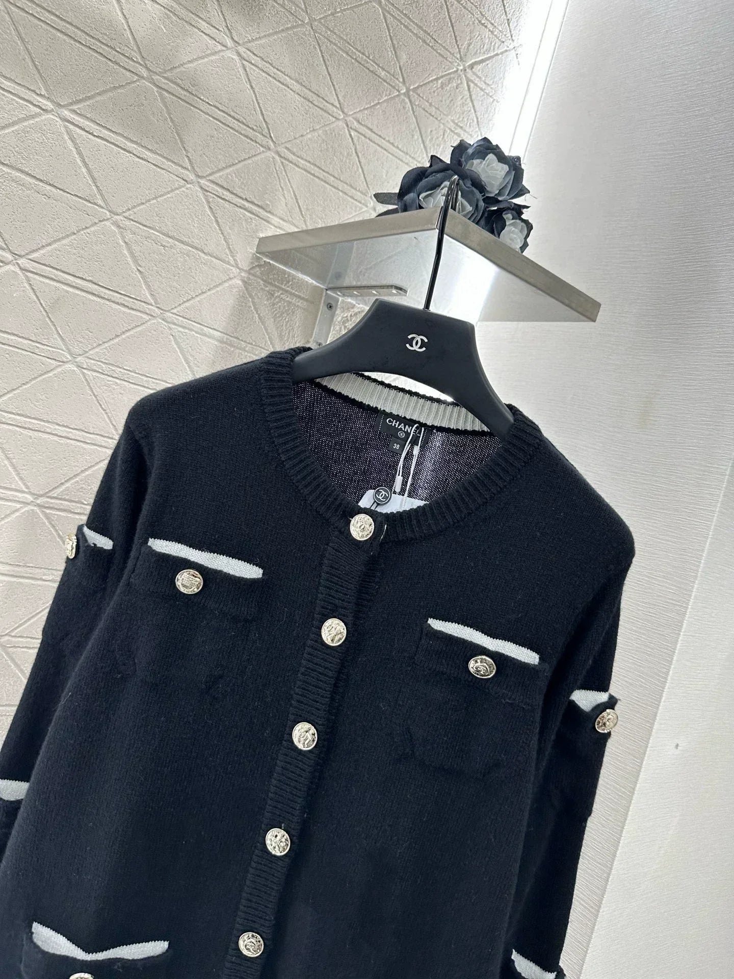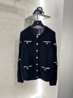 Crafted from custom YB cashmere yarn for a luxurious and comfortable feel, this round-neck, long-sleeved cardigan offers just the right amount of skin coverage for a slimming and elegant look. Contrast-colored binding on the inside of the pocket edges. Multiple pockets throughout the front and sleeves, embellished with molded round buttons for a rich visual effect. This top exudes a touch of effortless luxury and chic. Perfect for wearing alone or layering. A perfect choice for fall and winter fashion. Custom fabrics and accessories. Look for the latest version.