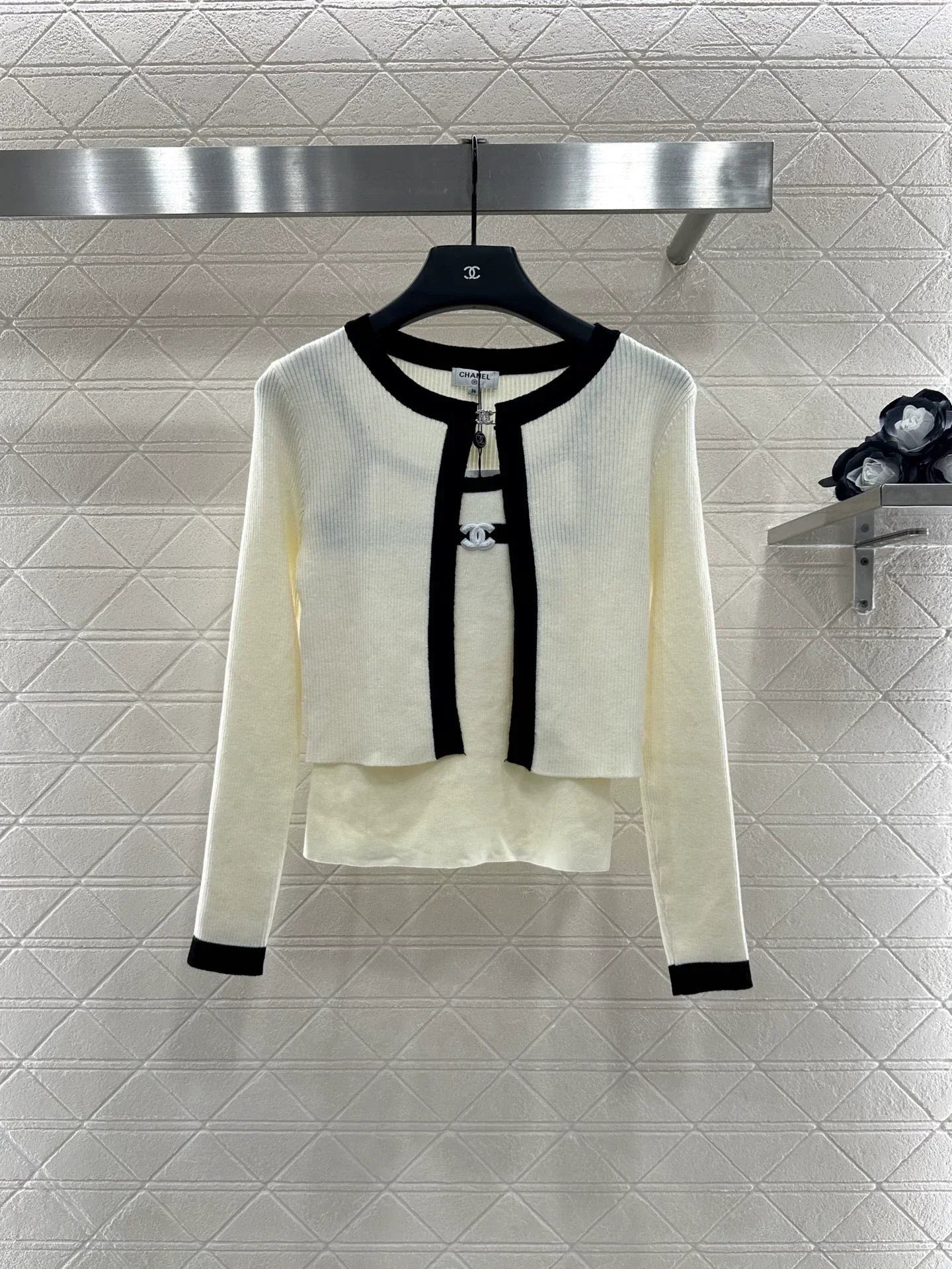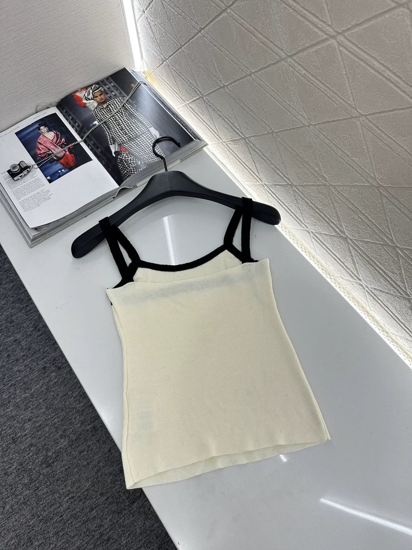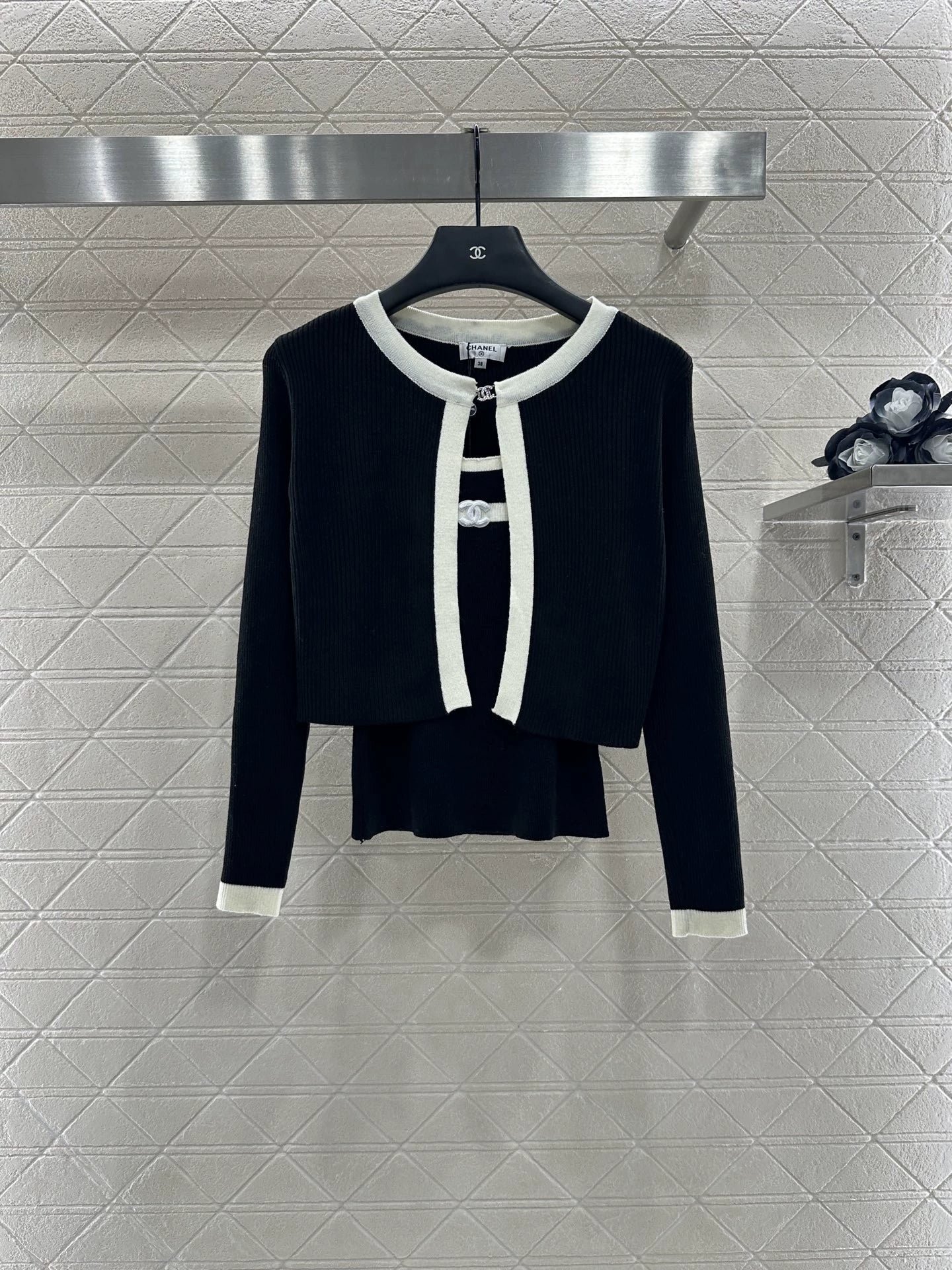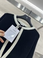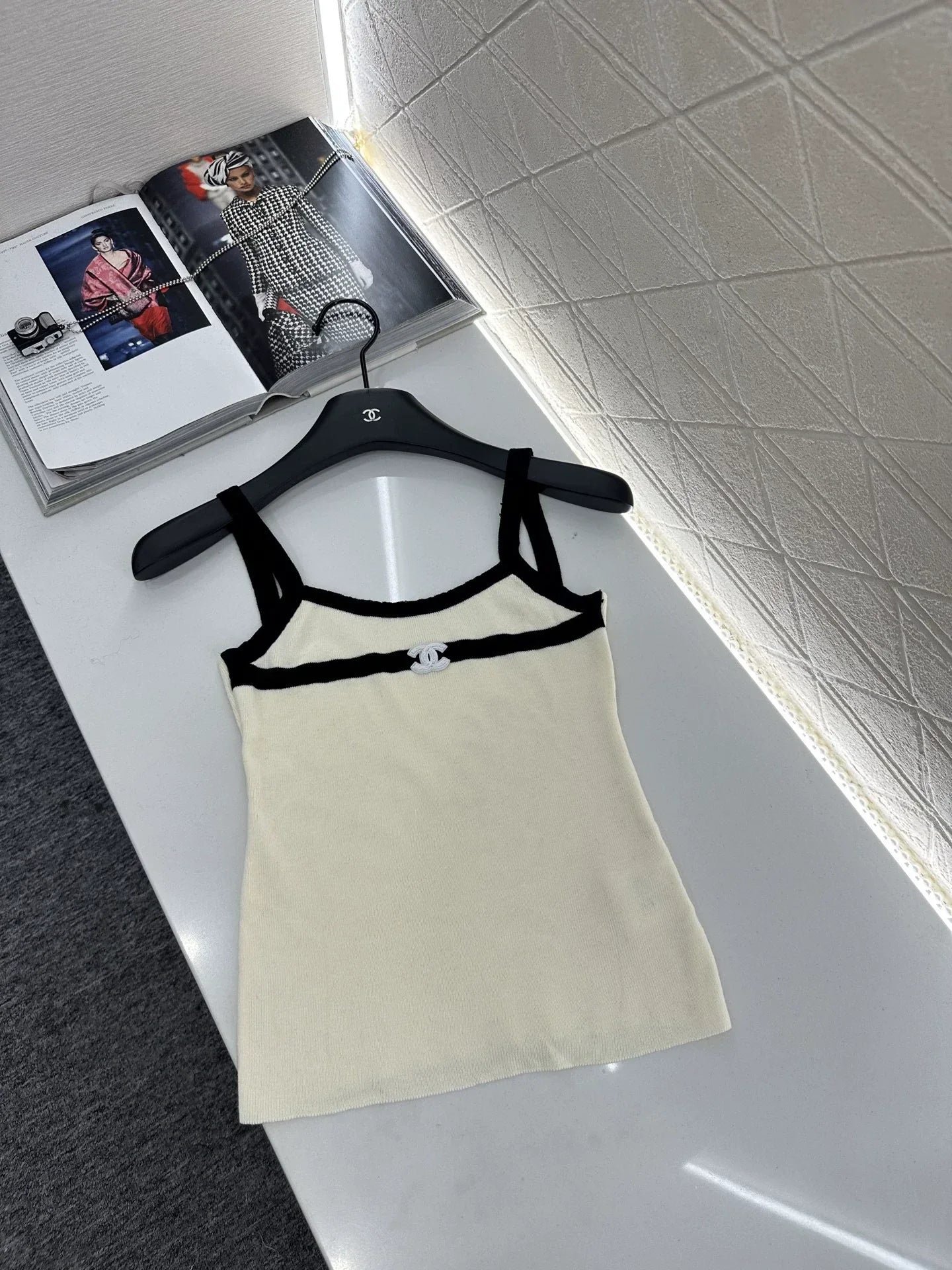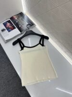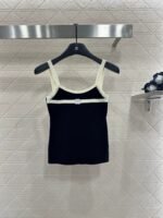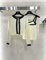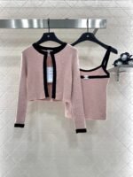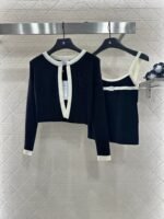 Wool yarn weaving texture premium comfortable suspender paired with cardigan two-piece design vest thin suspender and chest decoration with contrasting color edging to highlight the iconic double-C logo pattern, highlighting the brand personality and high-end sense of wearing. Paired with a short cardigan and chest rhinestone double C-buckle connection cardigan, the simple style exudes charm and temperament. The vertical pit strip fabric is elastic and elastic, making it more exquisite. It also covers the upper body and makes it slim. The wearing style shows a relaxed tone