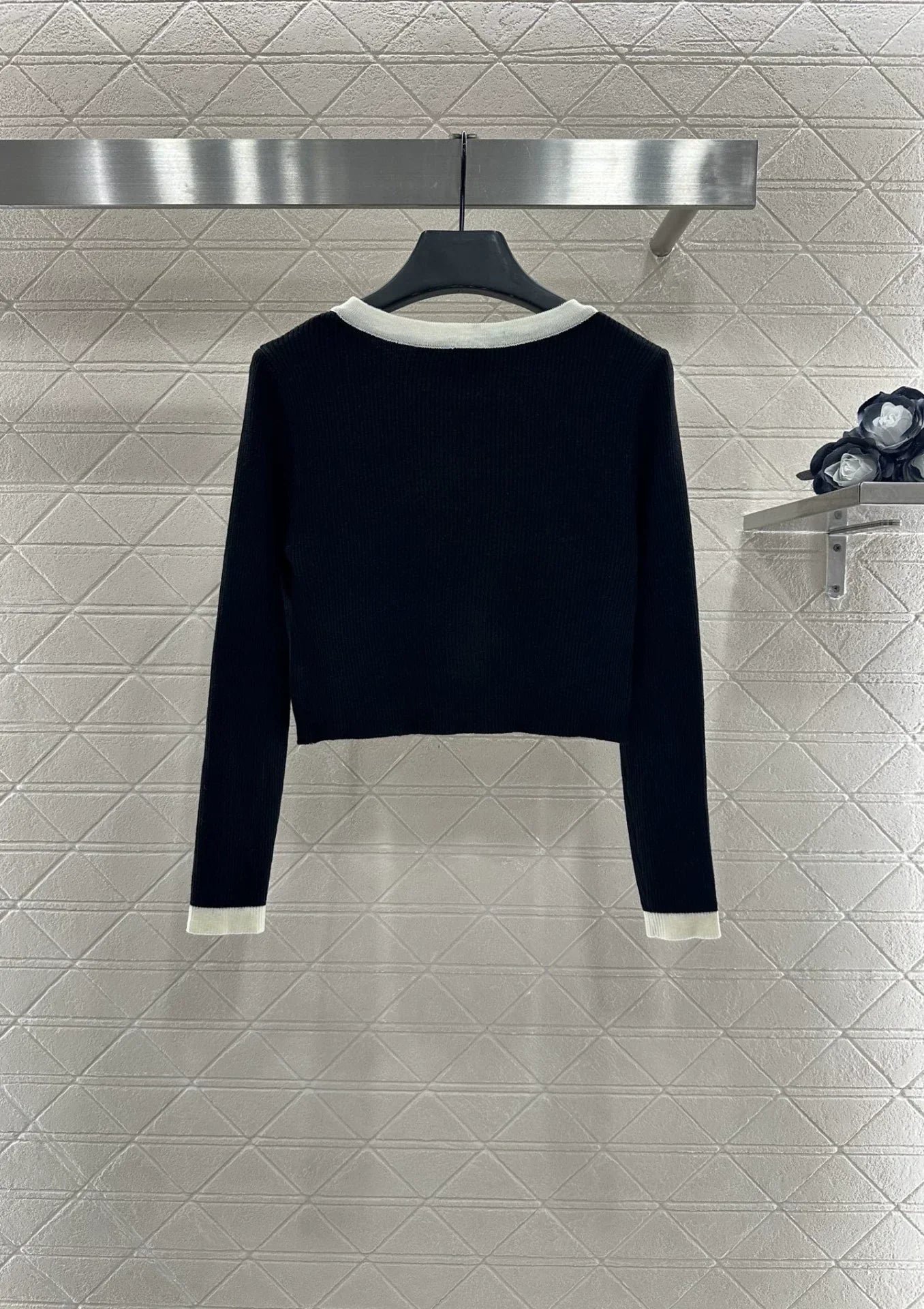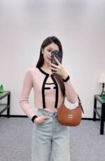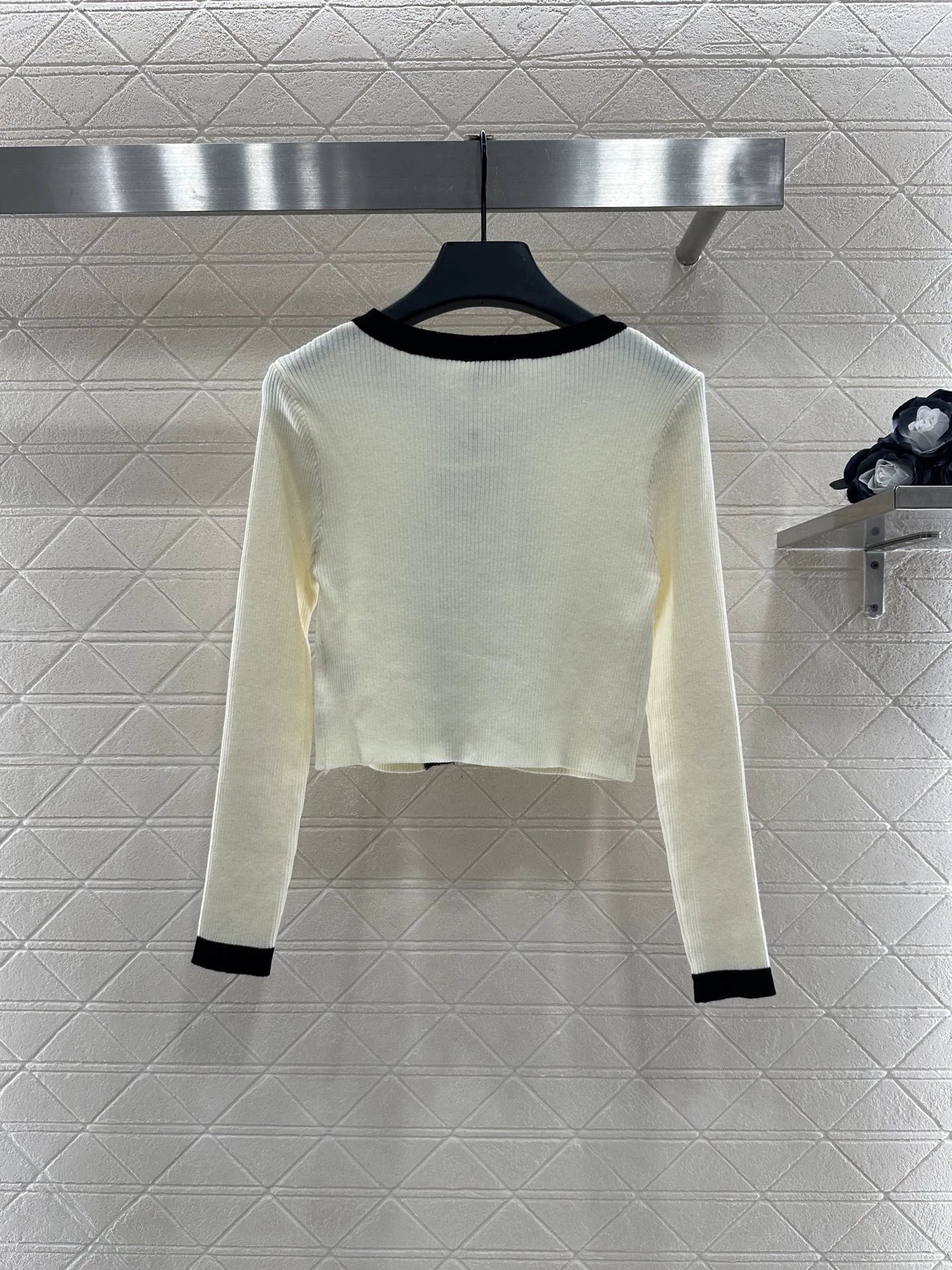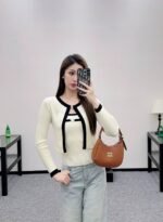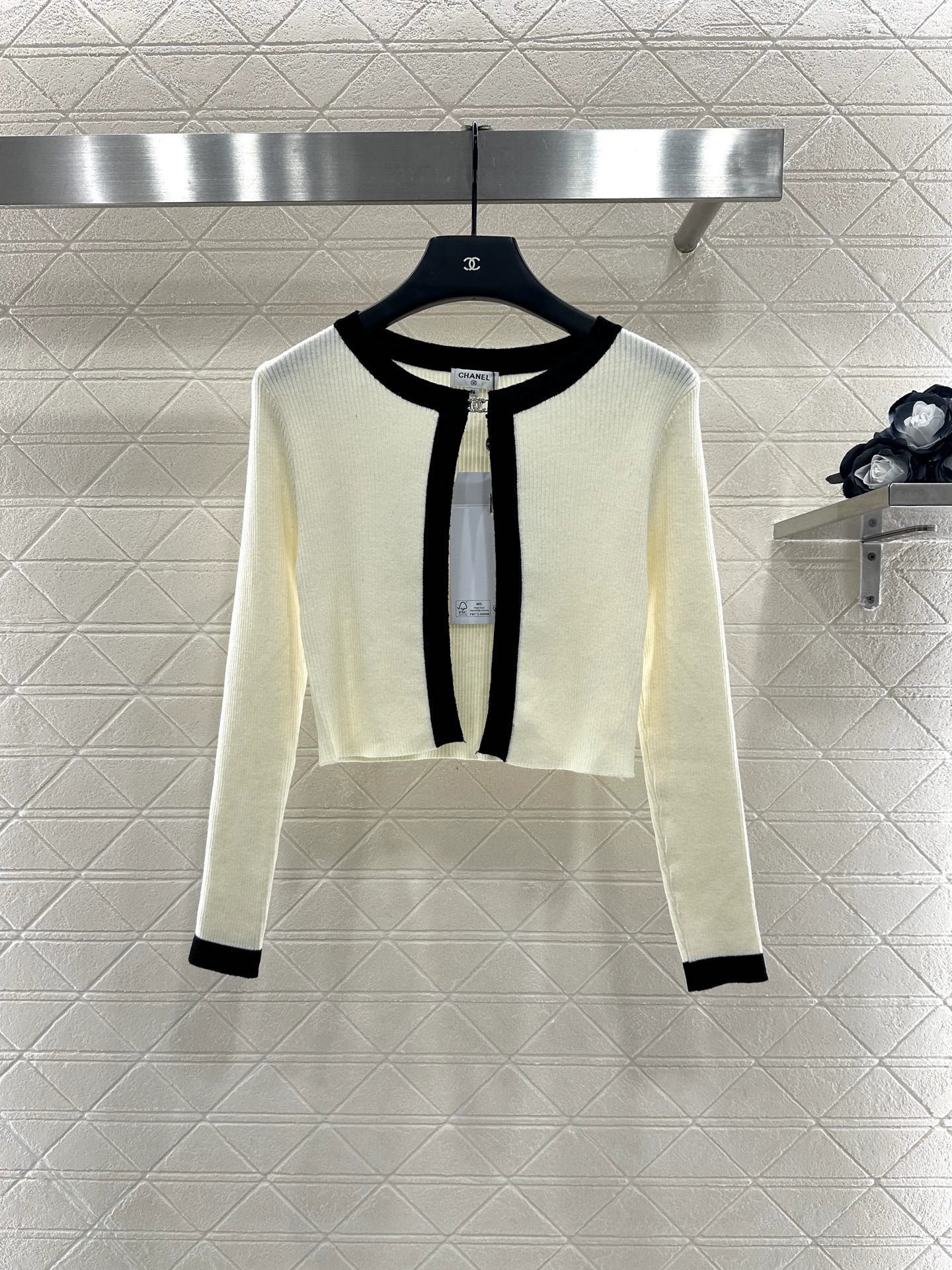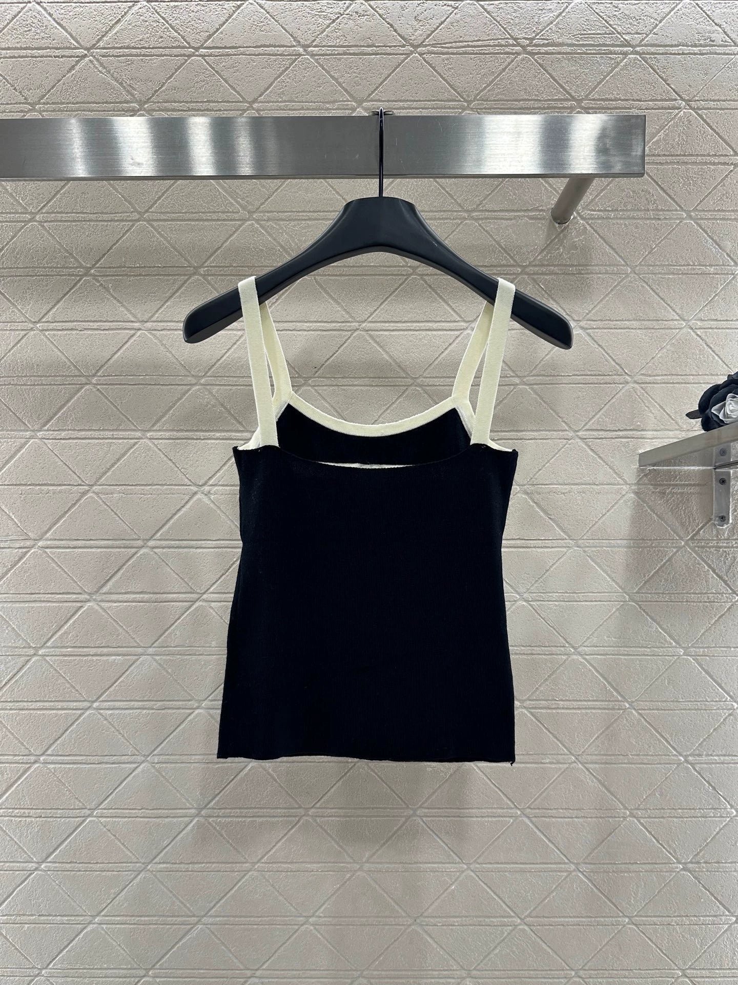Wool yarn weaving texture premium comfortable suspender paired with cardigan two-piece design vest thin suspender and chest decoration with contrasting color edging to highlight the iconic double-C logo pattern, highlighting the brand personality and high-end sense of wearing. Paired with a short cardigan and chest rhinestone double C-buckle connection cardigan, the simple style exudes charm and temperament. The vertical pit strip fabric is elastic and elastic, making it more exquisite. It also covers the upper body and makes it slim. The wearing style shows a relaxed tone