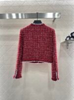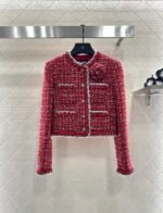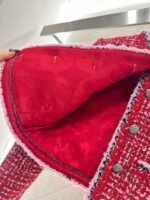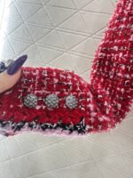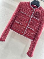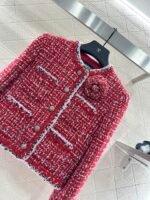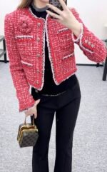 Made of coarse woolen material, with a high-end texture and a full appearance, this round necked dress jacket has a design that fits the human body with shoulder pads, making the body appear slender and straight. The large neckline extends to the front hem and is made of pink ➕ The black woven edge lights up the details, echoing the cuff pockets. The red background color is interwoven with delicate colored yarn rules to create a texture that covers the whole body. Paired with a three-dimensional camellia brooch on the chest, the socialite style stands out, perfectly interpreting the elegant and luxurious feeling. Paired with skirts and pants, the upper body exudes a luxurious texture, intellectual and gentle, making it an excellent choice for Christmas, New Year and year-end gatherings