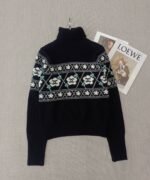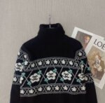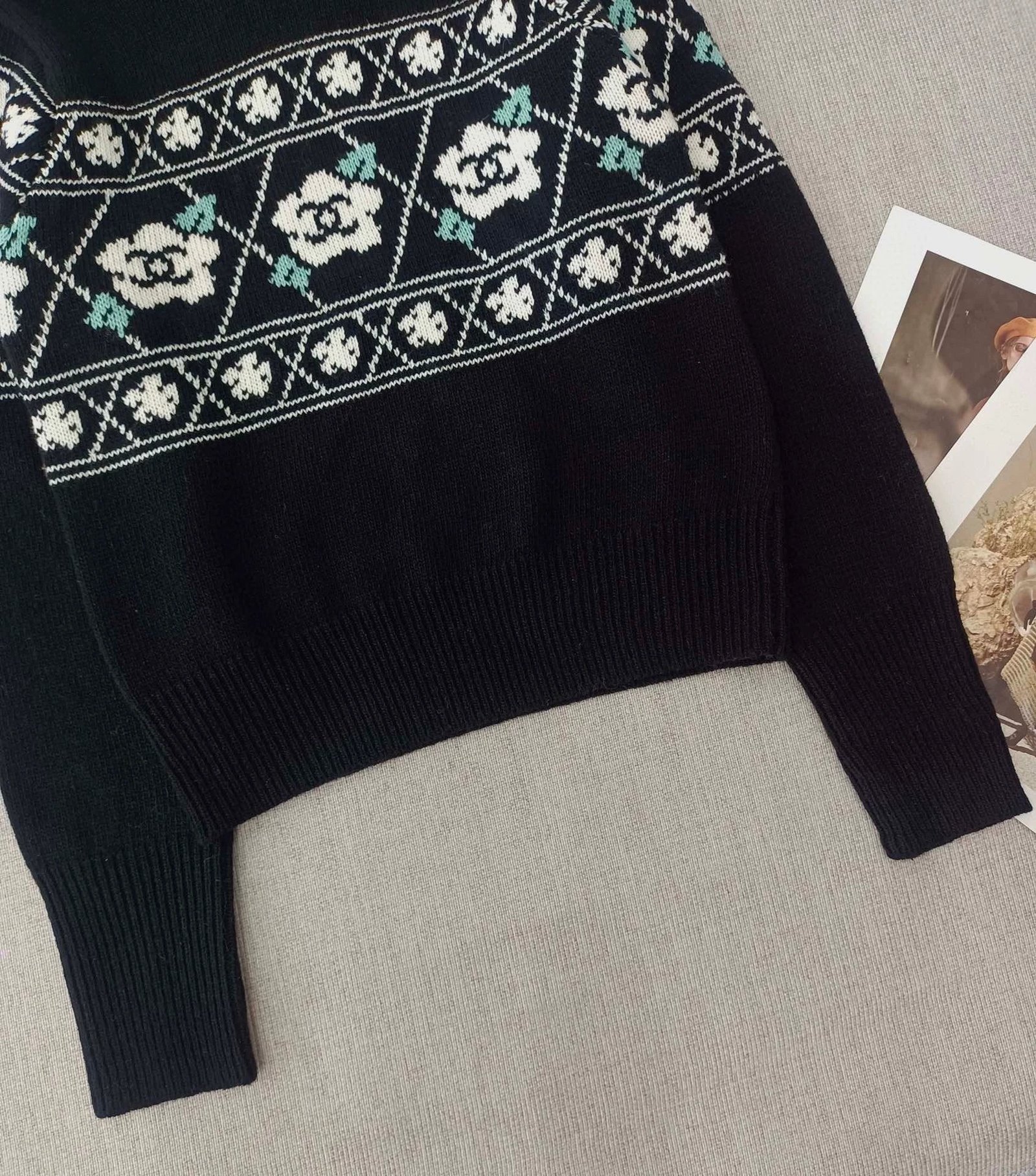 Black classic style, double C rose pattern on the chest, black and white color scheme, high neck design.