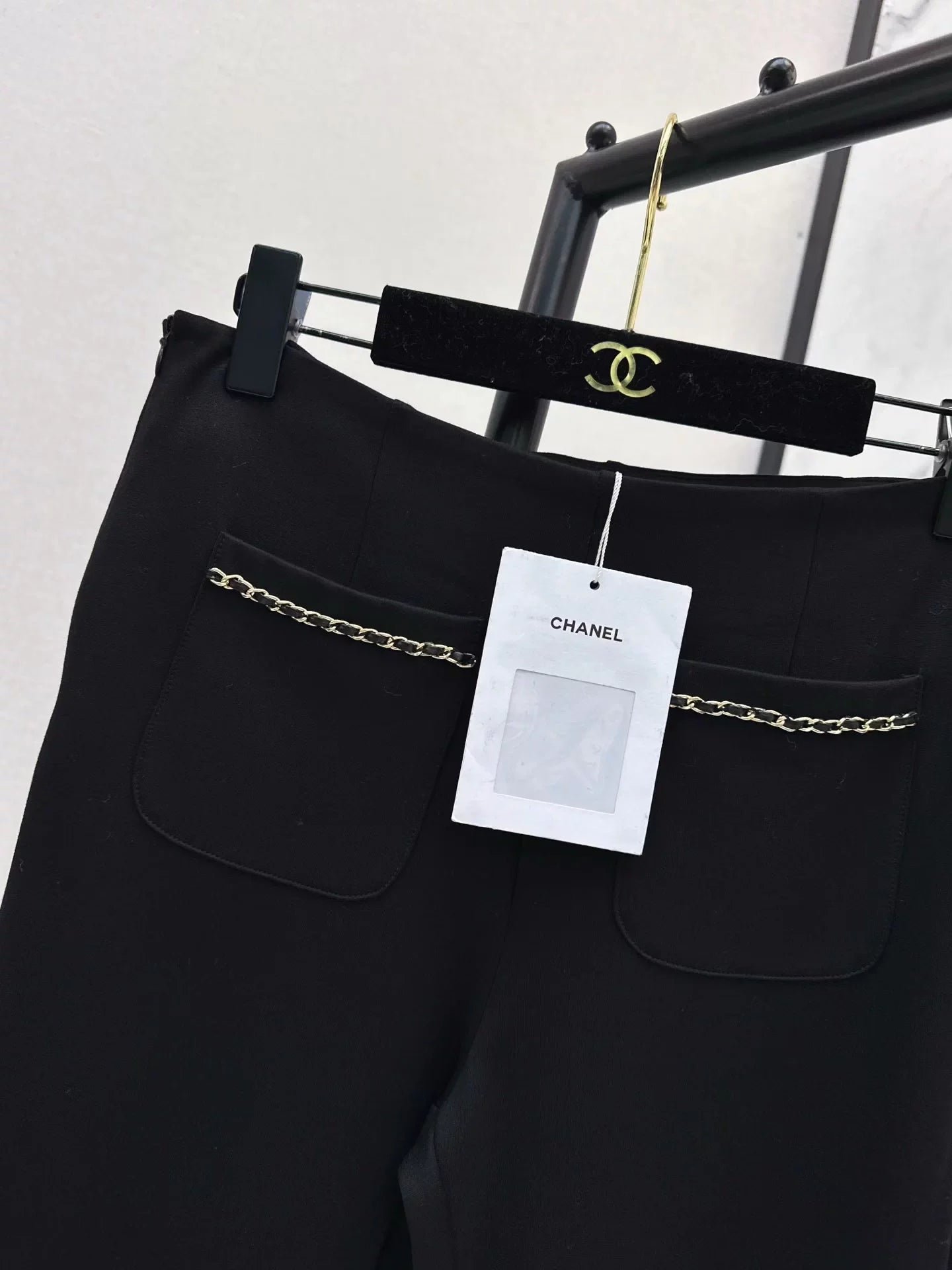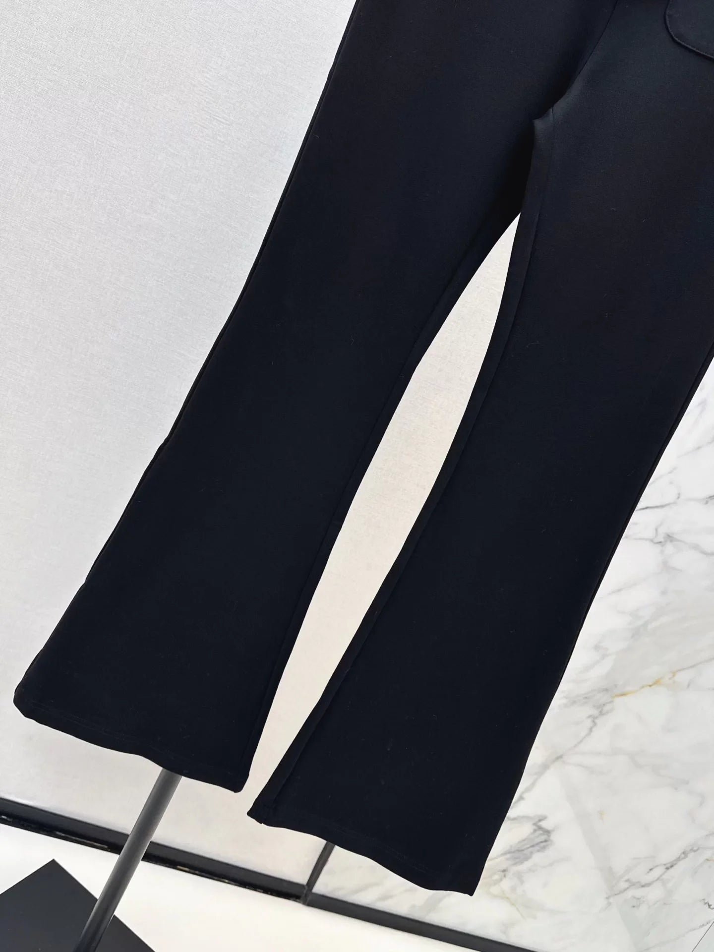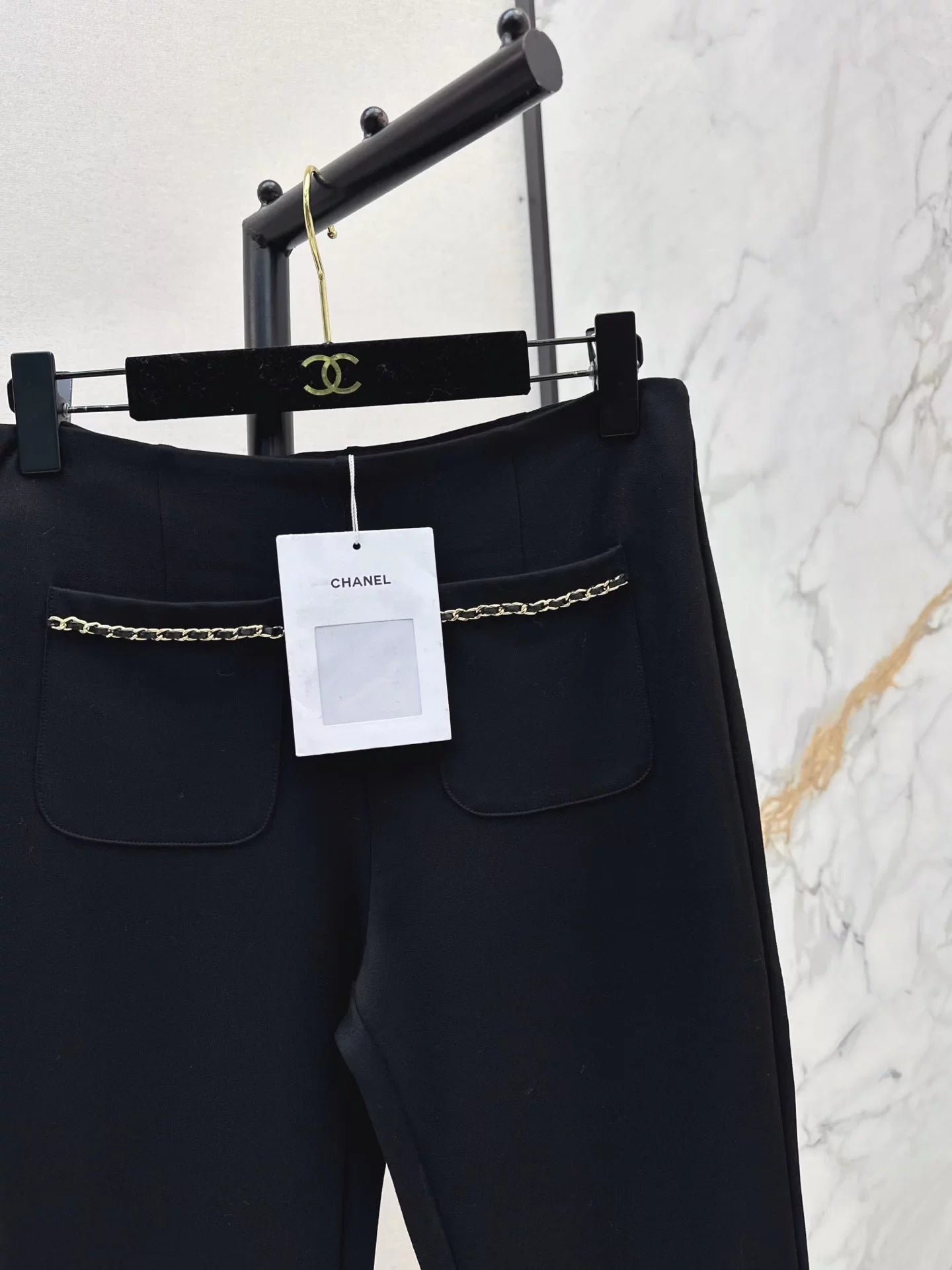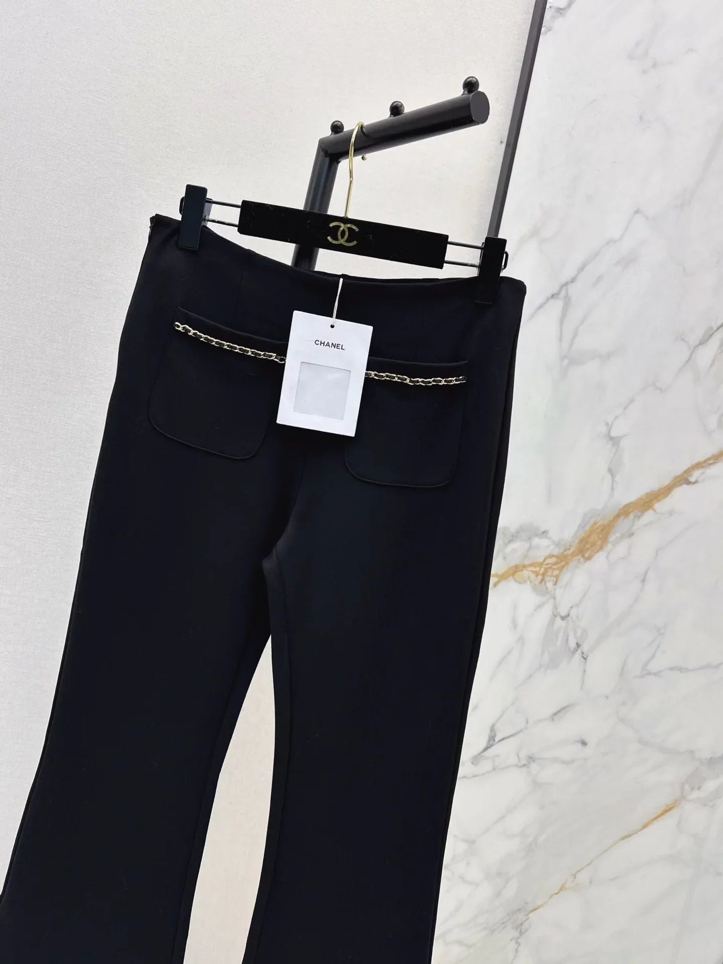 High-elastic fabric, moderate thickness, no fleece lining. Chain embellishment on the front pockets. Slightly flared style to flatter the legs.