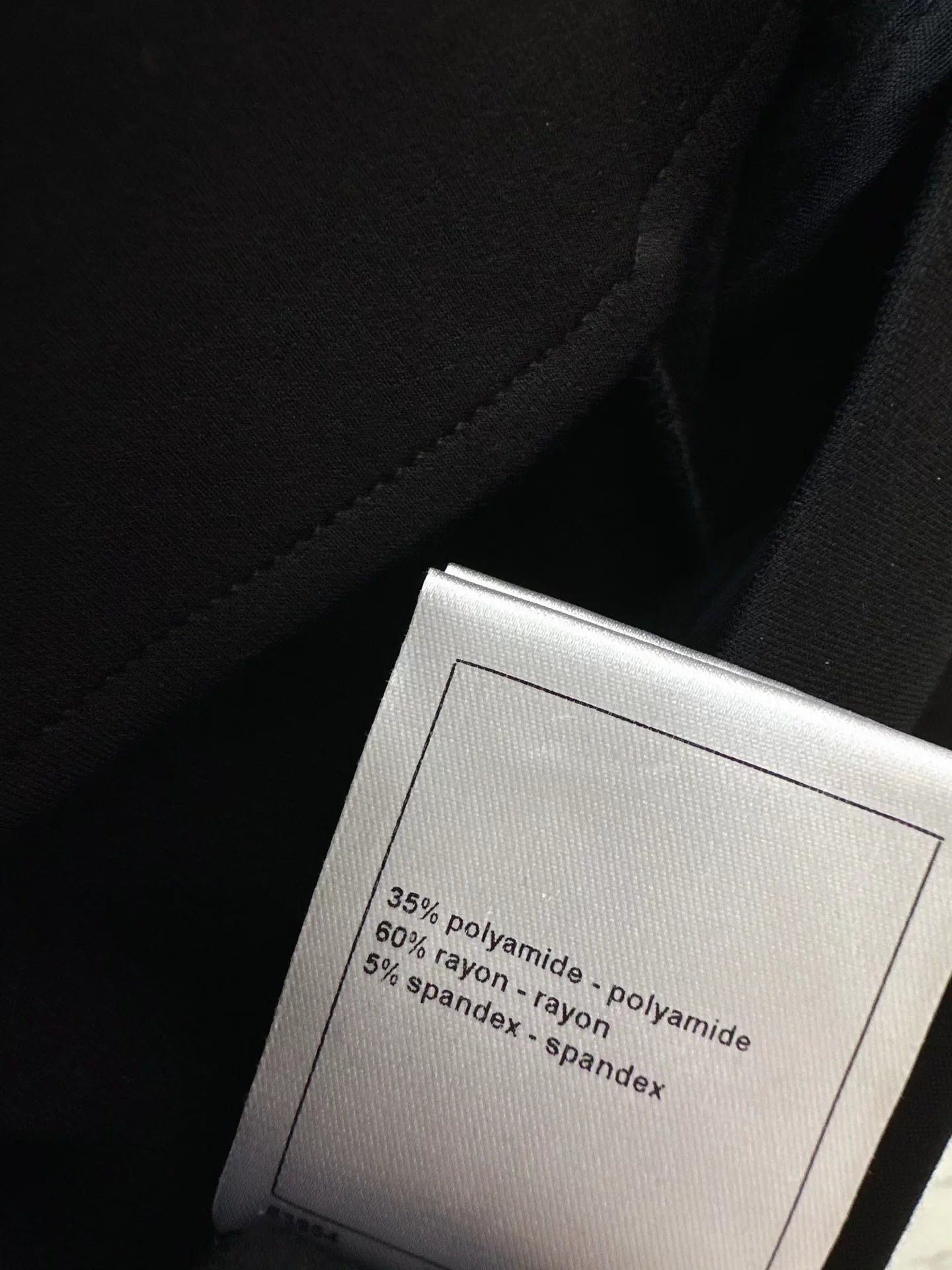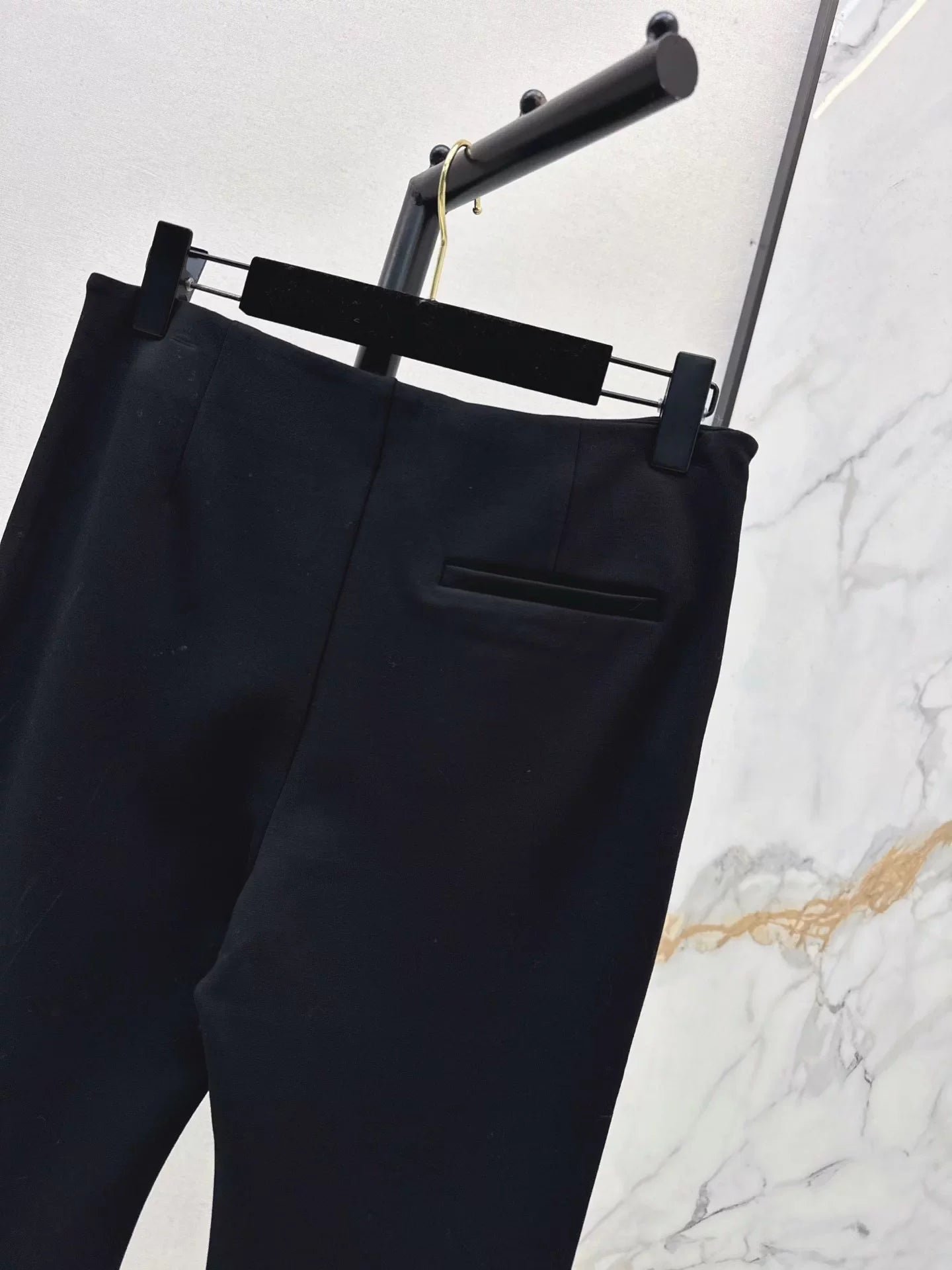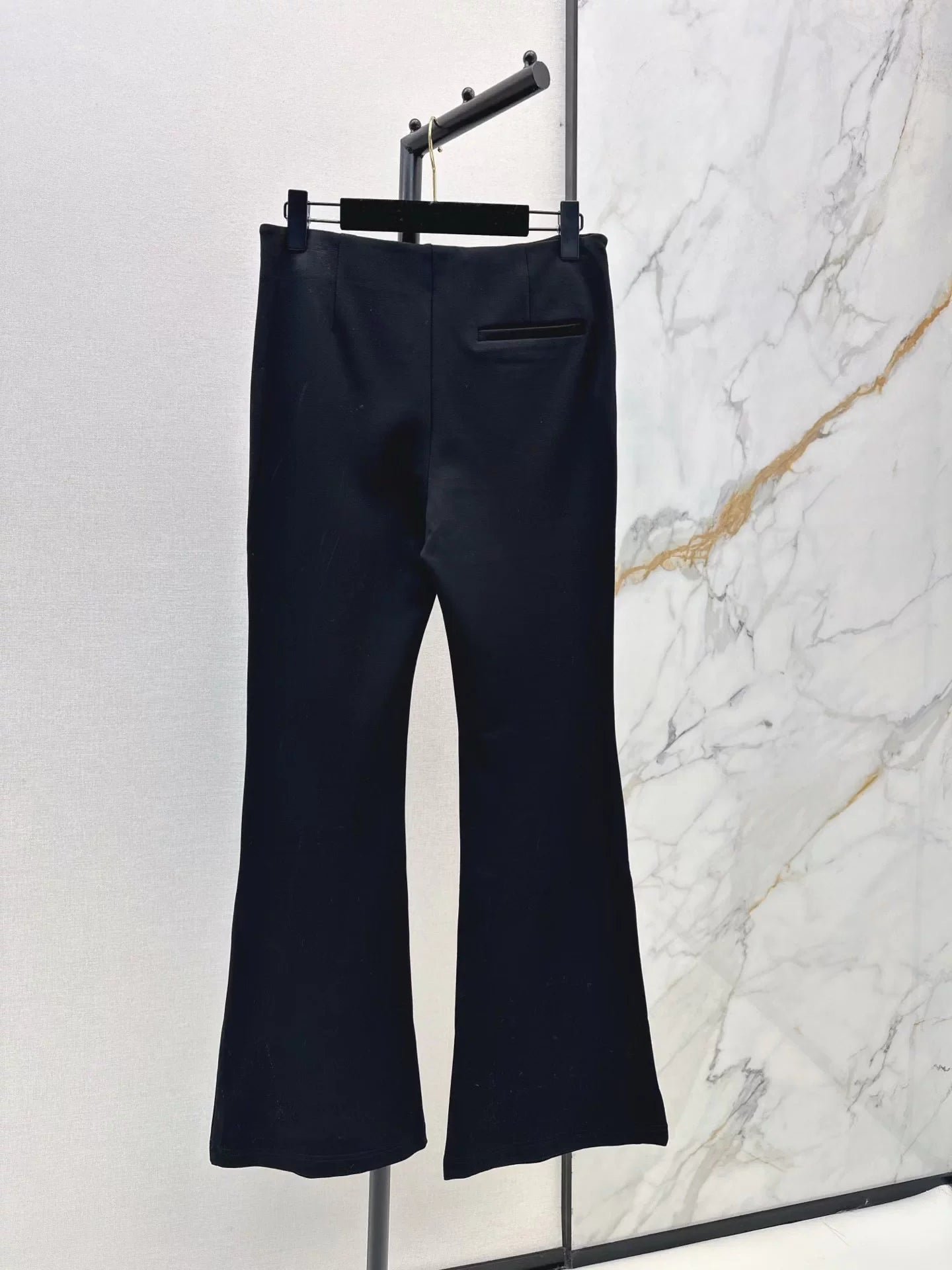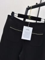 High-elastic fabric, moderate thickness, no fleece lining. Chain embellishment on the front pockets. Slightly flared style to flatter the legs.