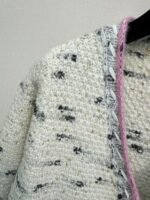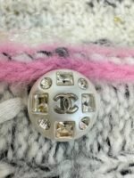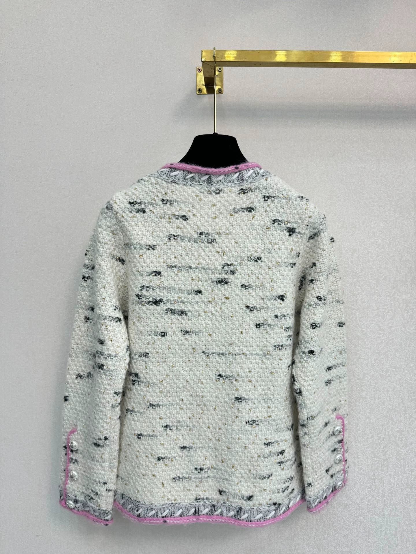 Exquisite double C logo crystal buttons embellished with pink border design, showcasing an elegant temperament. The fabric is made of high-quality coarse woolen fabric, with a soft and comfortable touch, suitable for wearing in autumn and winter seasons.