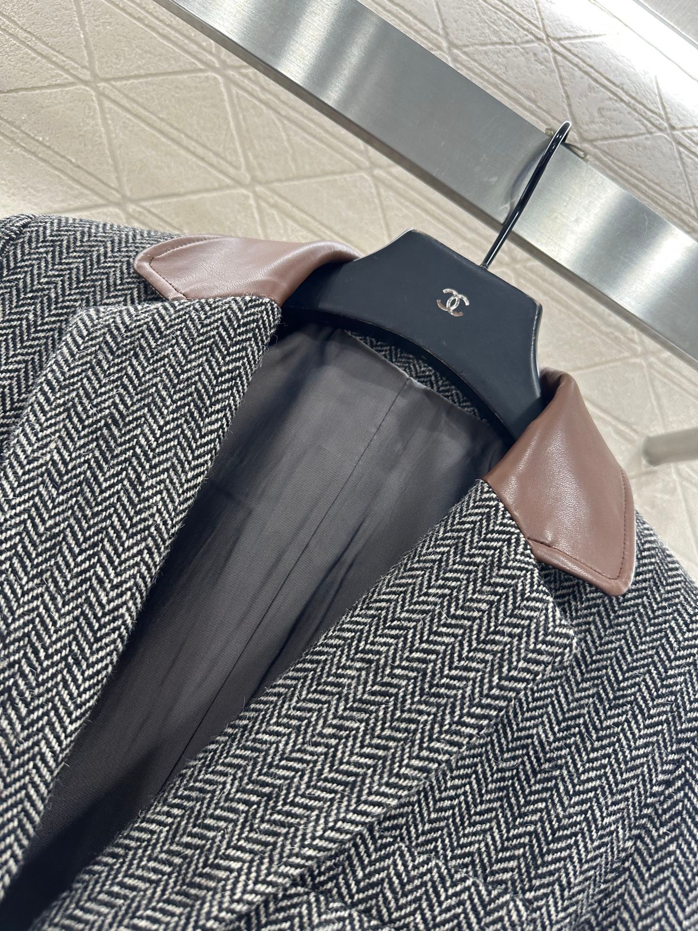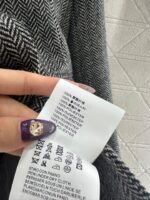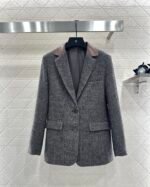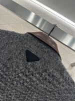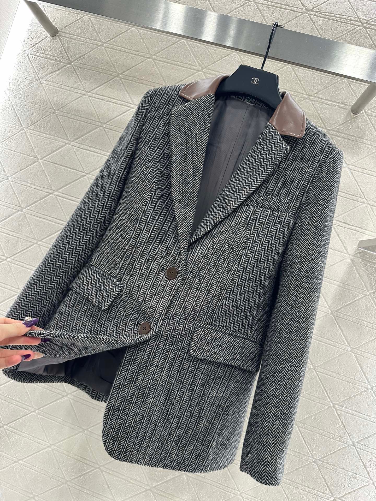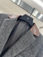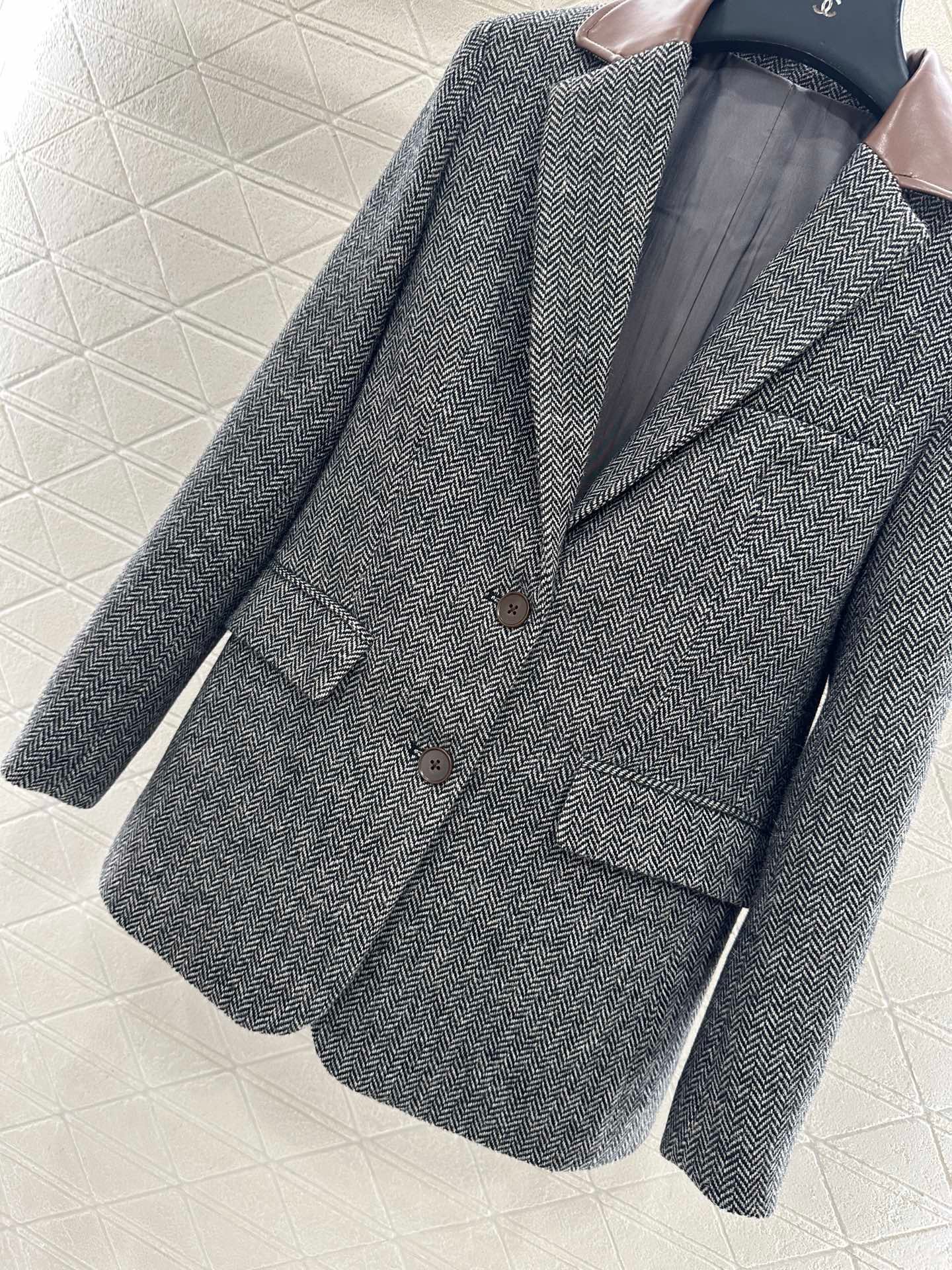 Made of woolen material with distinct texture, it is luxurious and comfortable. The lapel suit has a classic and durable design with a brown black V-shaped dark pattern throughout. The leather splicing collar treatment, combined with symmetrical flip pockets, fully showcases the British artistic style. The triangular emblem on the back collar highlights the design sense and adds style. Back slit three-dimensional cutting, making the outfit more stylish and relaxed