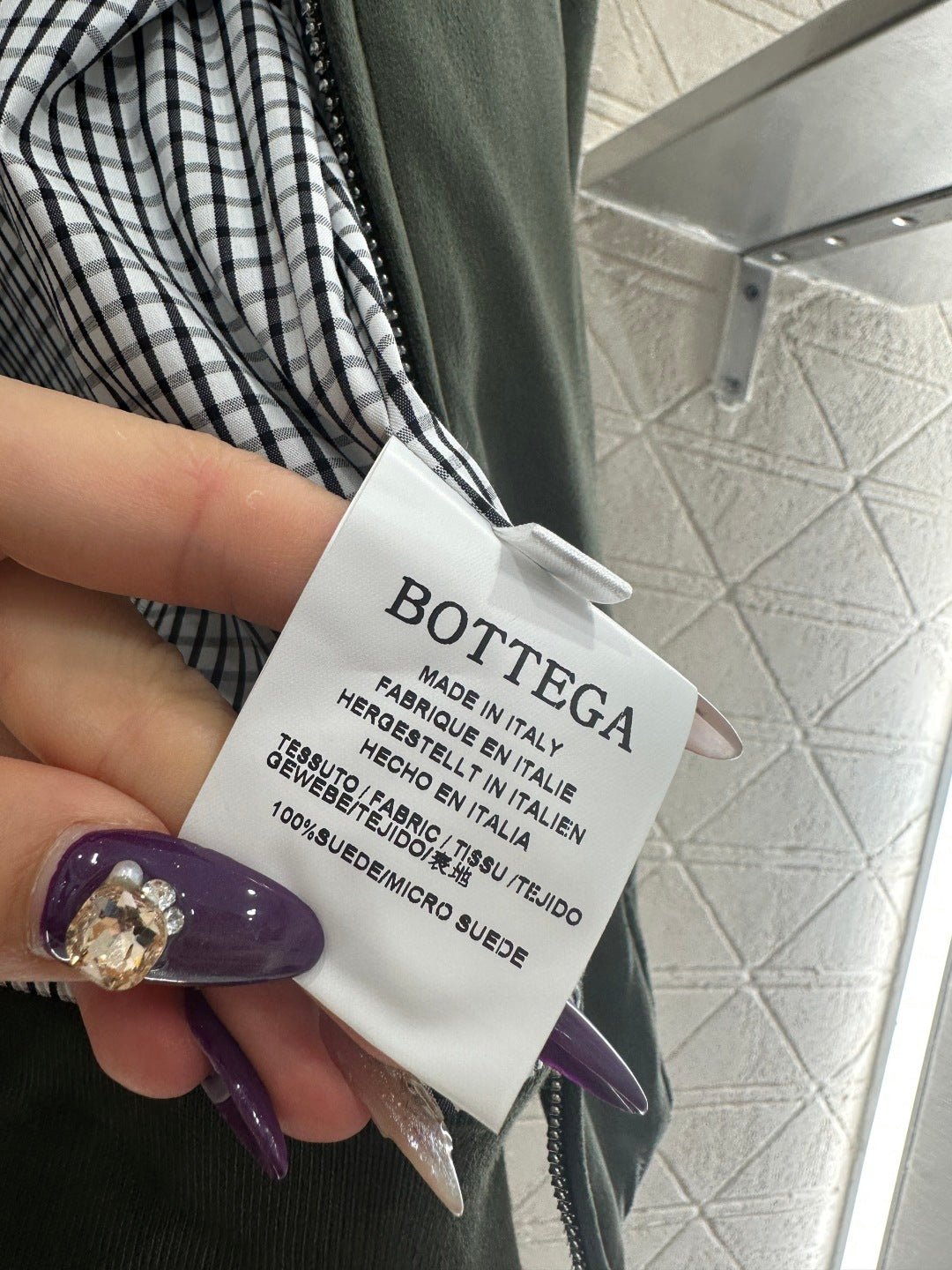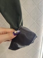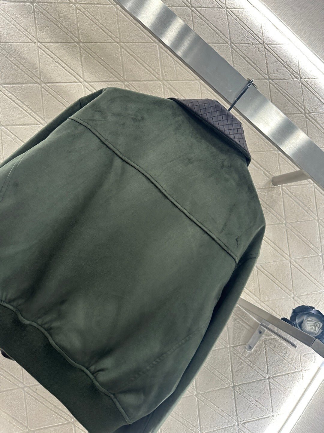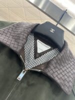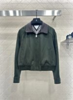 Glossy texture, crisp and stylish, with a lapel jacket silhouette and a zippered open top ➕ The lower hem has a narrowed elastic thread, and the lining is embellished with black and white checkered patterns. The ready to wear garment features a large military green body paired with the brand’s iconic woven leather collar, echoing the opposite cuffs. The color and material double collision brightens the design, adding visual highlights to the regular style and creating a sweet and cool style. Paired with skirts and pants, it exudes a high street fashion style