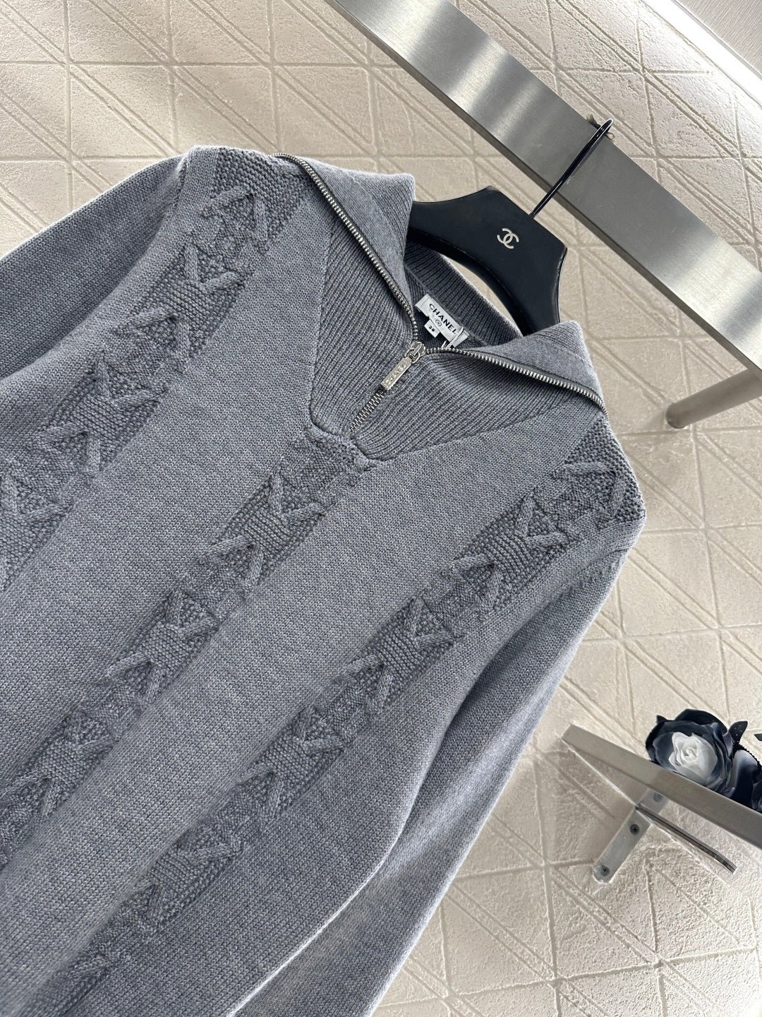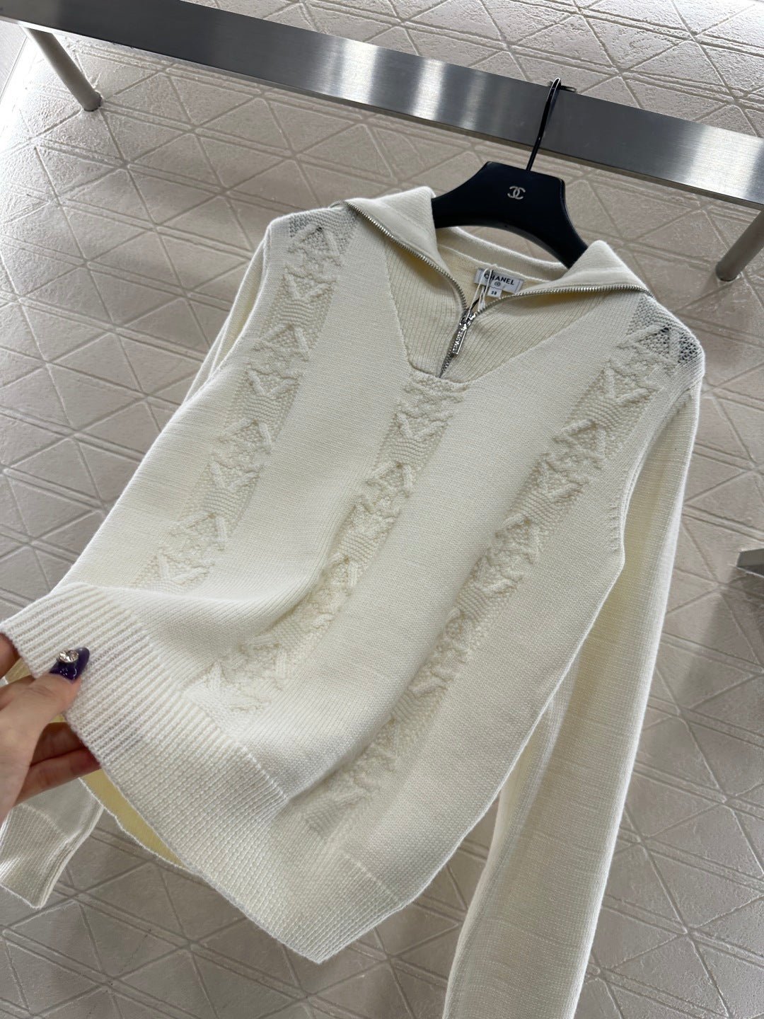 Woven from cashmere and wool yarn, delicate and soft, comfortable and warm. Knitted pullover sweater with lapel and zipper, semi open collar with delicate threads ➕ The triangular vertical columns of the body are staggered, with rich visual layers, complemented by the chain buckle logo decoration, highlighting the brand style, and the shoulder drop design enhances the sense of relaxation