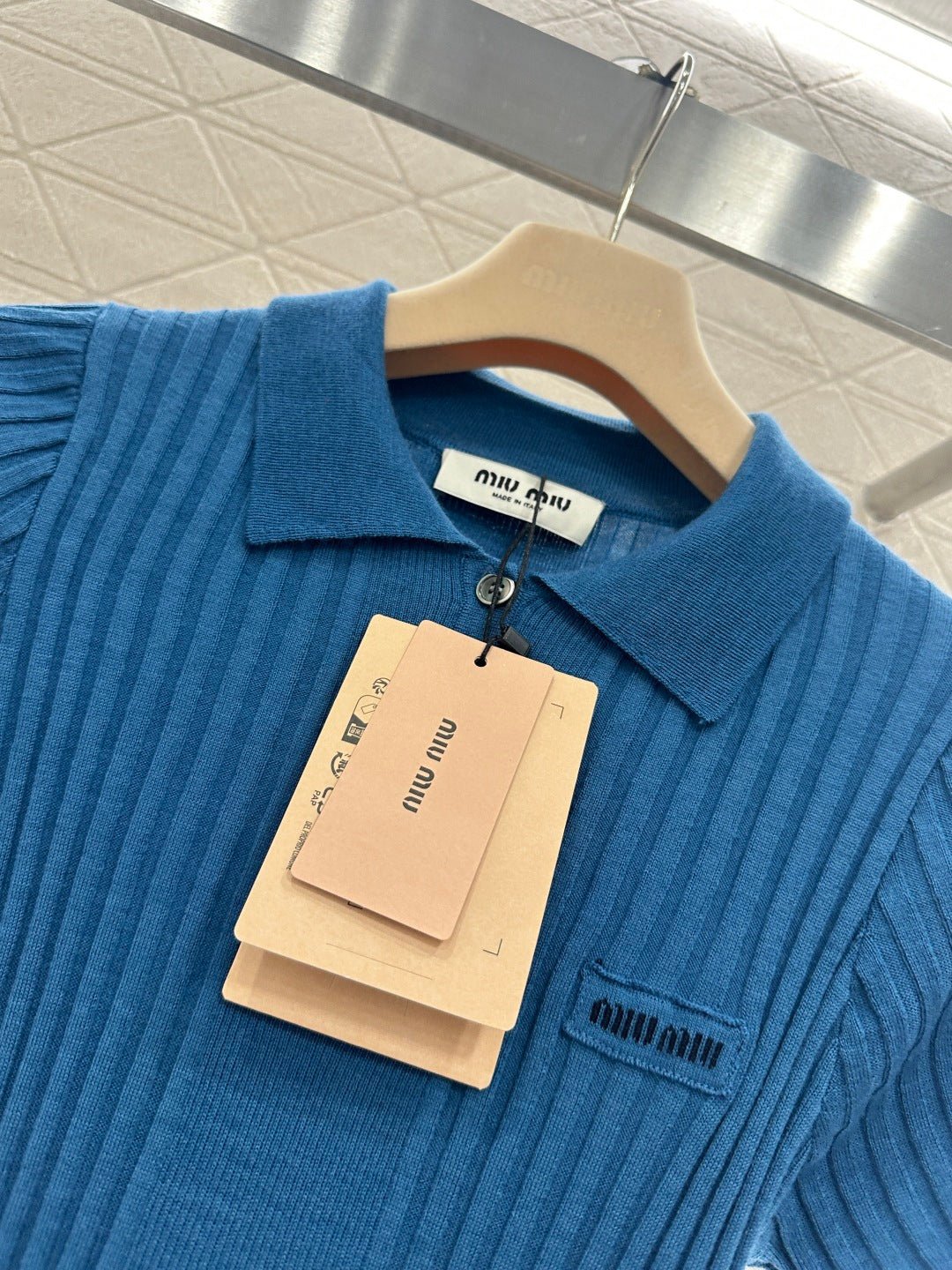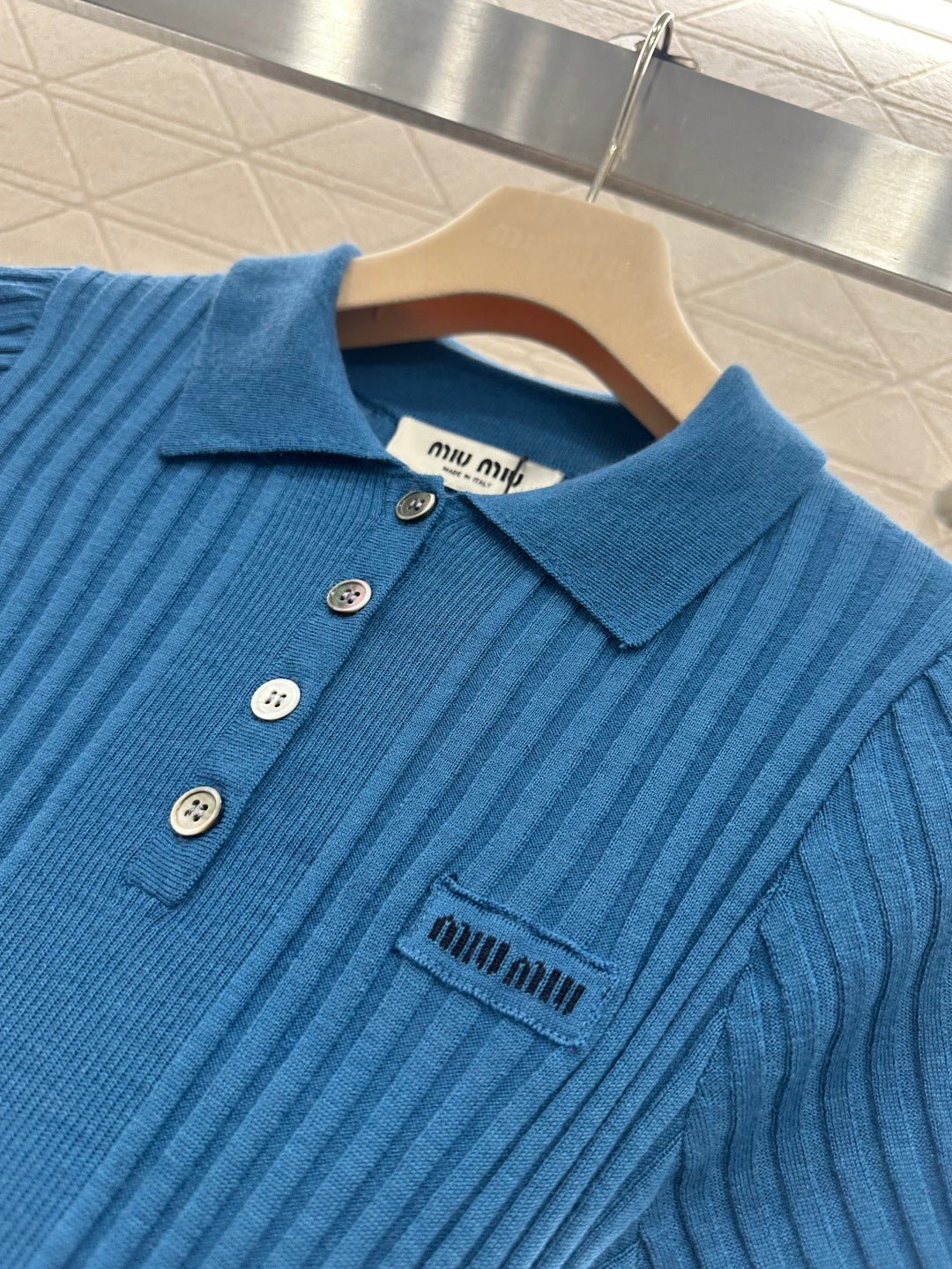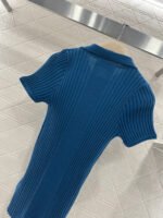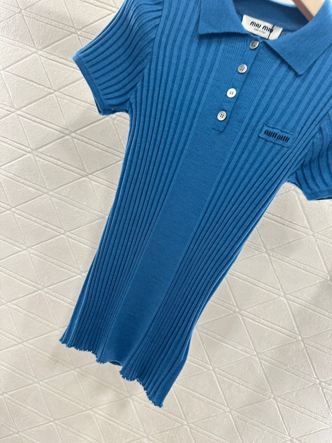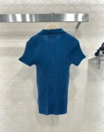 Wool yarn knitting, comfortable to wear, with a delicate texture. This short-sleeved shirt features a turn-down collar and vertical ribbed stripes. The half-open button closure allows for adjustable coverage, and unbuttoning the top button increases skin exposure, highlighting the collarbone, shoulders, and neck. The highly elastic fabric creates a slimming and curve-enhancing effect. The 𝑙𝑜𝑔𝑜 logo on the chest reflects the brand’s style. The fitted cut is slimming and stylish. Wear it alone for a fresh, youthful look, or layer it under a coat for a more sophisticated springtime feel. It’s definitely a must-have item in any sweet wardrobe.
