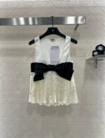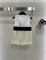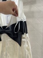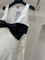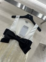 Satin silk material, skin friendly and comfortable, with a full and delicate luster, deep V-vest style, shoulder straps and neckline exposed to the skin to decorate the beautiful lines of the shoulders, and a contrasting three-dimensional bow embellished in the center of the chest, echoing the double-C logo, low-key and exquisite. The black and champagne colors collide and stitch together, and the hem is designed with pleated accordion folds to add a sense of layering, sexy and charming. The side slit zipper is easy to wear, versatile and slimming.