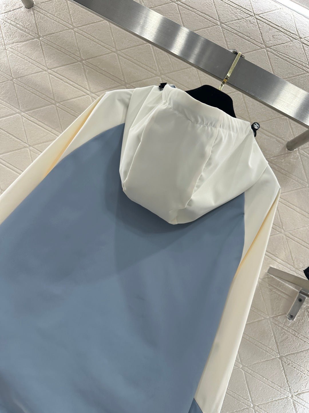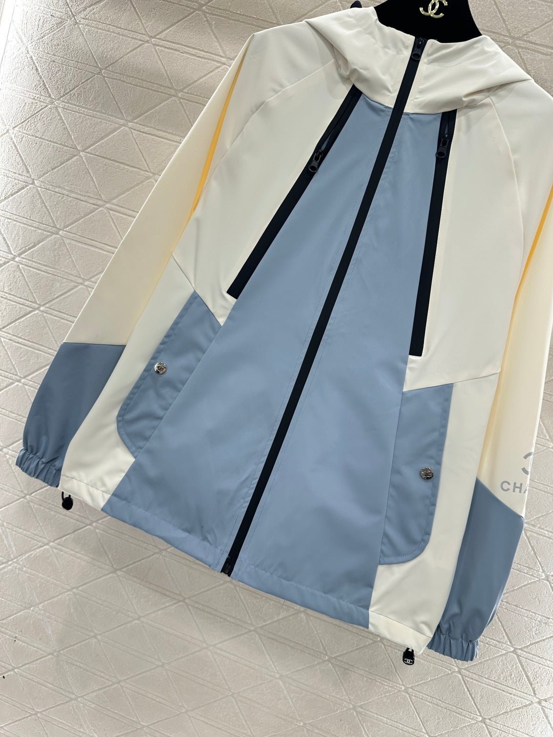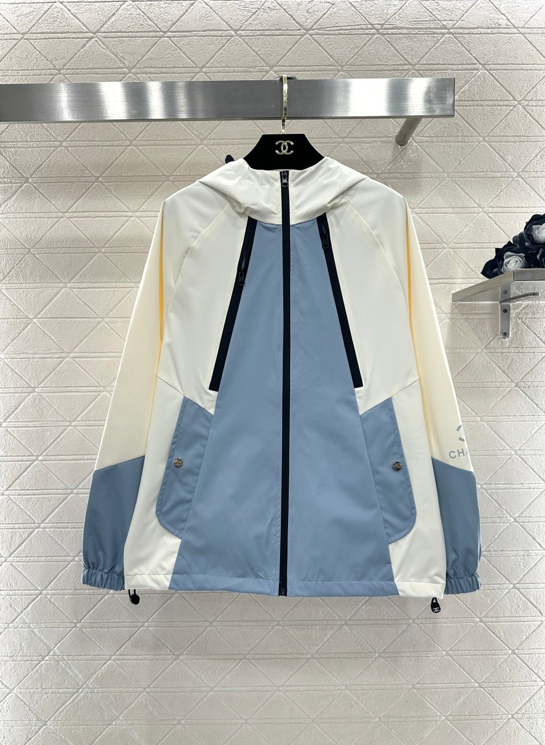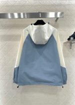 Made with imported windproof and waterproof material, this jacket boasts a glossy finish and a crisp, structured look. The hooded, zip-up design and striking color combination of creamy white and hazy blue create a fresh and stylish appearance. The clean lines and drawstring details combine practicality and design flair. The windproof fabric is suitable for various weather conditions. The relaxed silhouette flatters all body types, making it a top choice for layering in early spring and effortlessly achieving a fashionable look.