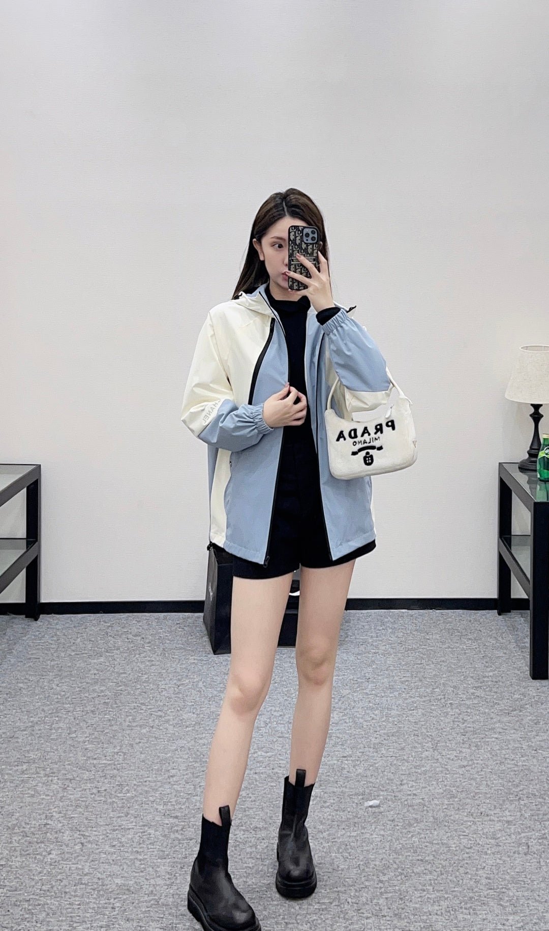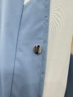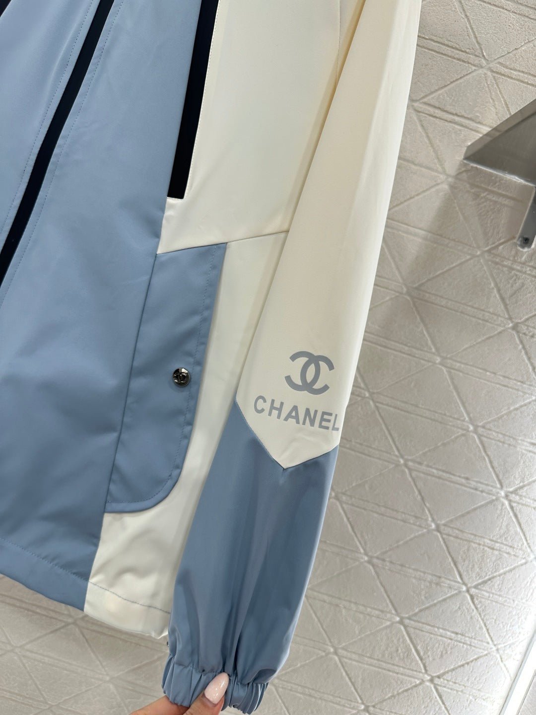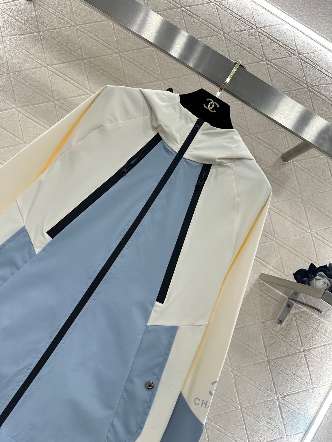 Made with imported windproof and waterproof material, this jacket boasts a glossy finish and a crisp, structured look. The hooded, zip-up design and striking color combination of creamy white and hazy blue create a fresh and stylish appearance. The clean lines and drawstring details combine practicality and design flair. The windproof fabric is suitable for various weather conditions. The relaxed silhouette flatters all body types, making it a top choice for layering in early spring and effortlessly achieving a fashionable look.