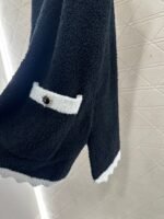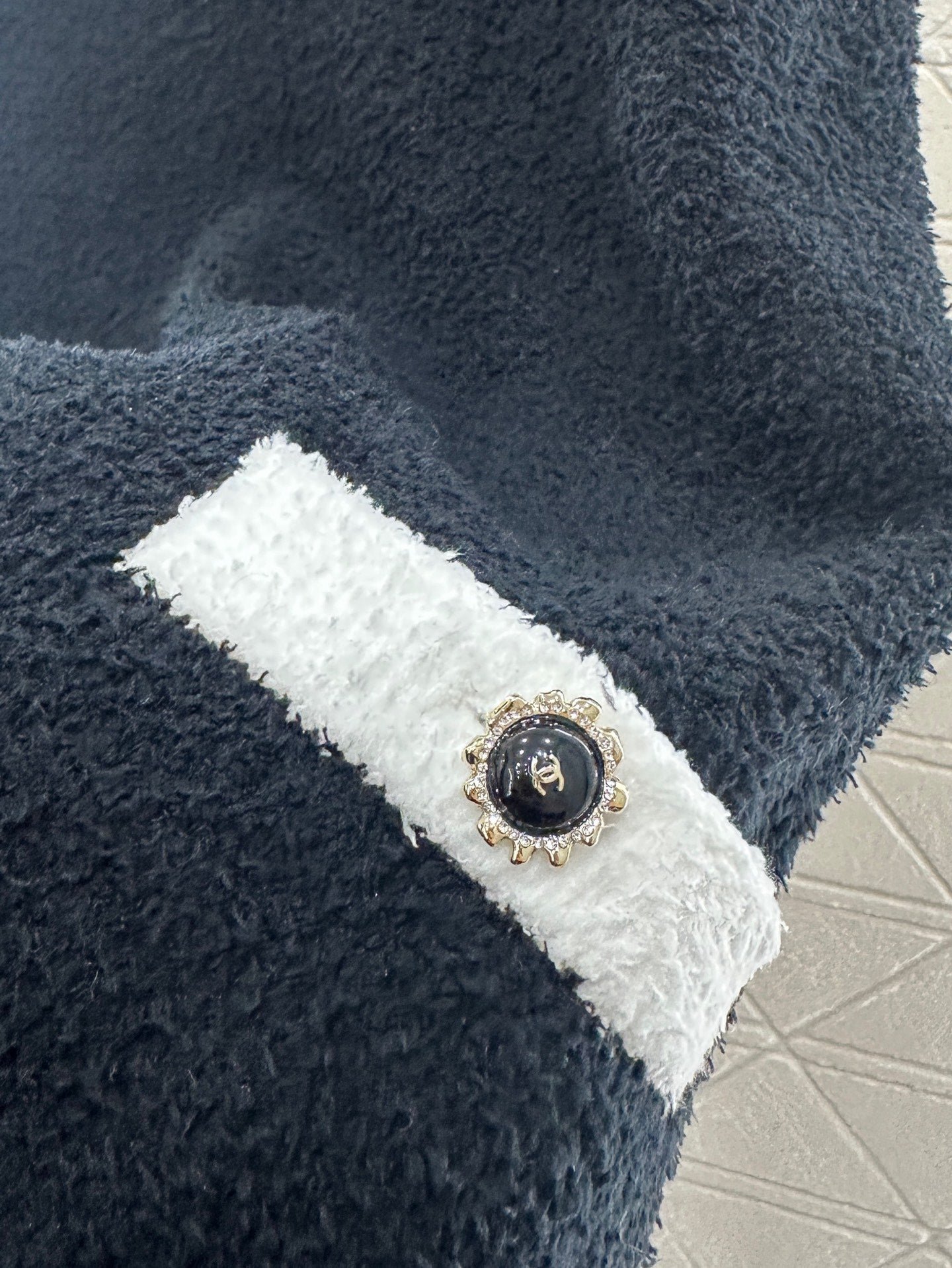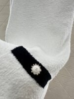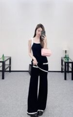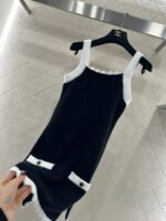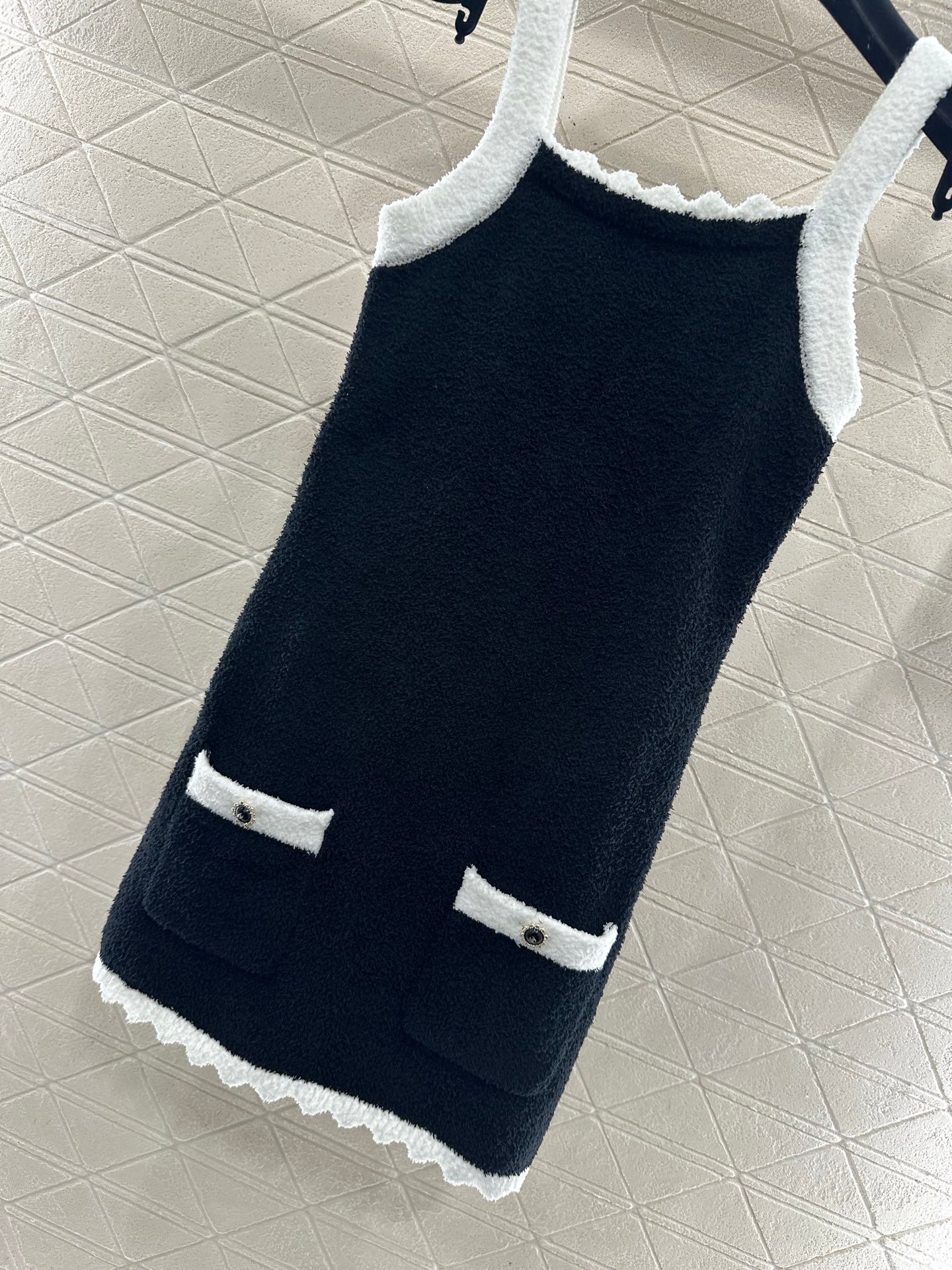 Weaved with silk and wool yarn, the texture is high-end and comfortable to wear. The knitted long camisole is cut, with black and white contrasting colors throughout. The collar is designed with wavy lace, and the double C rhinestone flower round buckle is used as the finishing touch, making the simple and elegant elements more restrained and exquisite. The elastic thread easily outlines the waist, and the hem is slightly slit, creating a good proportion. It is a versatile item that can be worn on both tops and skirts, with an elegant and fashionable style on the upper body