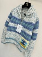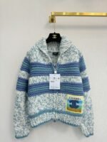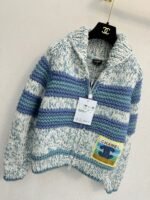 Blue and white striped splicing design, rich layering, and warm and comfortable lapel style. Embroidered double C logo on the chest, paired with zipper design, simple and atmospheric.
