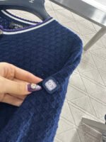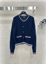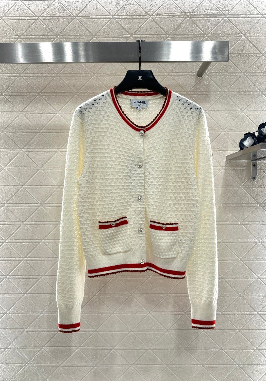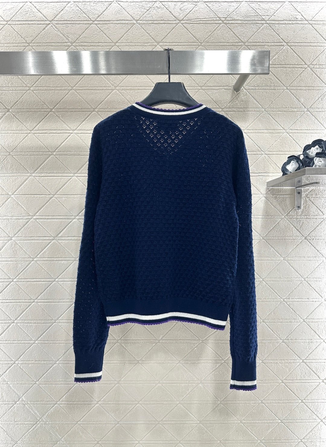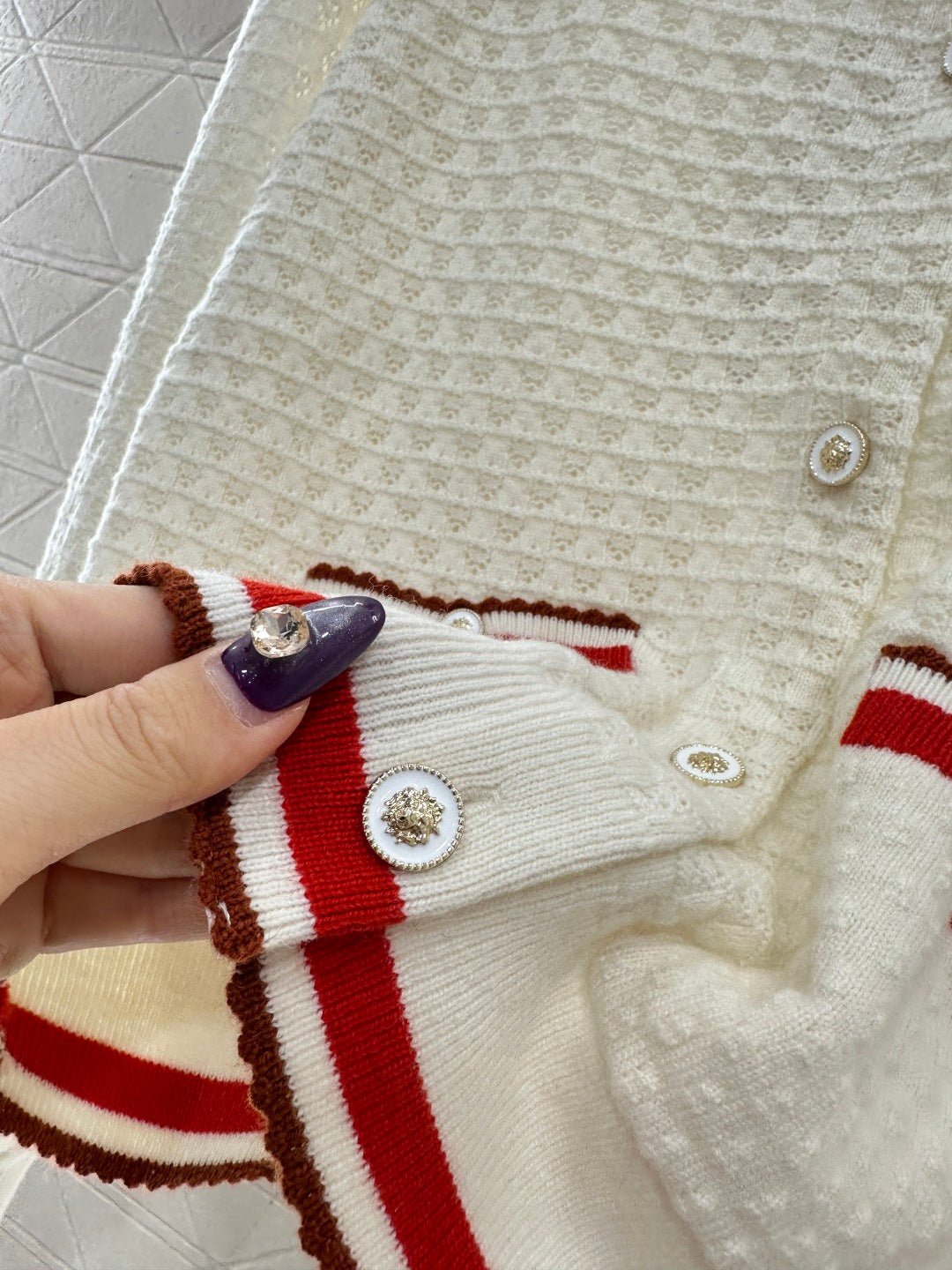 Woven from cashmere yarn with a fine knit, this cardigan boasts a soft, comfortable feel against the skin. Featuring a round neck, button-down shoulders, and an all-over openwork waffle texture, the front is adorned with camellia-shaped round buttons that reflect light, creating a relaxed and effortless look. The design is further enhanced by contrasting stripes along the wavy collar that extend to the front, hem, cuffs, and pocket edges, adding depth and dimension. The flattering cut is forgiving and exudes elegance.