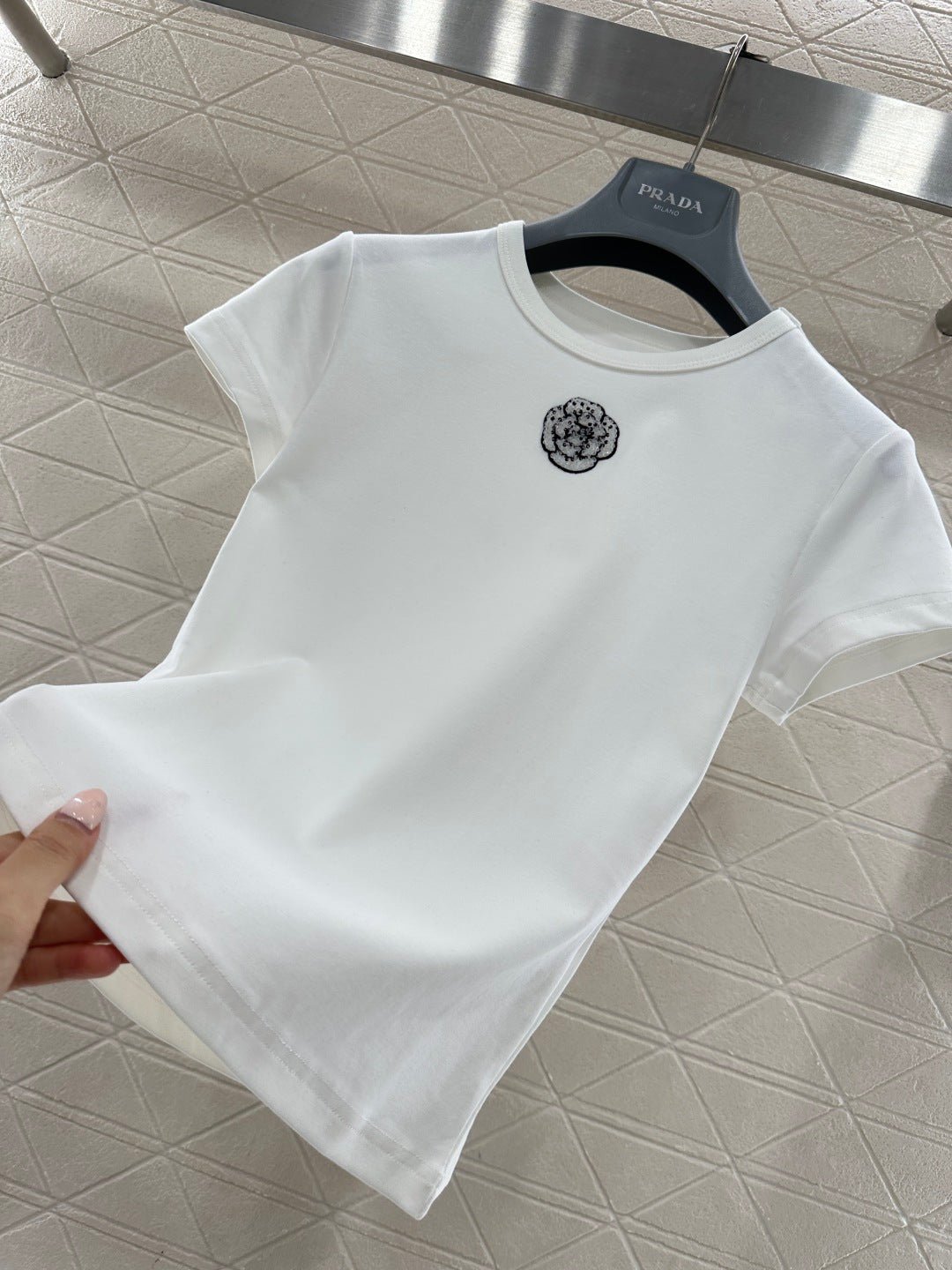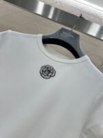 Made from twill cotton, this garment is breathable, comfortable, and exudes quality. Available in versatile black and white, it suits all body types. The delicate camellia beaded embroidery on the chest breaks the monotony of the solid color, showcasing the brand’s craftsmanship. The soft, stretchy cotton fabric feels gentle on the skin, and the fitted, cropped style hugs the figure without being restrictive, effortlessly creating a clean and sharp silhouette. It’s perfect for a fresh, casual everyday look when worn alone, or layered with a blazer or denim jacket for a more sophisticated and layered style – a true wardrobe staple.