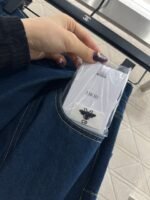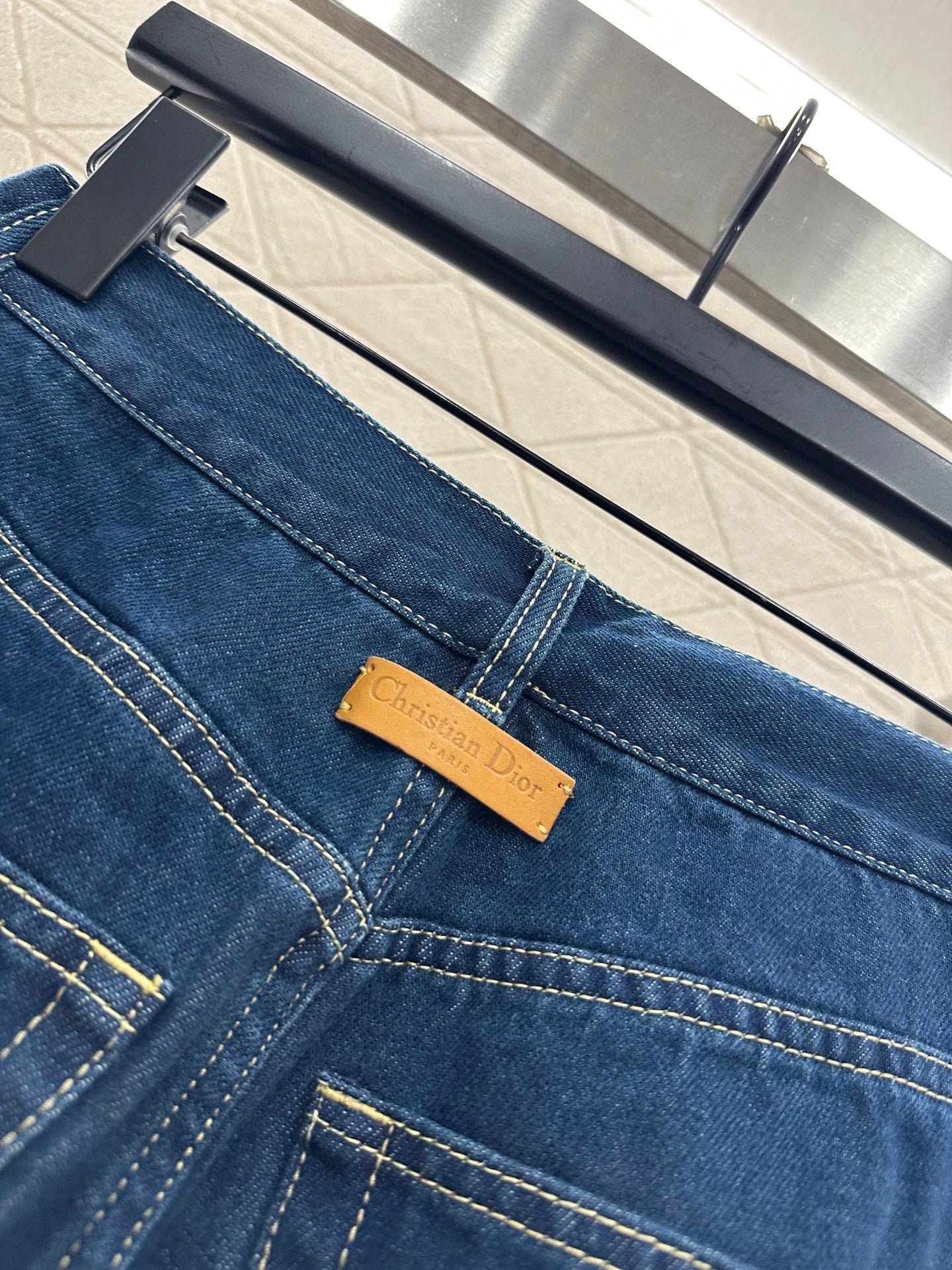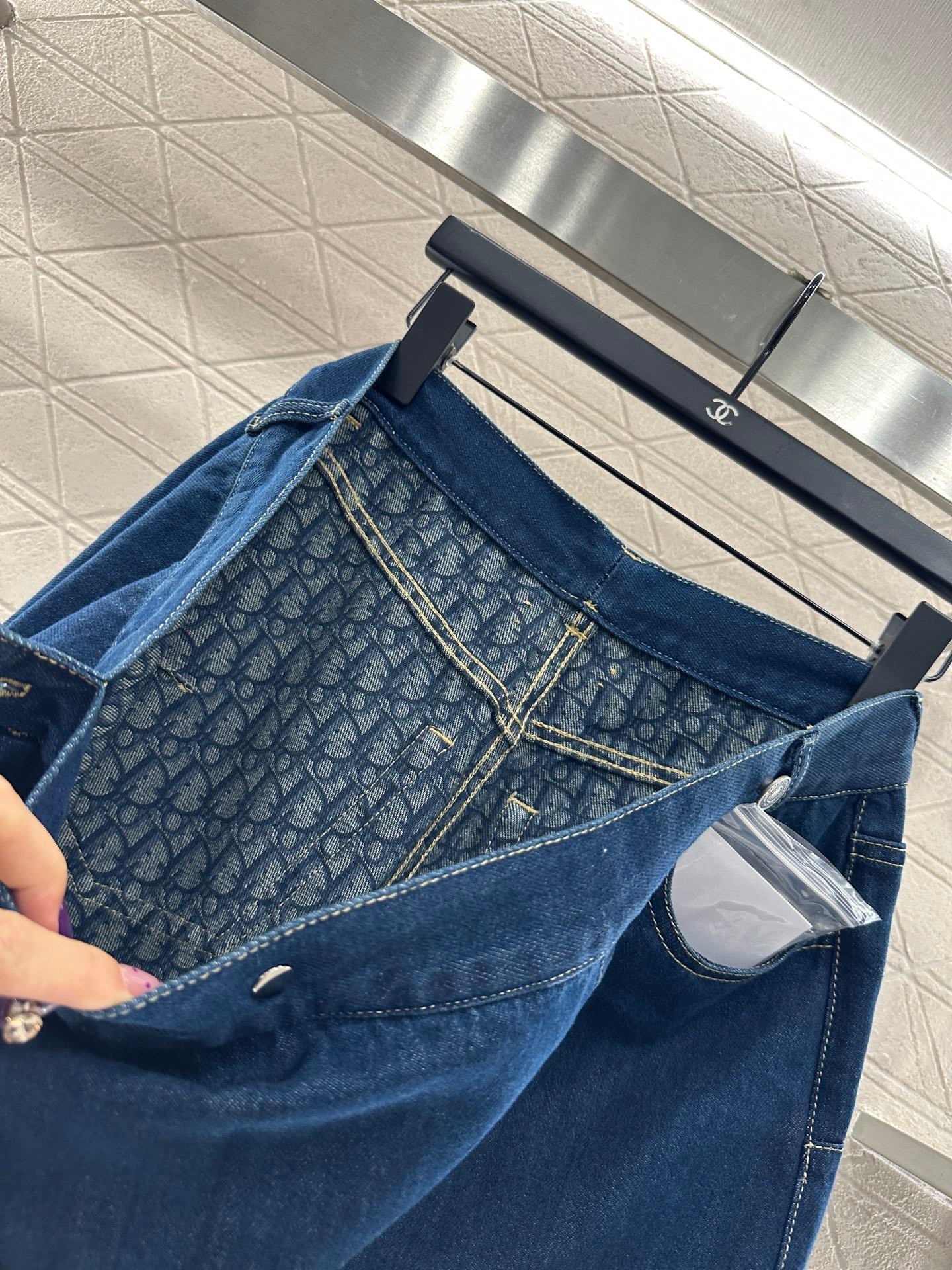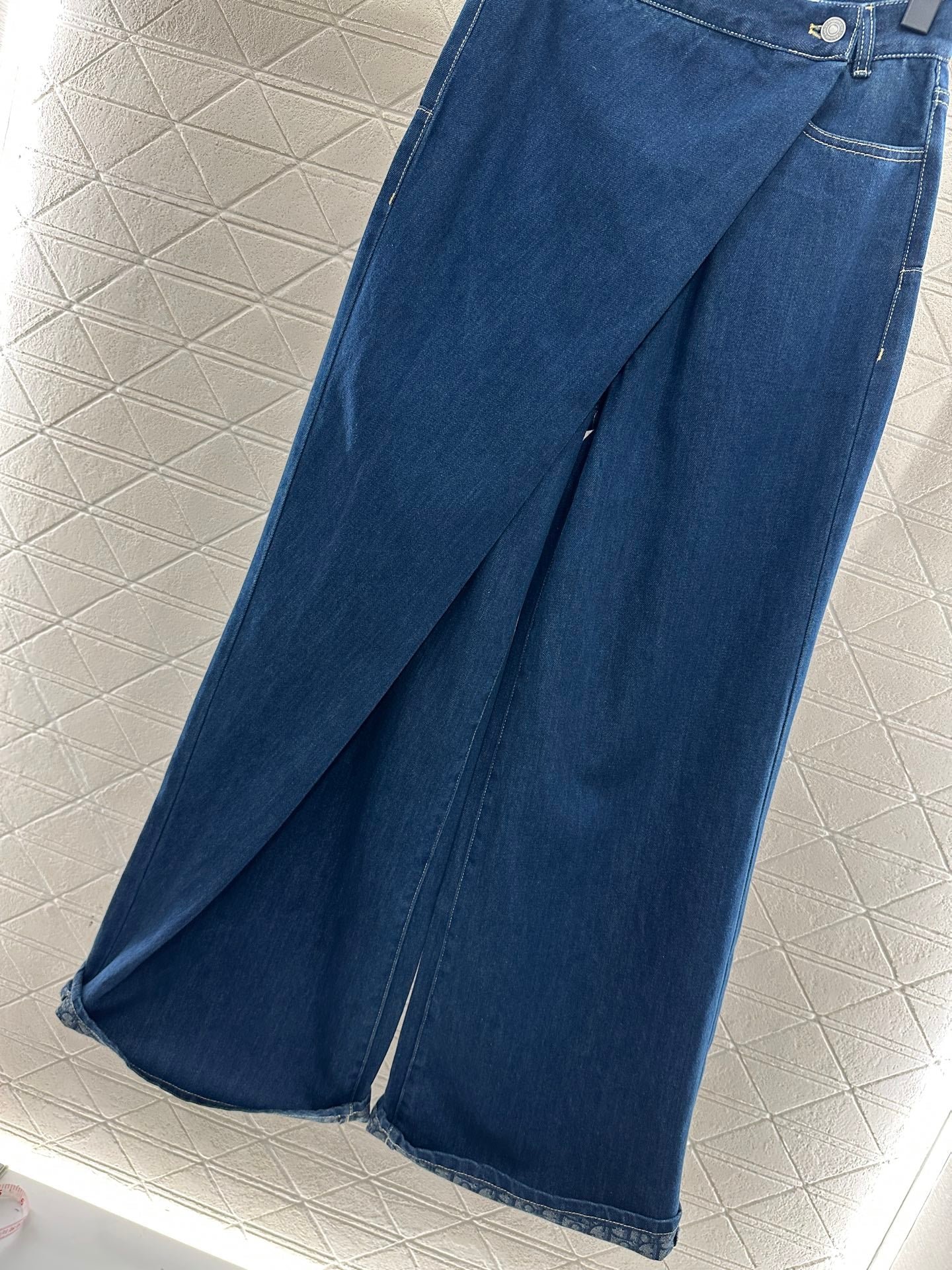 The twill cotton denim material has a crisp texture and a stylish look. It features a wide leg long pants design and is evenly dyed with enzyme water. It is a retro deep blue retro fashion. The front side is covered in a single piece, and the diagonal distribution is fixed on one side of the waist. The deconstructive design is eye-catching and fashionable. The interior is covered with letter patterns, giving it a trendy and old-fashioned look