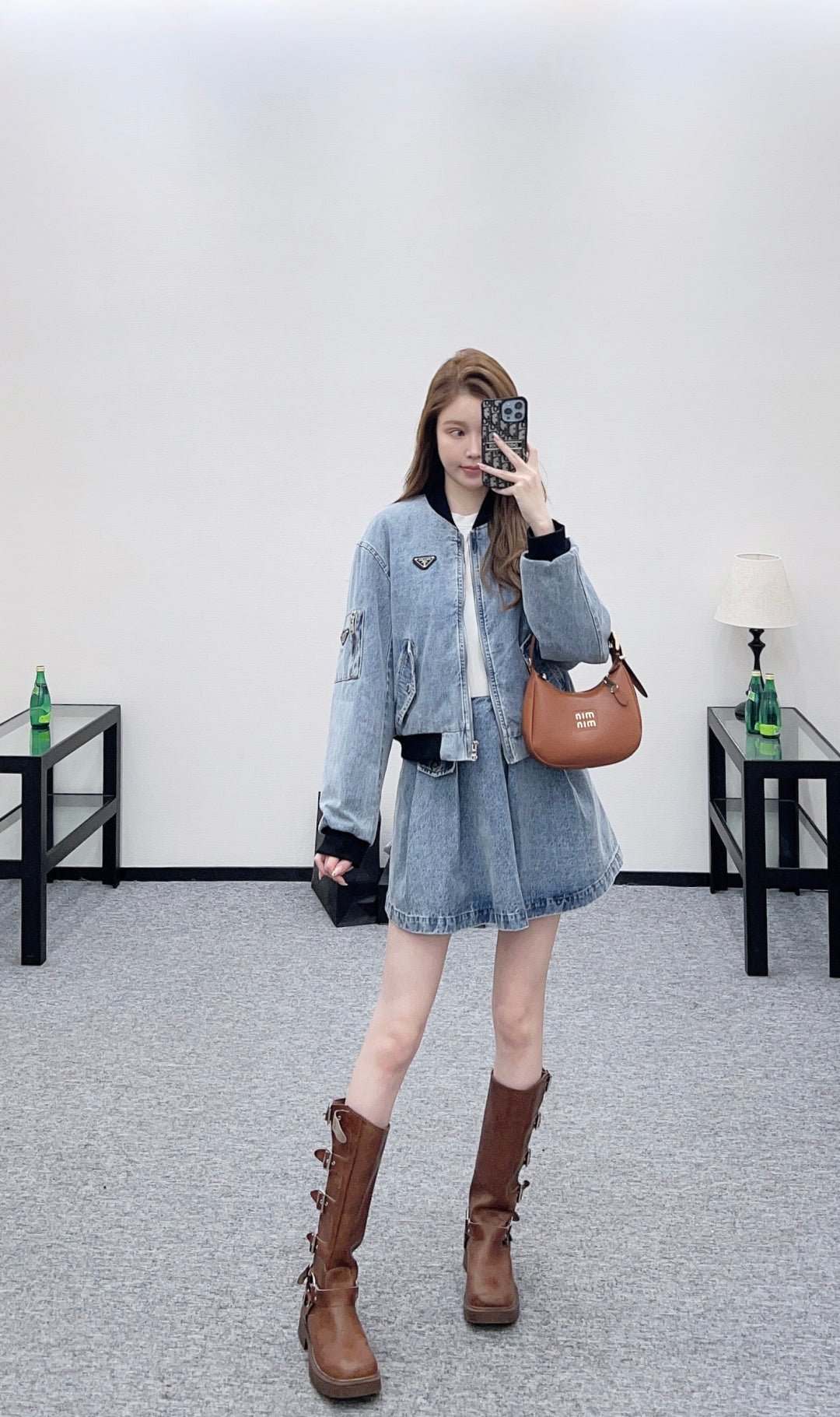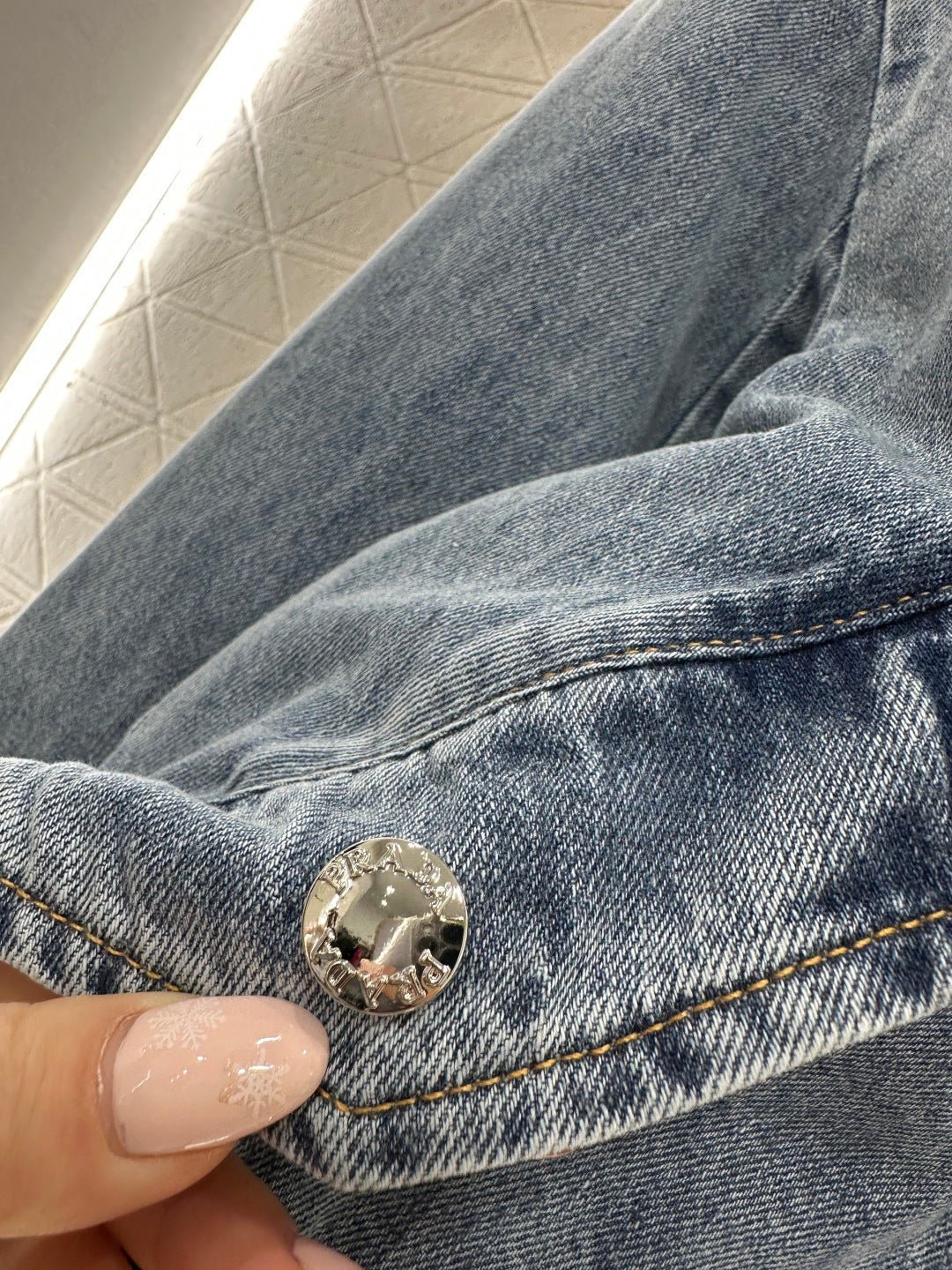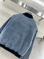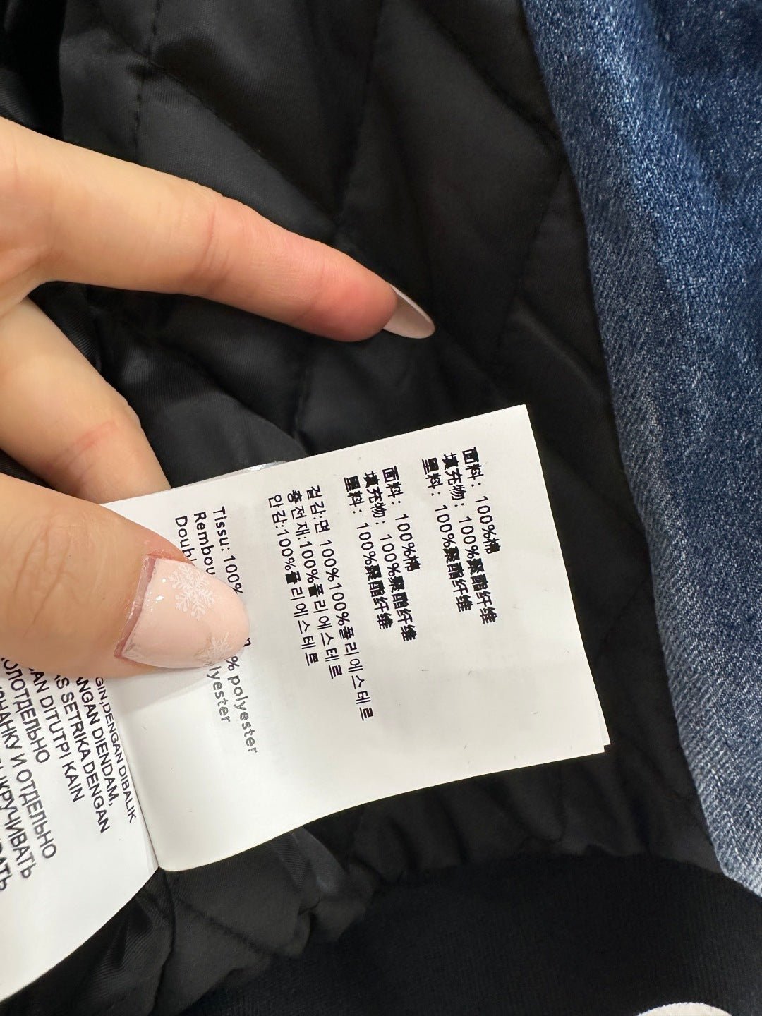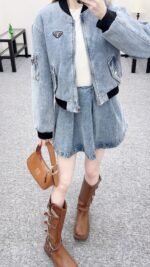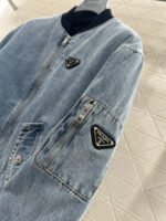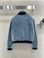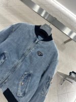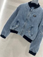 Made from twill denim cotton, this jacket boasts a luxurious sheen, is lightweight and comfortable, and exudes quality. The casual baseball jacket cut features a solid black ribbed trim contrasting with the light-wash denim body. A triangular metal logo on the chest adds a touch of understated luxury and style, creating a retro-chic look. Symmetrical flap pockets enhance practicality, and the overall design is effortlessly chic. The diamond-quilted fleece lining makes it a must-have for warmth in autumn and winter. A sophisticated and fashionable piece.