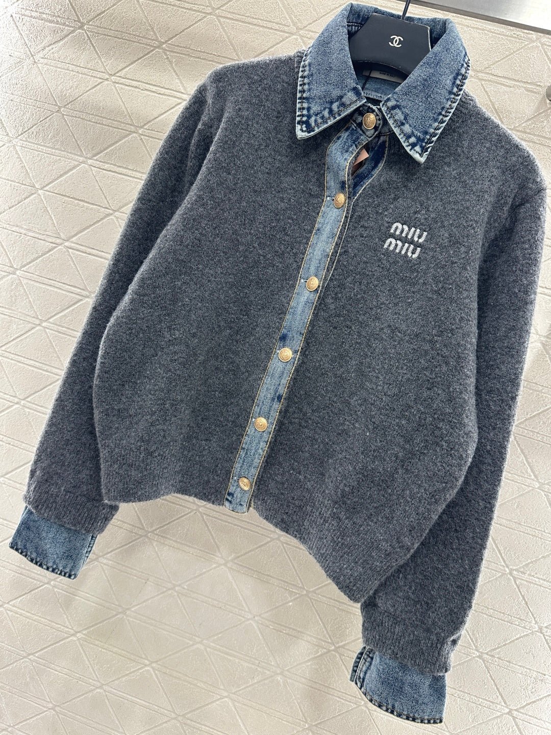 Denim Patchwork Collared Knit Cardigan