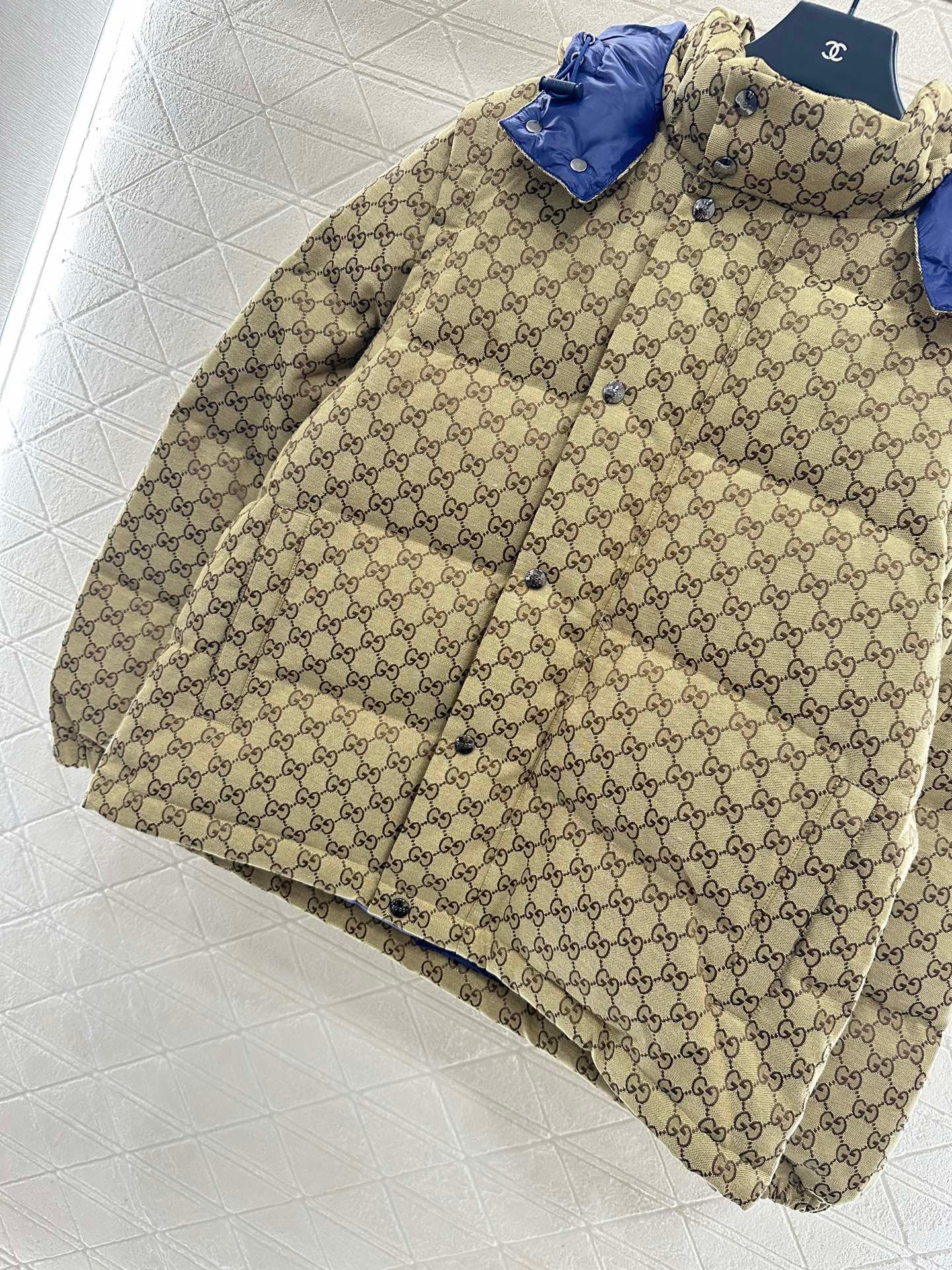 Jacquard material, filled with white goose down, the whole piece is lightweight and warm. It is a detachable hooded down jacket, and the sleeves can also be removed for processing. The practicality of the clothes is maximized, comfortable and easy to wear without appearing bulky, and the wearability is stronger. The rectangular grid texture is matched with the full body double G jacquard letters, presenting a sense of old money and high-end style taste. The blue inside and the outer layer are designed in contrasting colors, forming a layered highlight, integrating warmth and fashion, getting rid of the traditional down bulky. It is the first choice for autumn and winter layering.