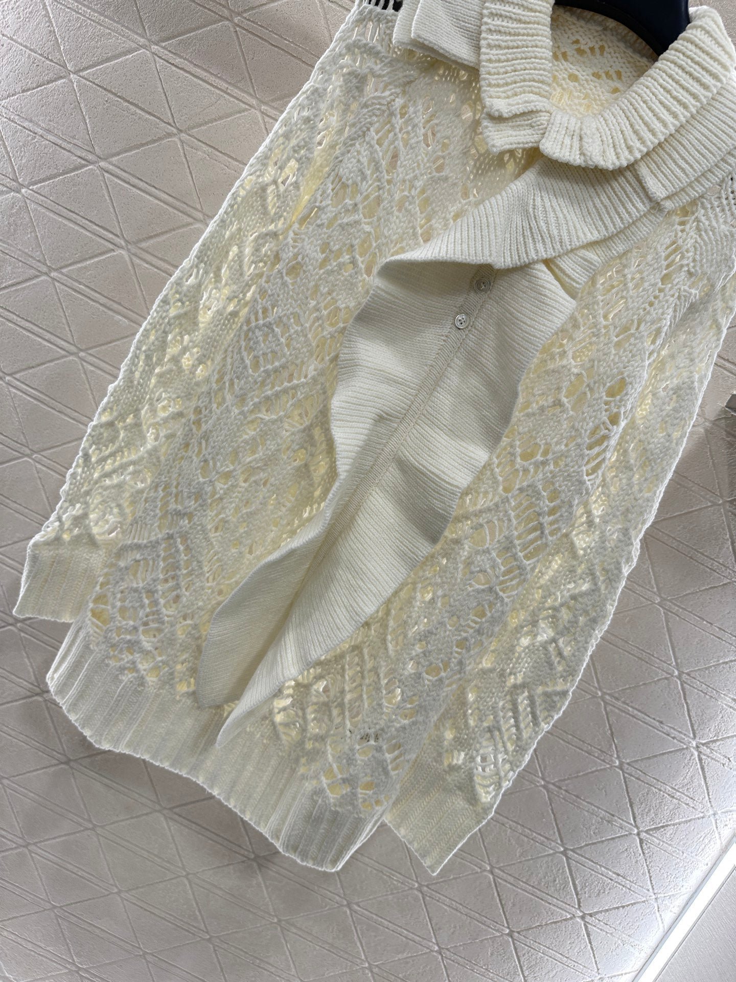 Made of silk and wool yarn material, the texture is comfortable and the drape is stylish. The lace long top is cut with intricate and ornate hollow crochet throughout the body, and the straight tube is comfortable to fold. It easily creates a good proportion and has minimal restrictions on the body shape. The collar edge is folded with fungus lace, which can be disassembled into a front placket ribbon. It is fashionable and versatile to create a relaxed and casual look, adding a touch of fashion. Satisfy various commuting and dating needs, and dress more youthful and stylish.
