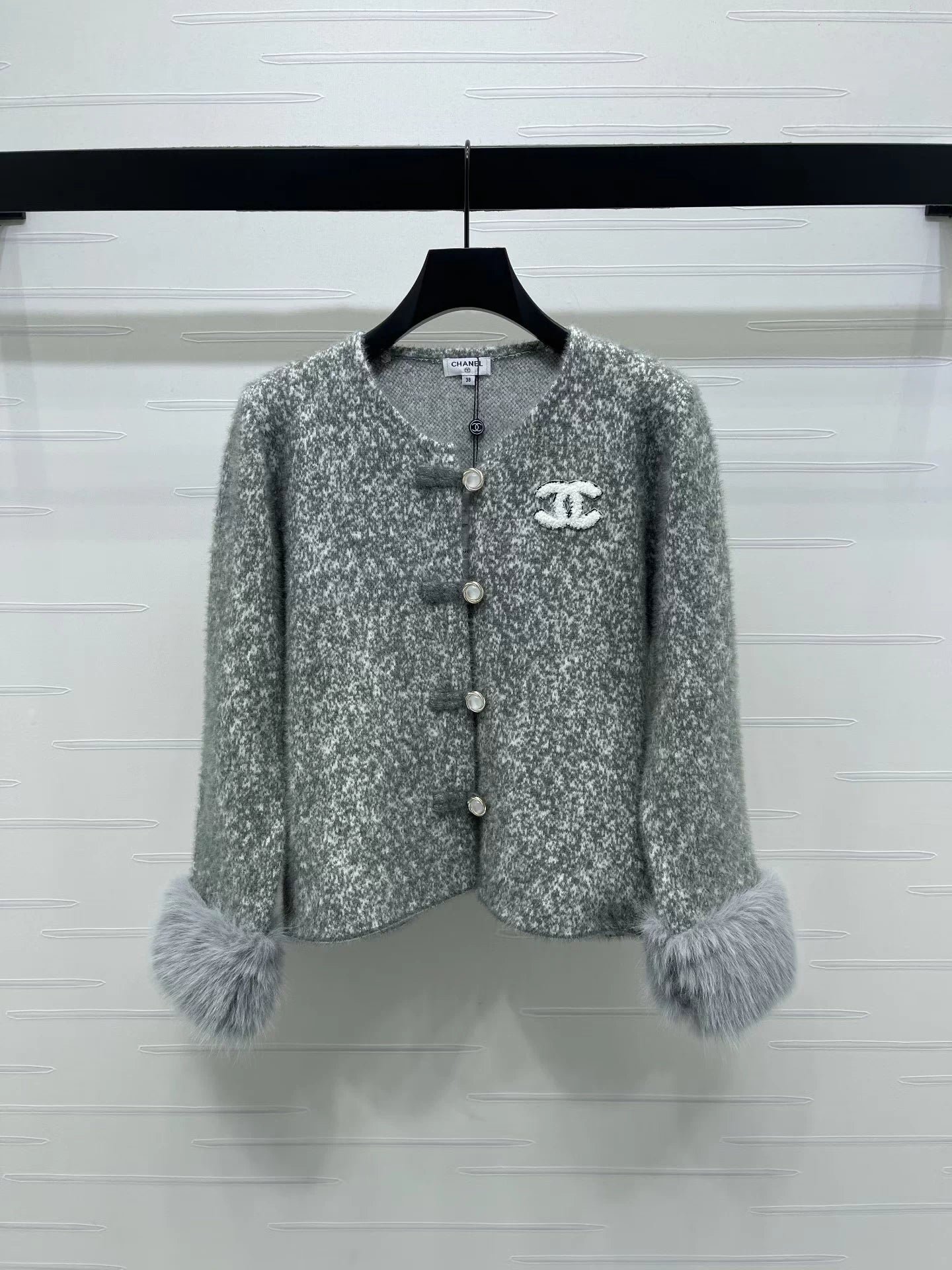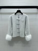 wool ➕ Made of mohair knit material, with a glossy texture and comfortable drape, straight cut, matched with moderate length, it creates a Chinese socialite effect. The color of the open button echoes, giving it a strong sense of weight. The detachable fur cuffs highlight the design and exude a fashionable temperament