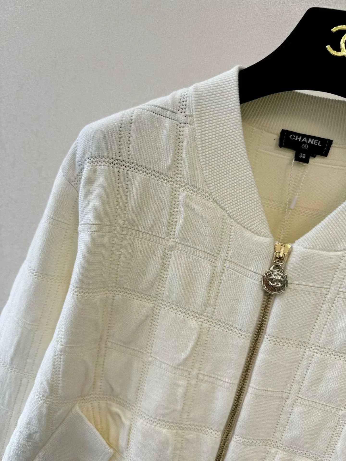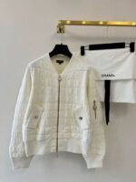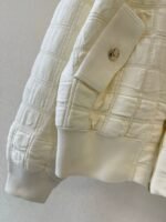 Classic diamond grid pattern, gold zipper and double C logo, metal buckle cuffs, double chest pockets, exquisite details. The fabric consists of 47% mulberry silk, 41% cotton, 6% polyamide, 5% polypropylene, and 1% spandex, providing a comfortable touch and versatile for autumn and winter.