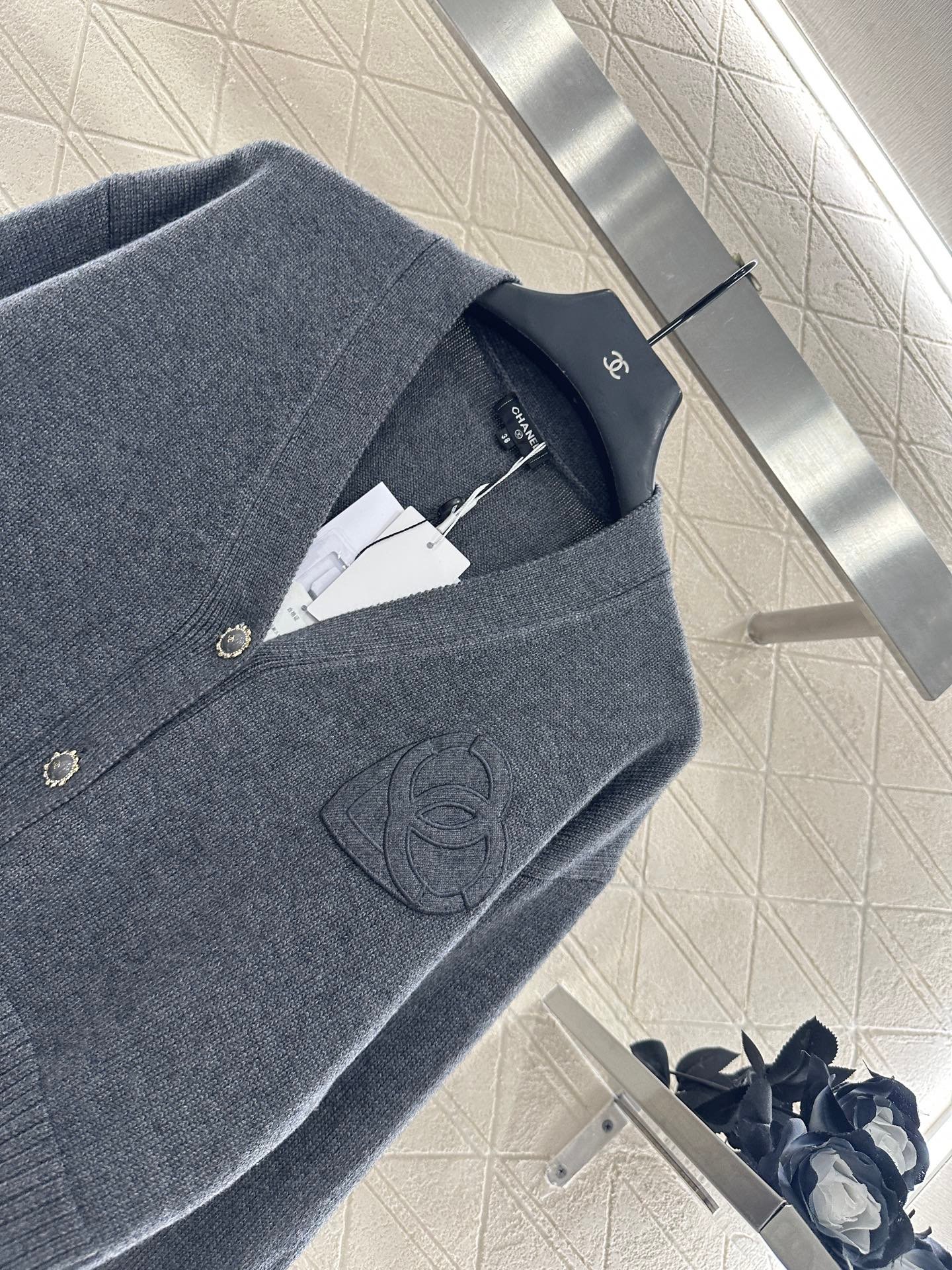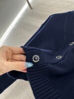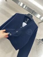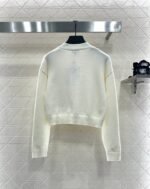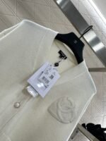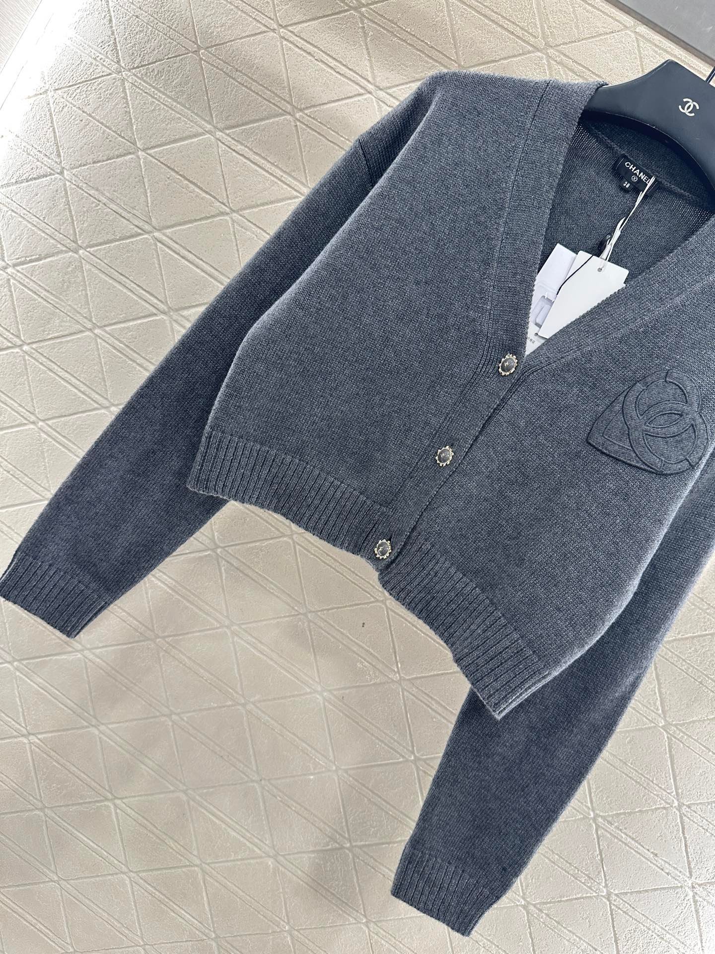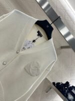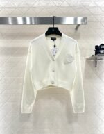 Woolen yarn weaving, delicate texture, comfortable and easy to wear, V-neck short knitted cardigan, embellished with molded flower double C front twist button, exposed skin to enhance shoulder and neck lines, while adding delicacy. The chest is decorated with three-dimensional relief double C logo, combined with a heart-shaped pattern, sweet and full of vitality, showing fashionable dressing, breaking the dull atmosphere of autumn and winter, and wearing a high-end and stylish style.