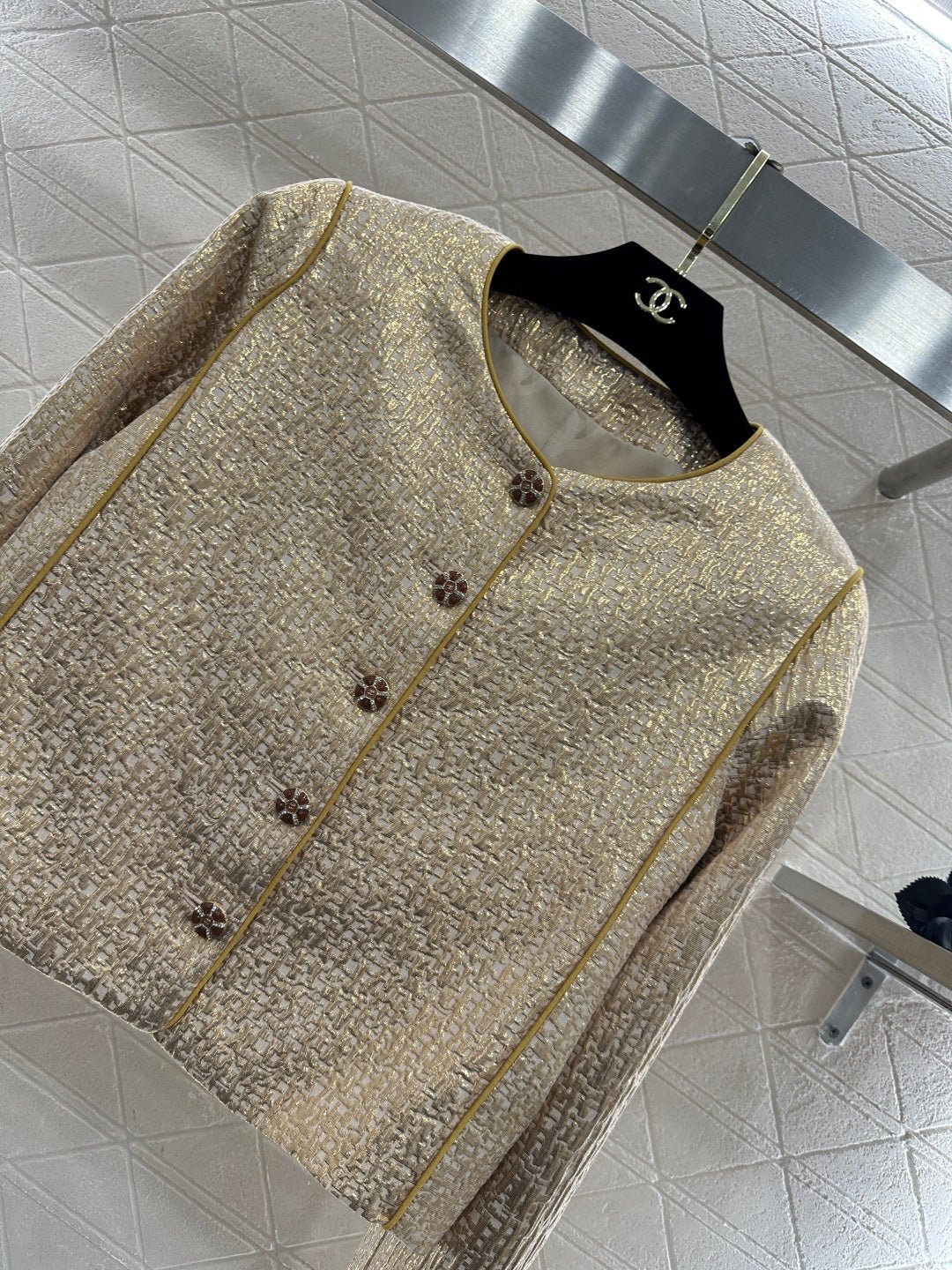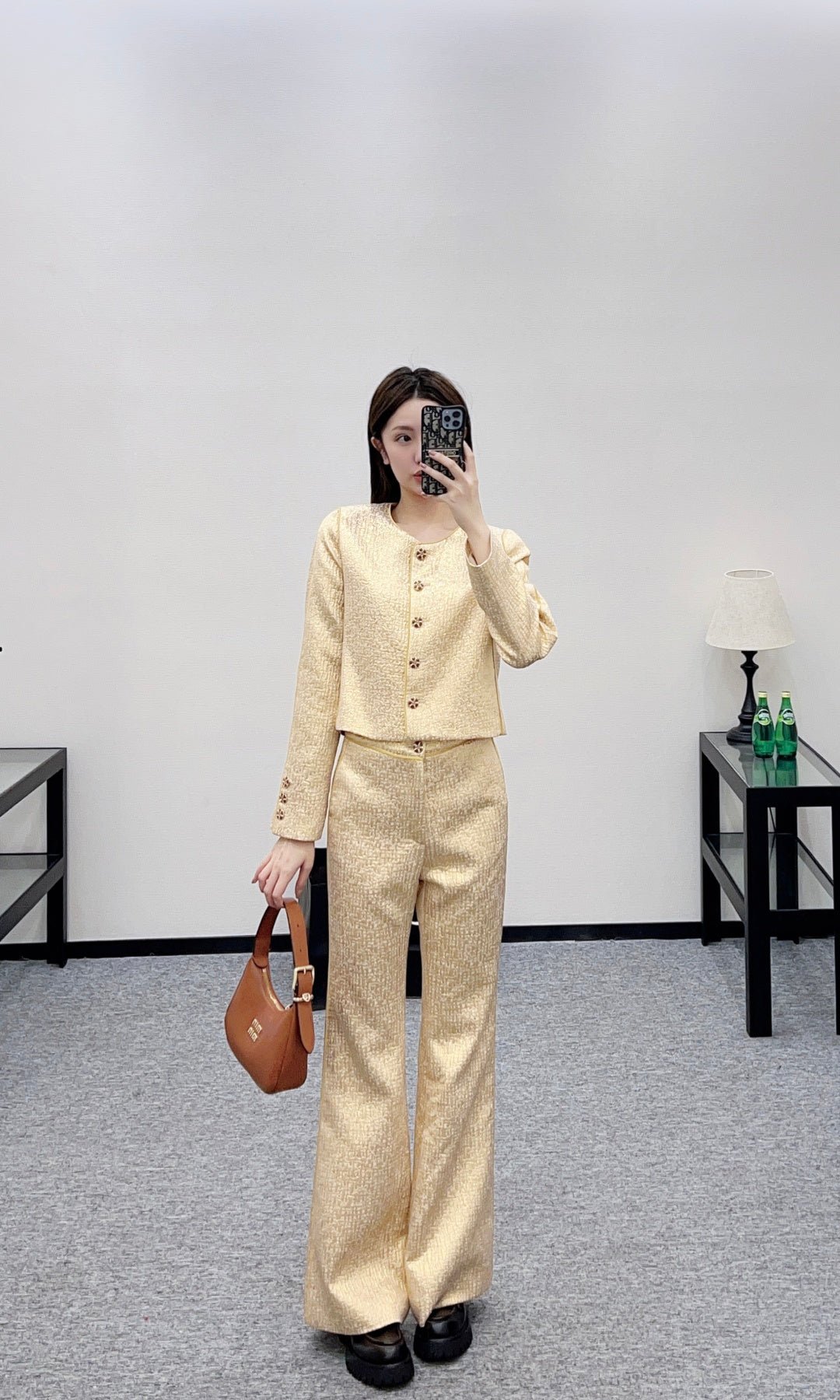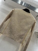 Crafted from silk-wool blend fabric with a luxurious texture, this cropped jacket exudes style and sophistication. Paired with tailored trousers, the ensemble strikes the perfect balance between elegance and refined luxury! The pleated texture creates a cut-out effect with golden sheen, luxurious and sophisticated. The cropped jacket pairs perfectly with slightly flared trousers. The stand-up collar design is sharp and elegant. Worn as a set, it exudes luxury and fashion; worn separately, it unlocks multiple styles. This is an essential piece for creating an elevated springtime vibe.