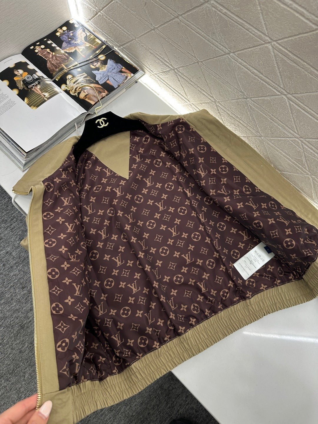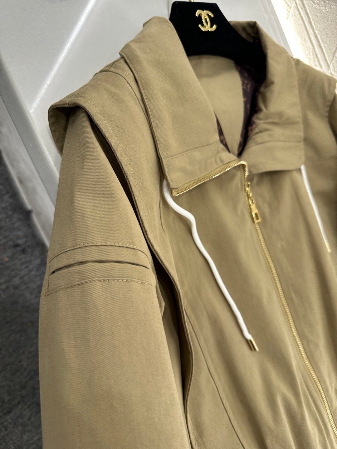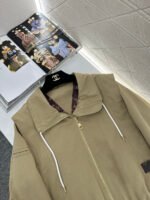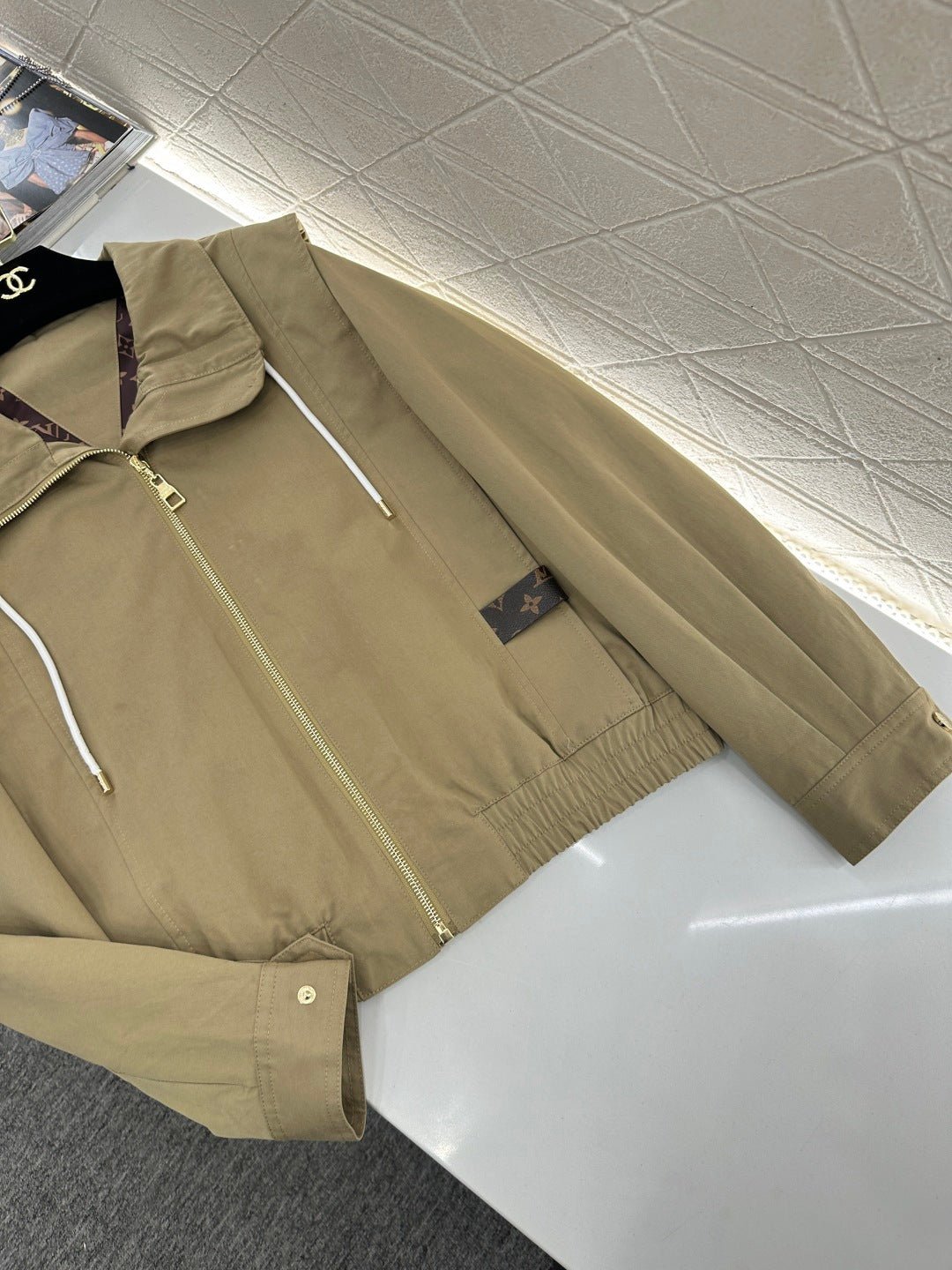 Twill cotton trench fabric offers subtle stretch for comfort while providing wind resistance and structure. Short-length lapel zip-up jacket silhouette, featuring structured shoulders and slightly flared sleeves. The faux two-piece shawl collar creates rich layering, while the drawstring neckline paired with a metallic zipper delivers sharp, stylish appeal. Subtle embossed LOGO labels on the sides add understated sophistication. The crisp cotton fabric inherently possesses a clean, sharp texture, and the drawstring detail on this cropped jacket lends a carefree, effortless vibe.