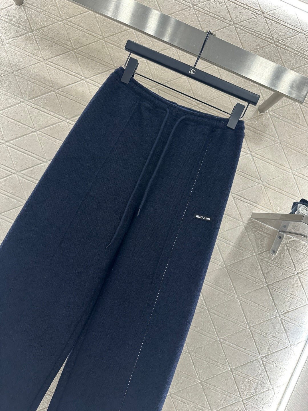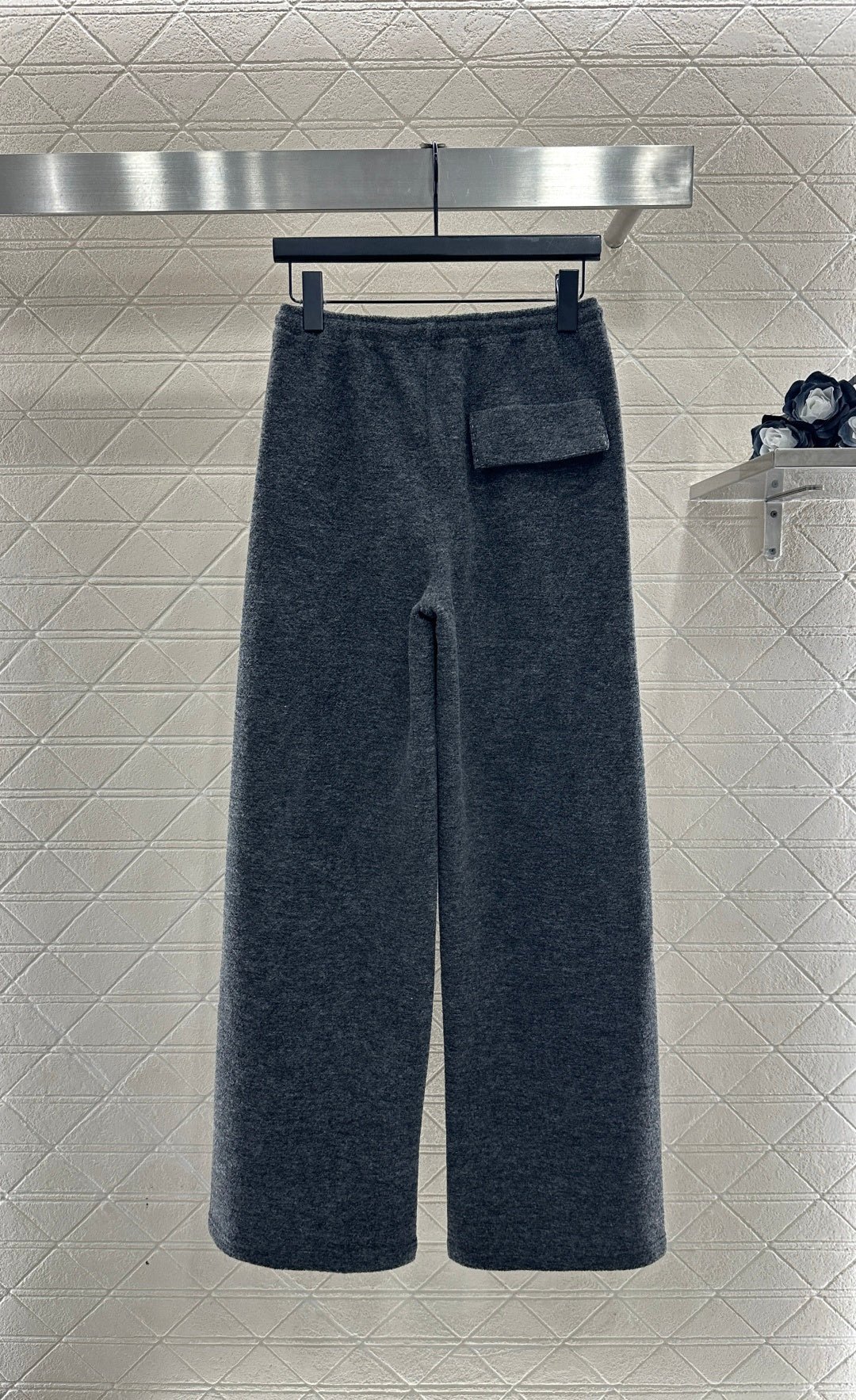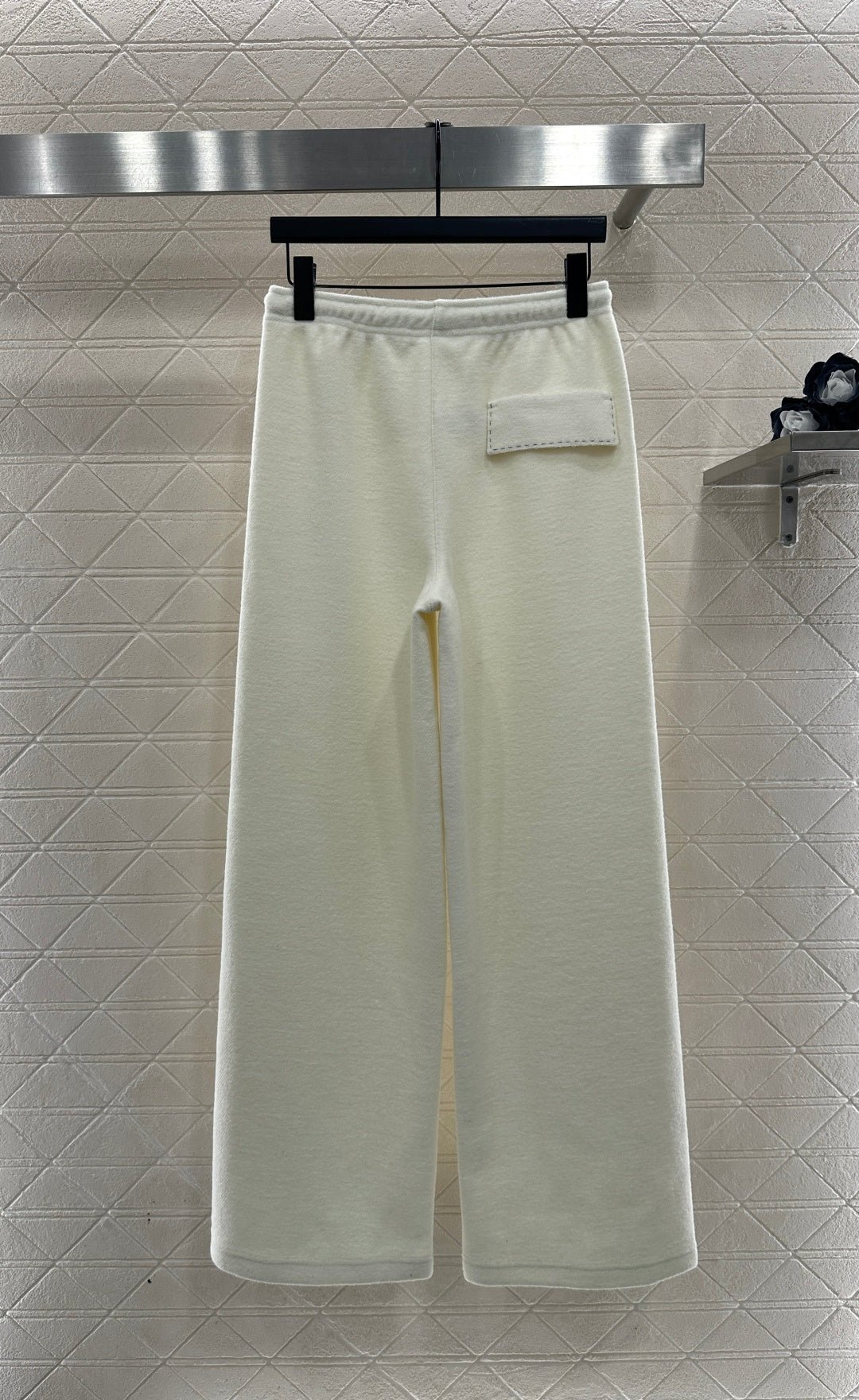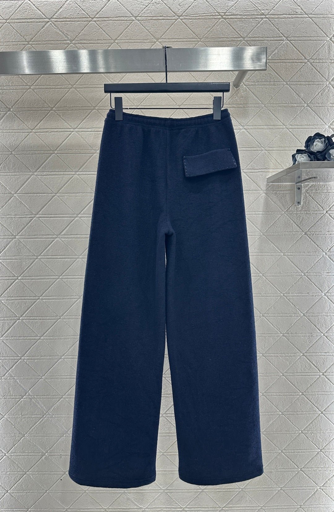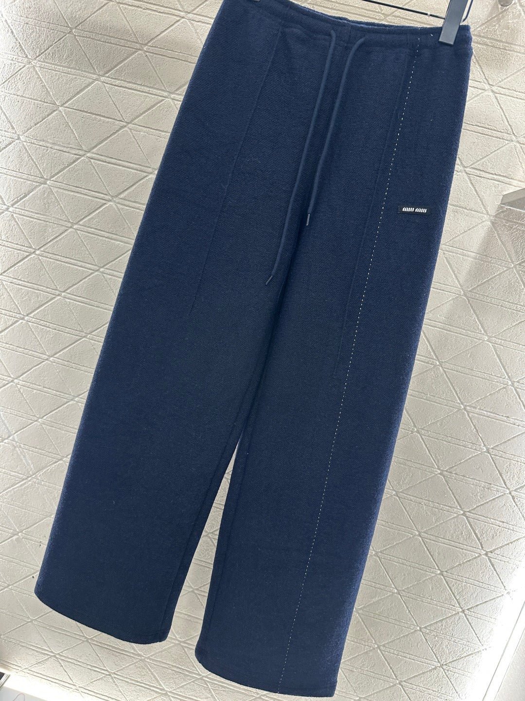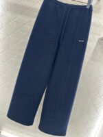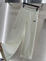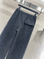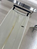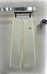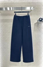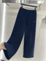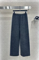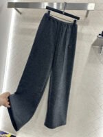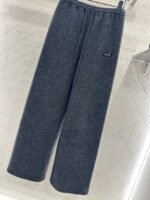 Made from a wool blend, this sturdy fabric offers comfortable warmth and is perfect for autumn and winter. The high-waisted, drawstring wide-leg trousers feature embroidered vertical dotted lines symmetrically distributed along the leg axis for a visually straightening effect. The attention to detail, including the logo at the waist, creates a relaxed yet stylish look, instantly elevating the brand’s image. Effortlessly versatile, these trousers are perfect for transitional seasons, vacations, dates, and everyday wear.
