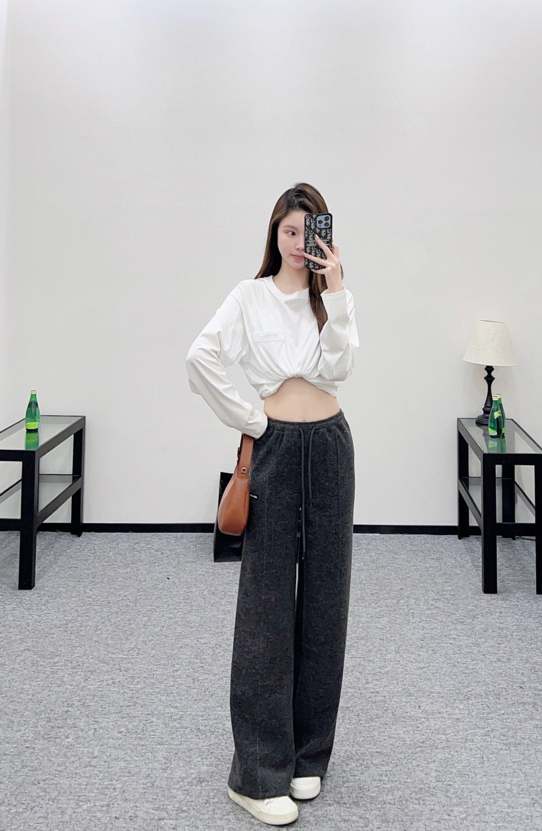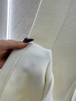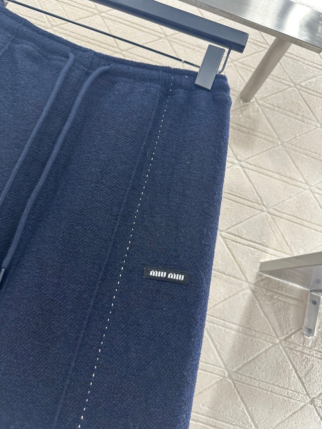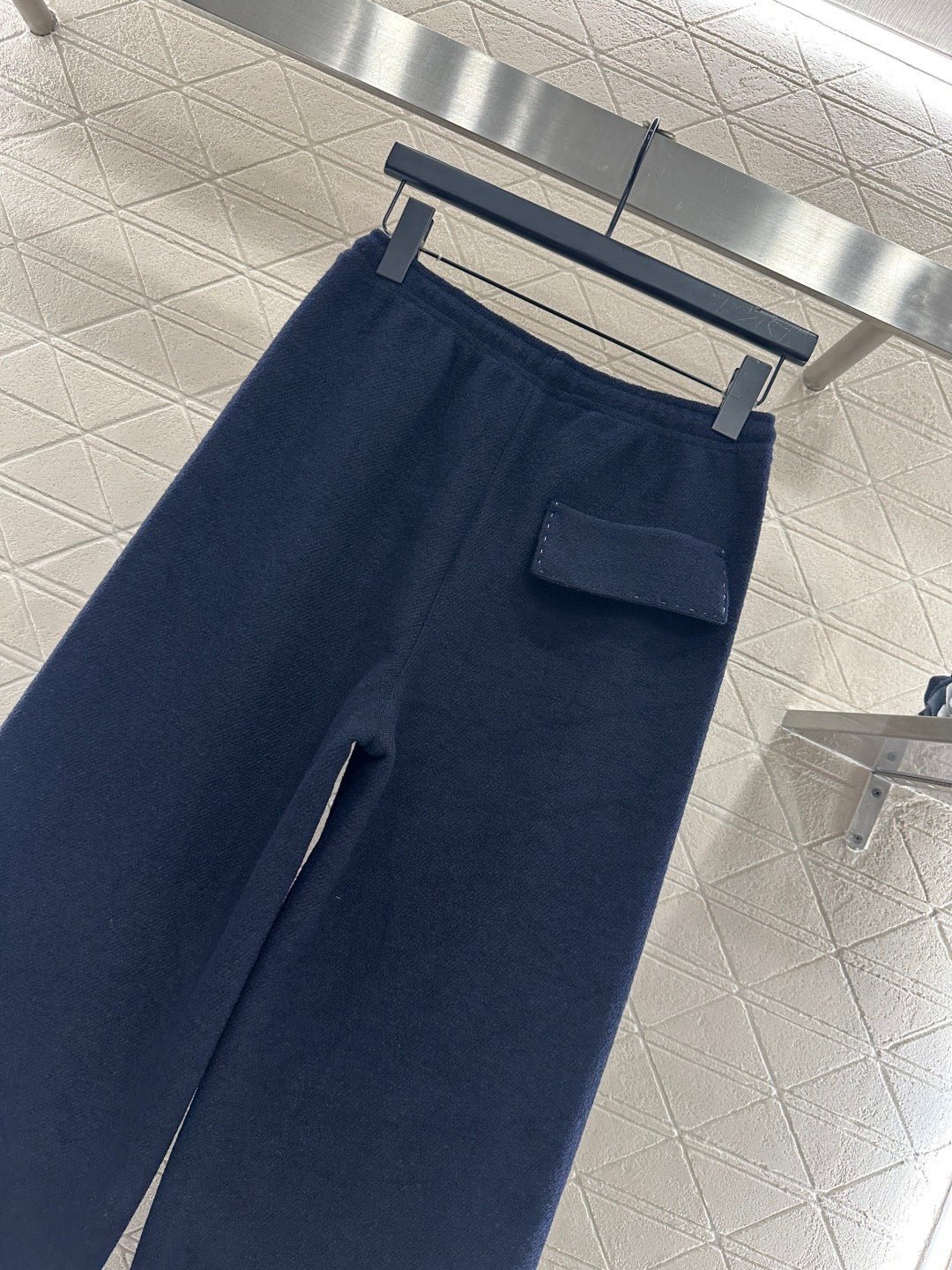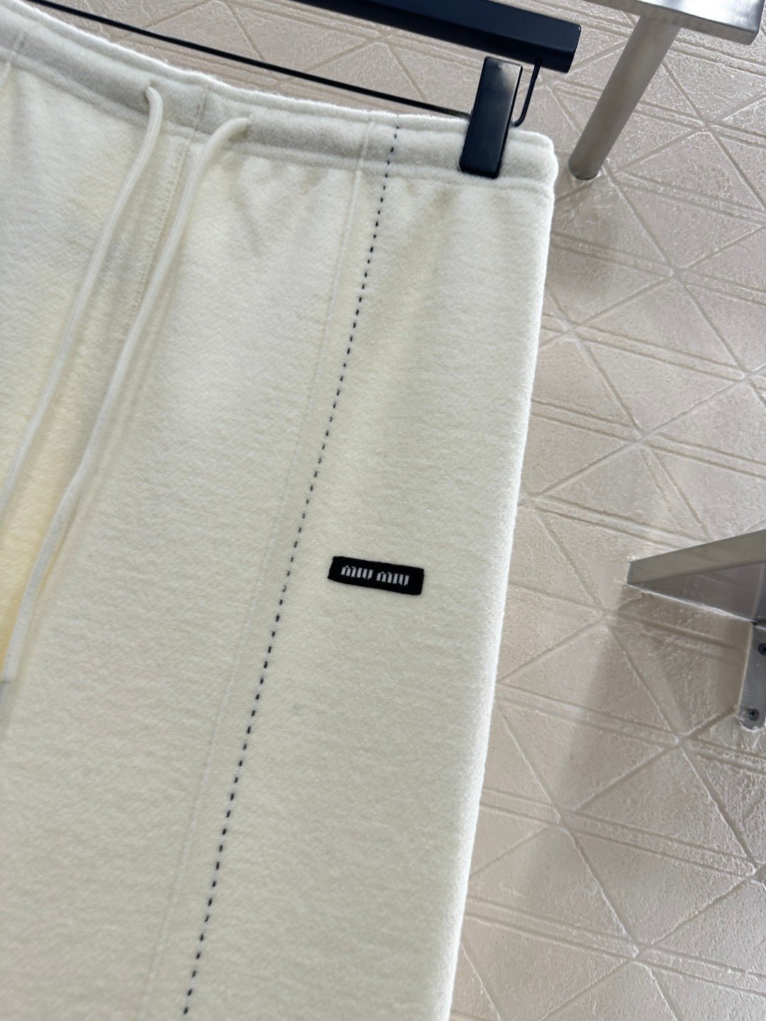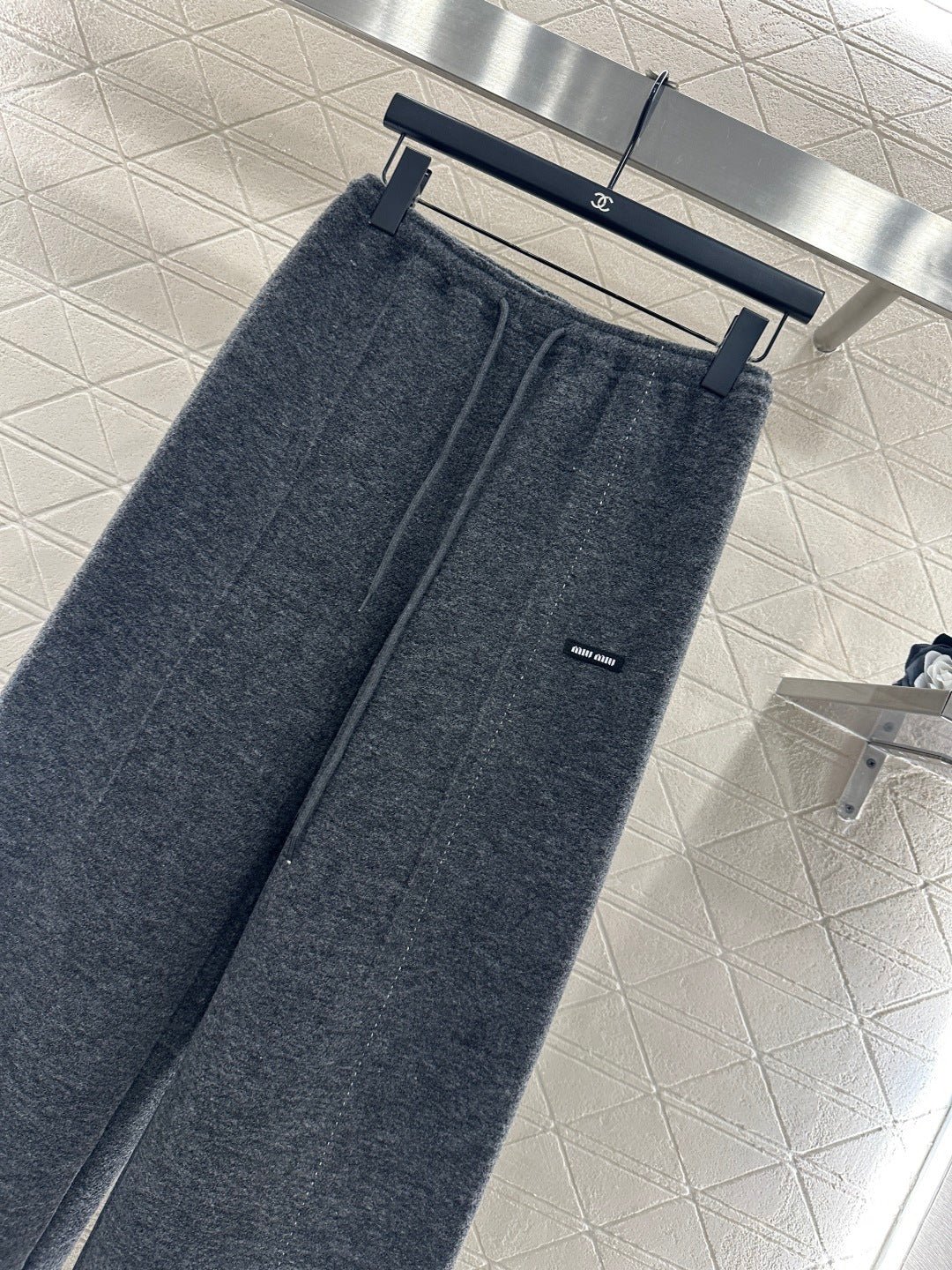 Made from a wool blend, this sturdy fabric offers comfortable warmth and is perfect for autumn and winter. The high-waisted, drawstring wide-leg trousers feature embroidered vertical dotted lines symmetrically distributed along the leg axis for a visually straightening effect. The attention to detail, including the logo at the waist, creates a relaxed yet stylish look, instantly elevating the brand’s image. Effortlessly versatile, these trousers are perfect for transitional seasons, vacations, dates, and everyday wear.