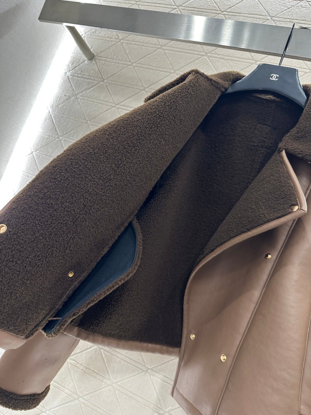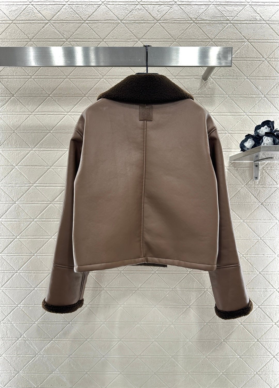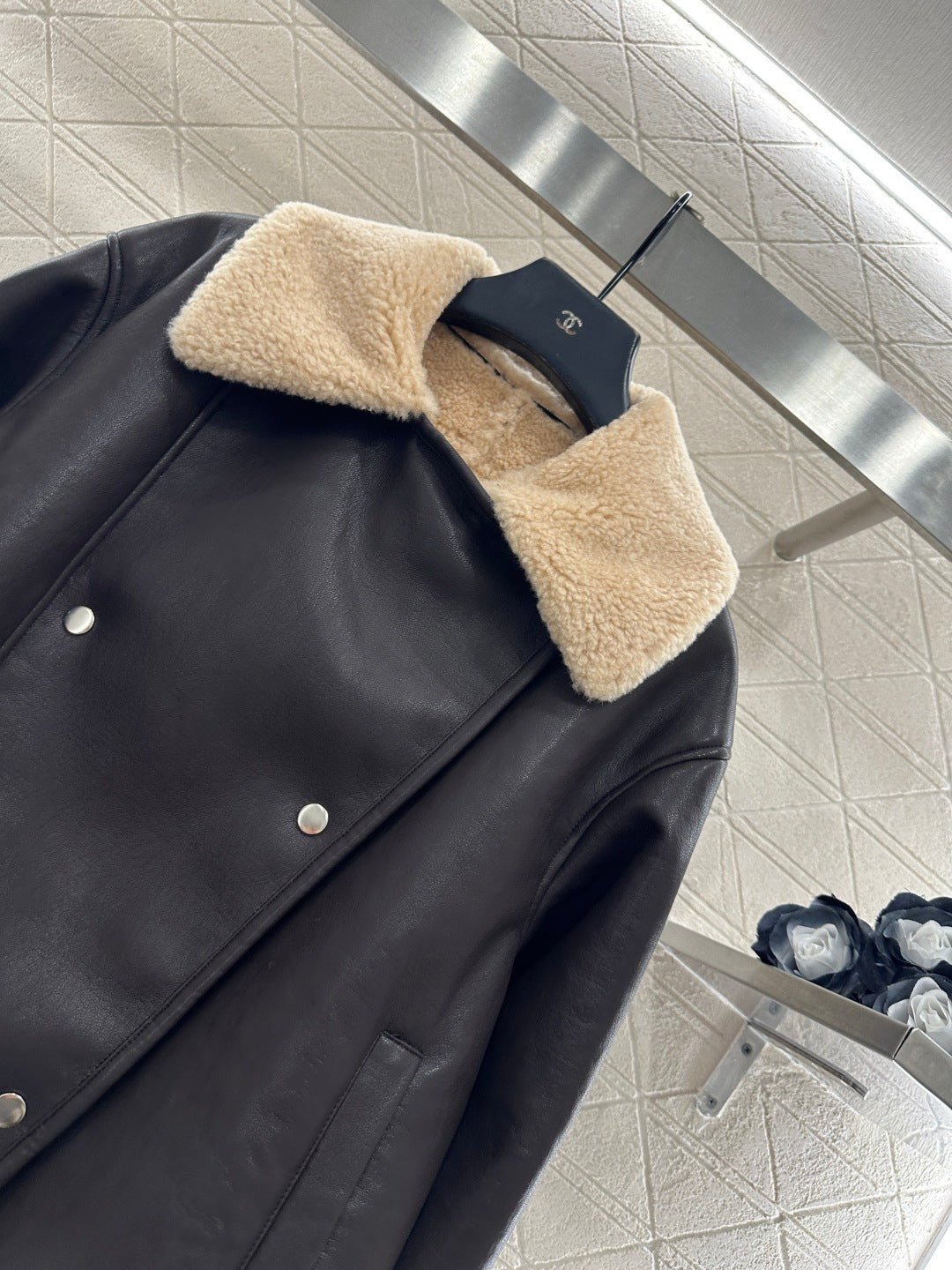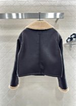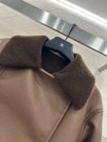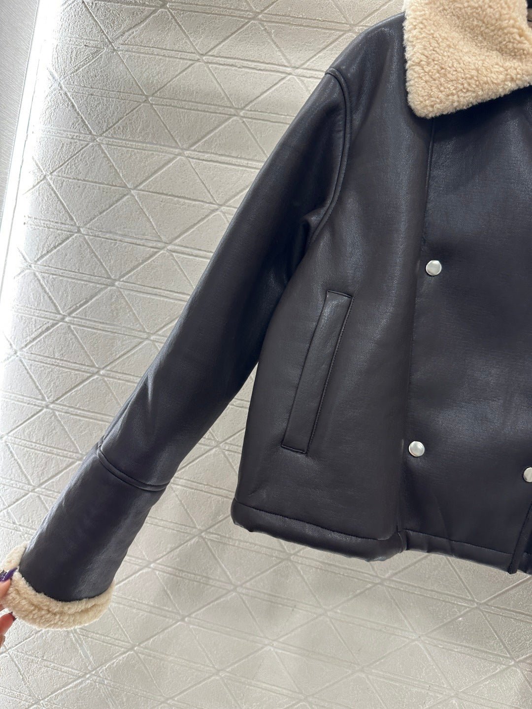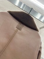 Made from eco-friendly shearling material, the outer layer is made of soft, smooth leather for warmth, while the inner lining features warm and durable teddy bear fleece. The fleece is exposed through the folded-down collar and cuffs, creating a striking contrast in color and fabric with the body, resulting in a highly stylish design. The double-breasted design allows for two different looks with buttons, and the distinctive lettering on the back collar adds dimension. The overall look is effortlessly chic and stylish, perfect for pairing with any autumn/winter outfit.