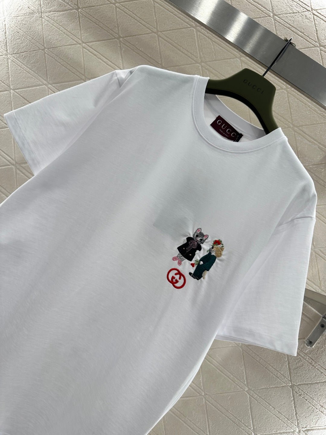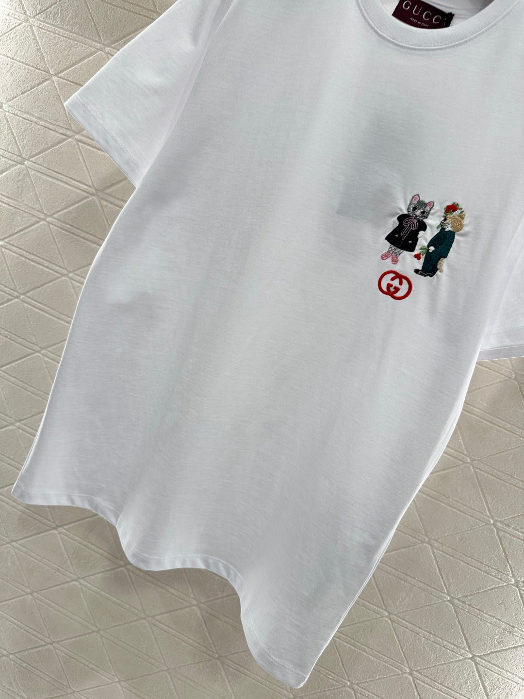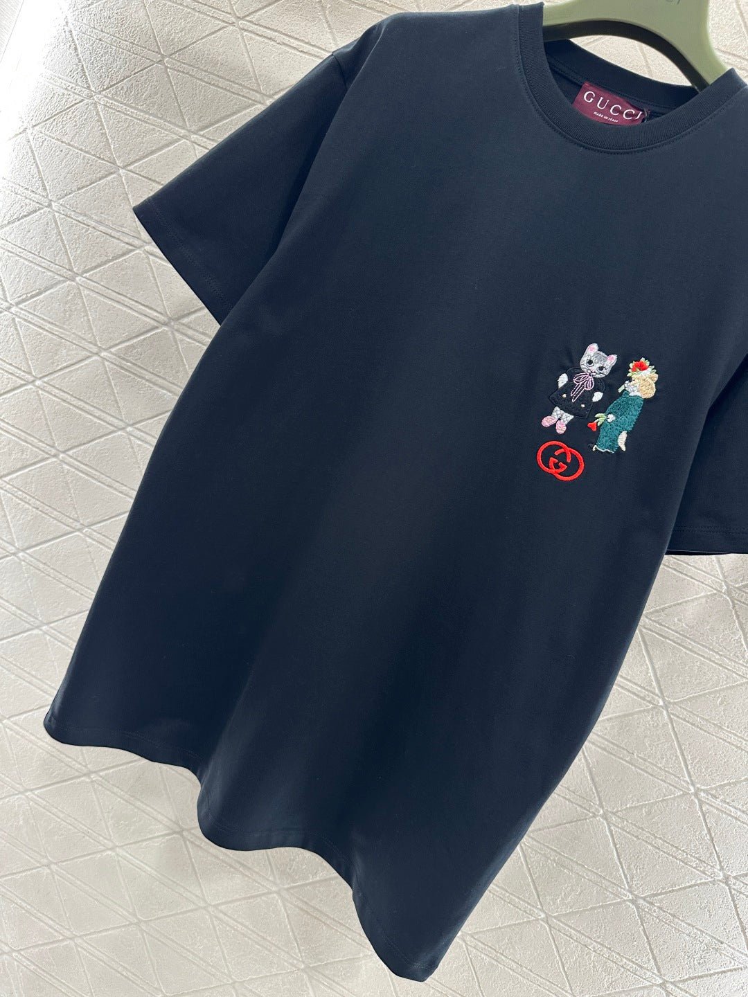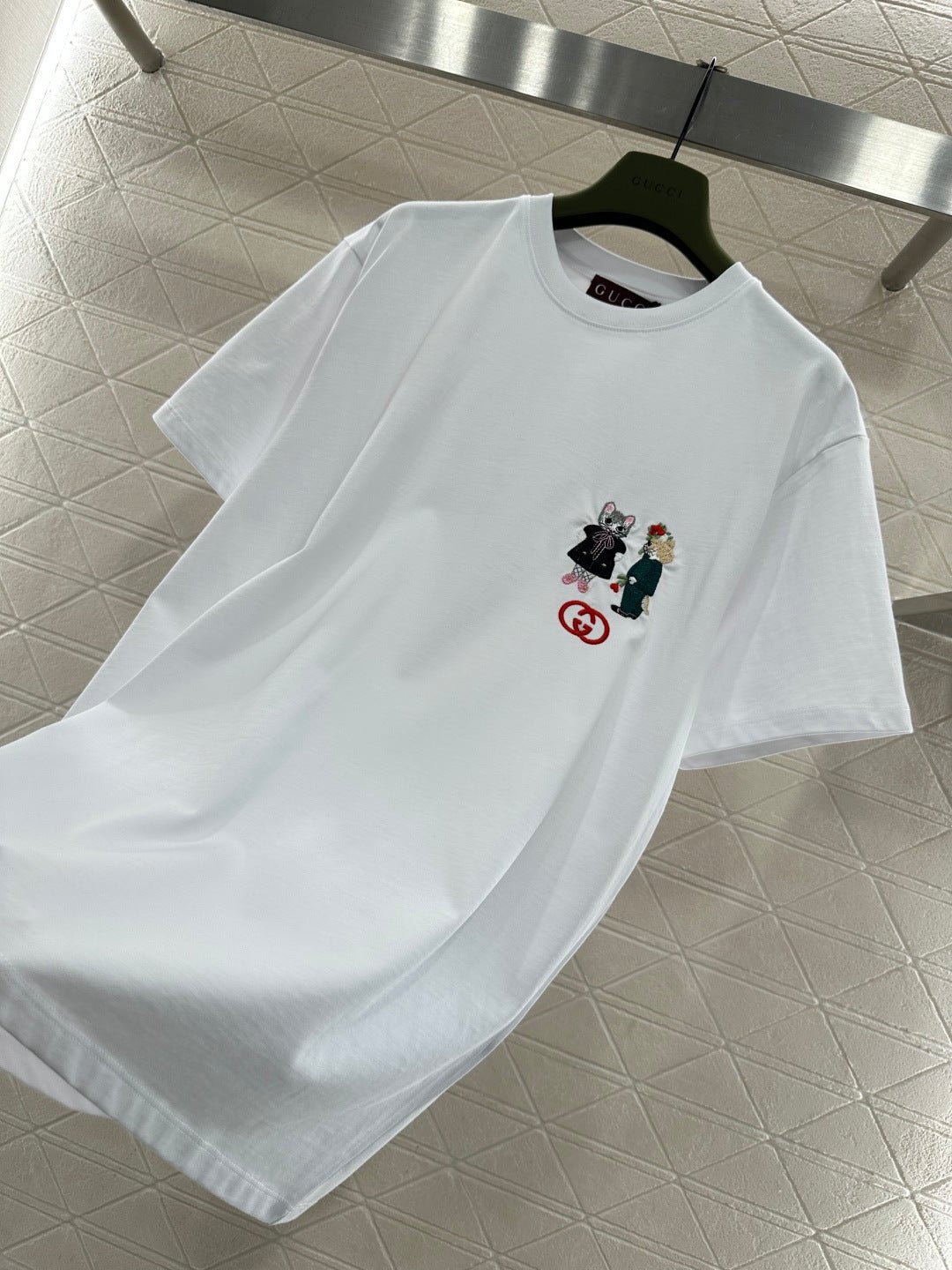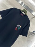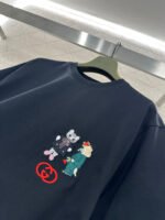 Made of 100% cotton, this fabric boasts a delicate texture, is comfortable and breathable, and features a relaxed short-sleeved cut that highlights the brand’s style. The high-quality cotton material has a luxurious sheen, and the embroidered double-G logo on the chest, along with a cute cat cartoon pattern, adds a refreshing and youthful touch. The loose fit ensures a relaxed and fashionable look.