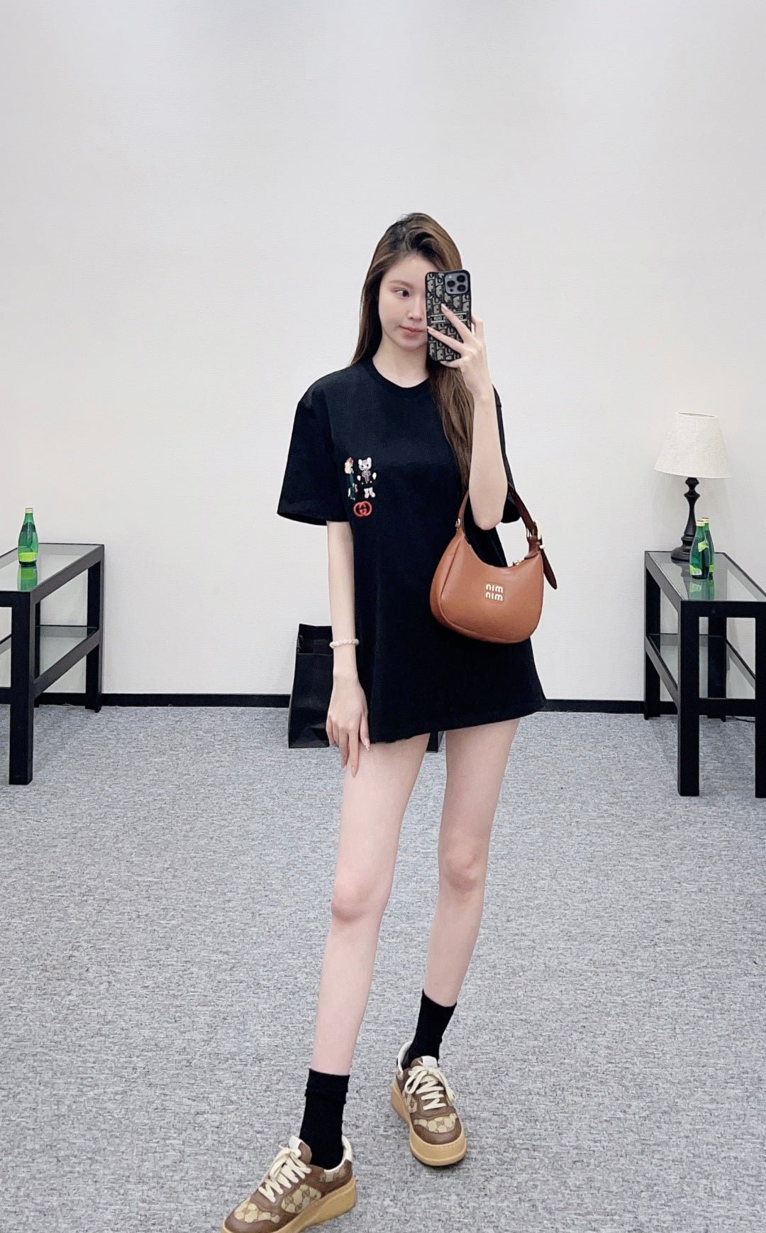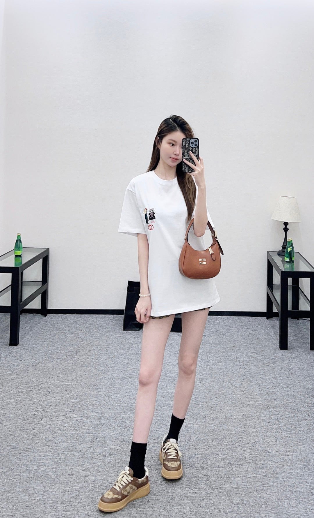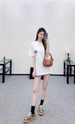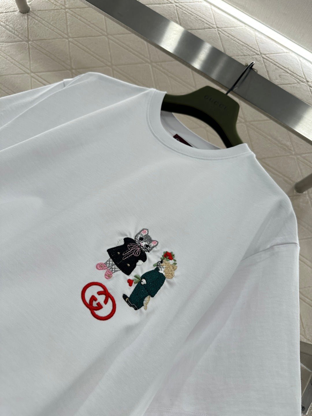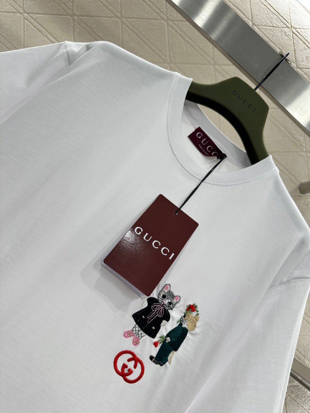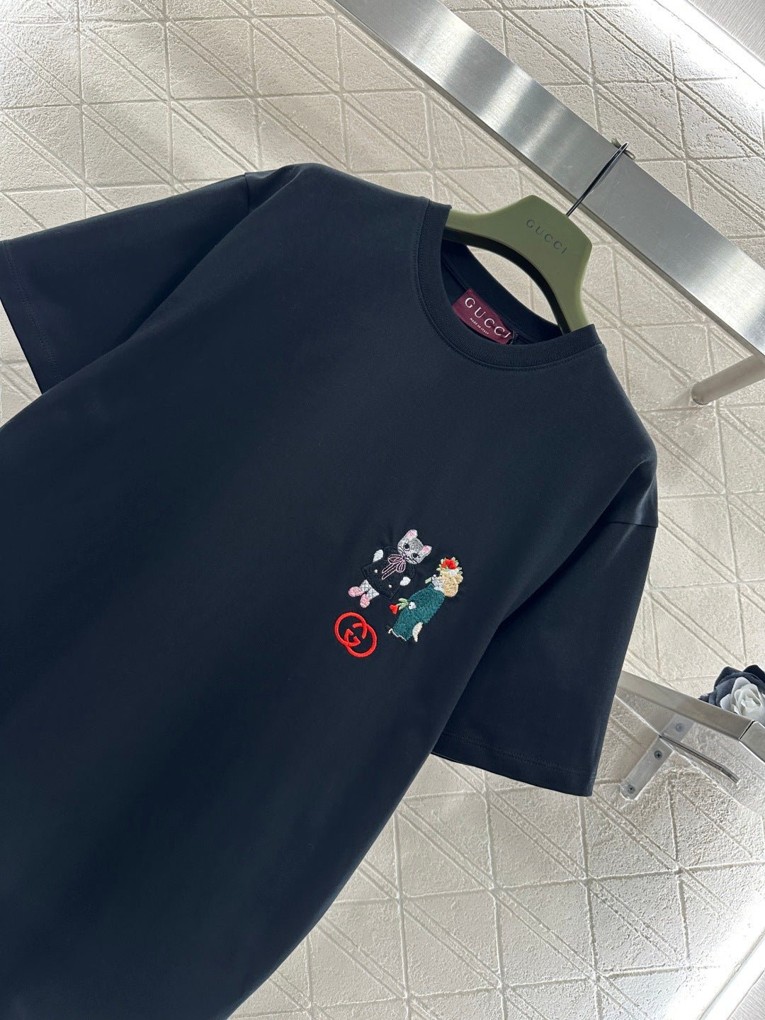 Made of 100% cotton, this fabric boasts a delicate texture, is comfortable and breathable, and features a relaxed short-sleeved cut that highlights the brand’s style. The high-quality cotton material has a luxurious sheen, and the embroidered double-G logo on the chest, along with a cute cat cartoon pattern, adds a refreshing and youthful touch. The loose fit ensures a relaxed and fashionable look.