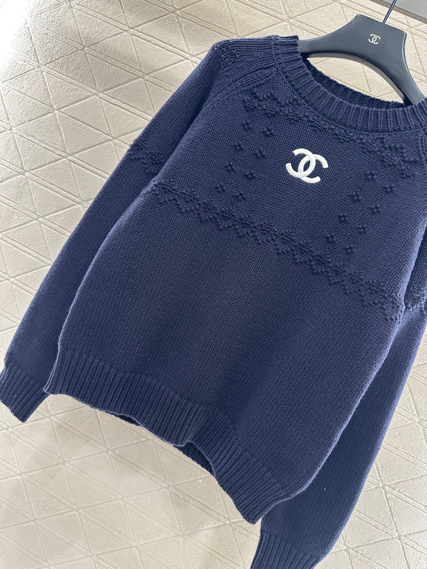 Woolen yarn weaving, delicate and soft, comfortable and warm to wear, round neck knitted pullover sweater version, with elastic grooves and threaded edges to narrow, solid color throughout ➕ Embroidered details such as triangular serrations are interspersed above the chest, and the chest is decorated with double C letters. The overall design is high-end and casual, creating a fashionable tone and creating a stylish and fashionable style