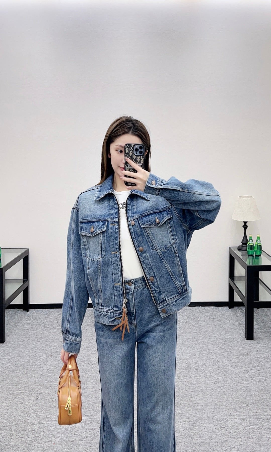 Crafted from twill cotton denim with a refined texture, this double-zip jacket delivers a structured silhouette. The distressed wash lends an inherent vintage filter, while the cropped length creates a sharp, flattering proportion. Pair it with matching wide-leg pants to conceal curves and elongate the legs. Zipper and leather cord details add edgy flair. Worn as a set, it exudes effortless sophistication with a touch of aristocratic flair. Mix and match with knits or tees for diverse looks. Step out in spring wearing this jacket to effortlessly achieve an outfit that blends sweetness and edge.