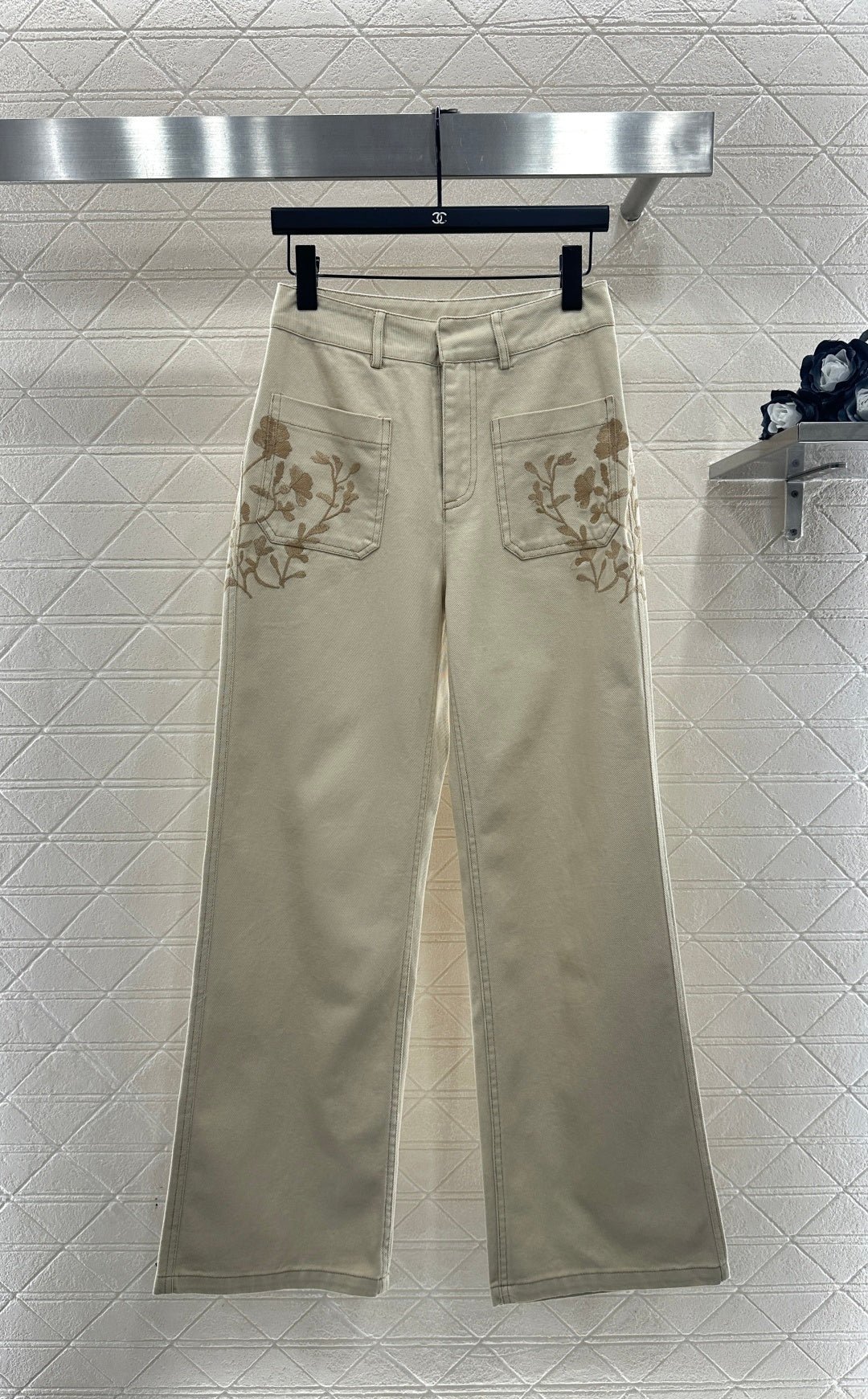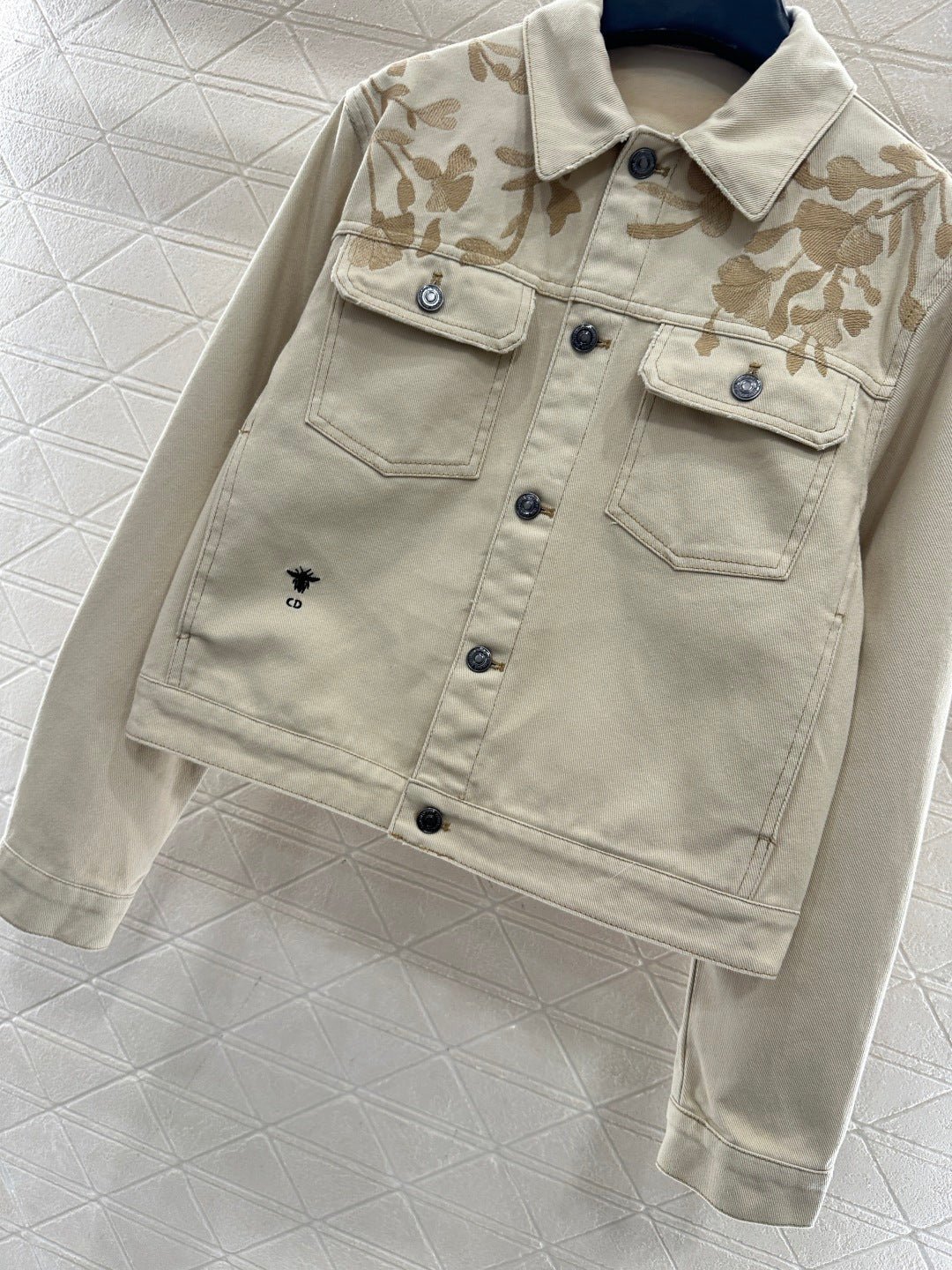 Made from twill cotton denim with multiple washes, this jacket boasts a crisp, structured texture. The collared, structured shoulder cut and flap pockets complement the classic silhouette, creating a sophisticated and timeless look. Ginkgo leaf embroidery extends from the shoulders to the back, while embroidered bee logos adorn the side waistbands and echo the logo on the back collar, highlighting the brand’s style. The overall look is fresh and natural. Pair it with matching straight-leg trousers, featuring embroidered details on symmetrical pockets for a coordinated, high-end, and effortlessly stylish look.